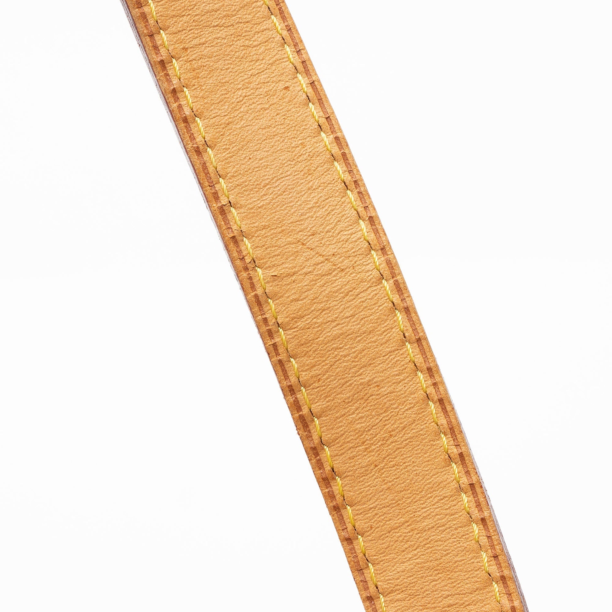 Condition Notes: Darkening, marks, and scuffs to exterior bottom corner piping. Light darkening and marks throughout exterior leather trim and shoulder straps. Surface scratches to hardware. Light marks throughout interior.