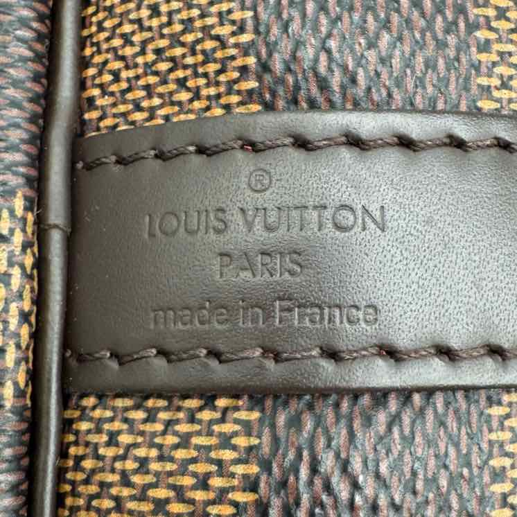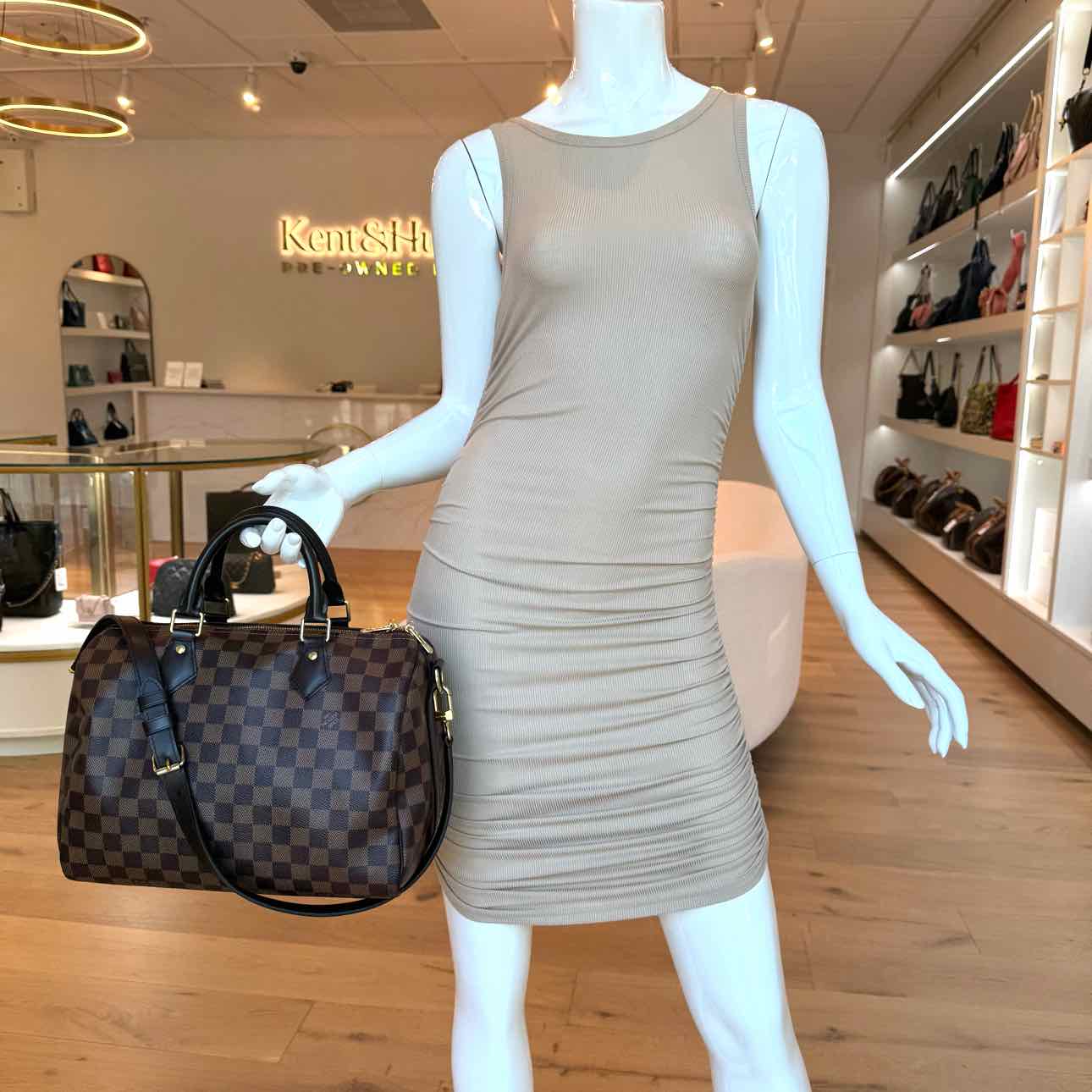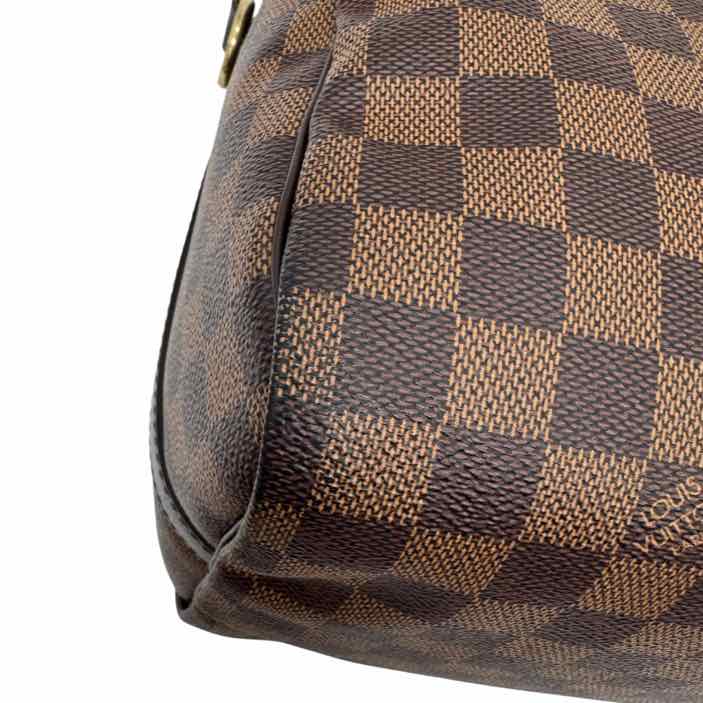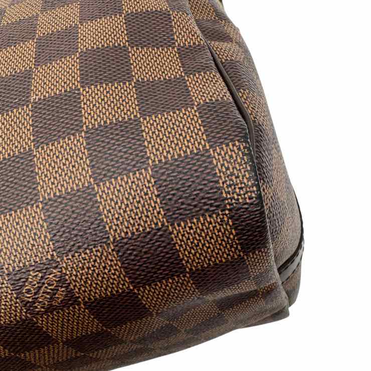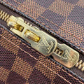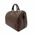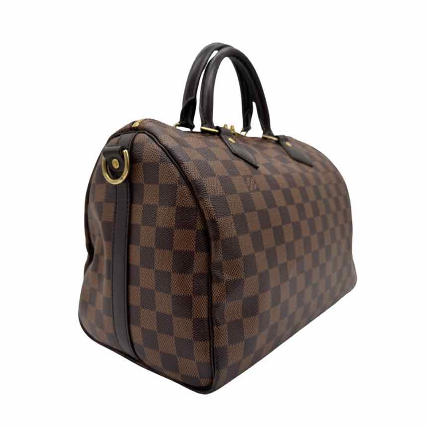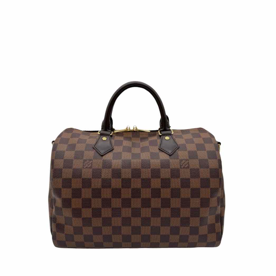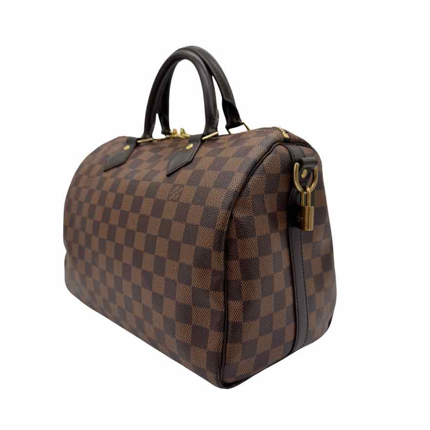 This authentic pre-owned Louis Vuitton Damier Ebene Speedy 30 features: damier ebene coated canvas exterior, fabric lined interior, gold-color hardware, double zip closure, rolled top handles for hand carry, optional adjustable shoulder strap, and interior zip pocket.