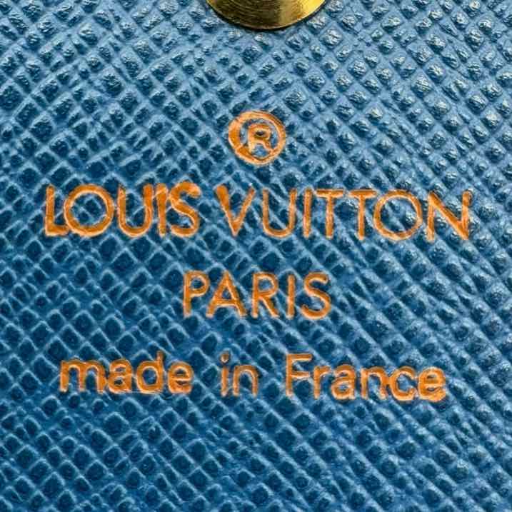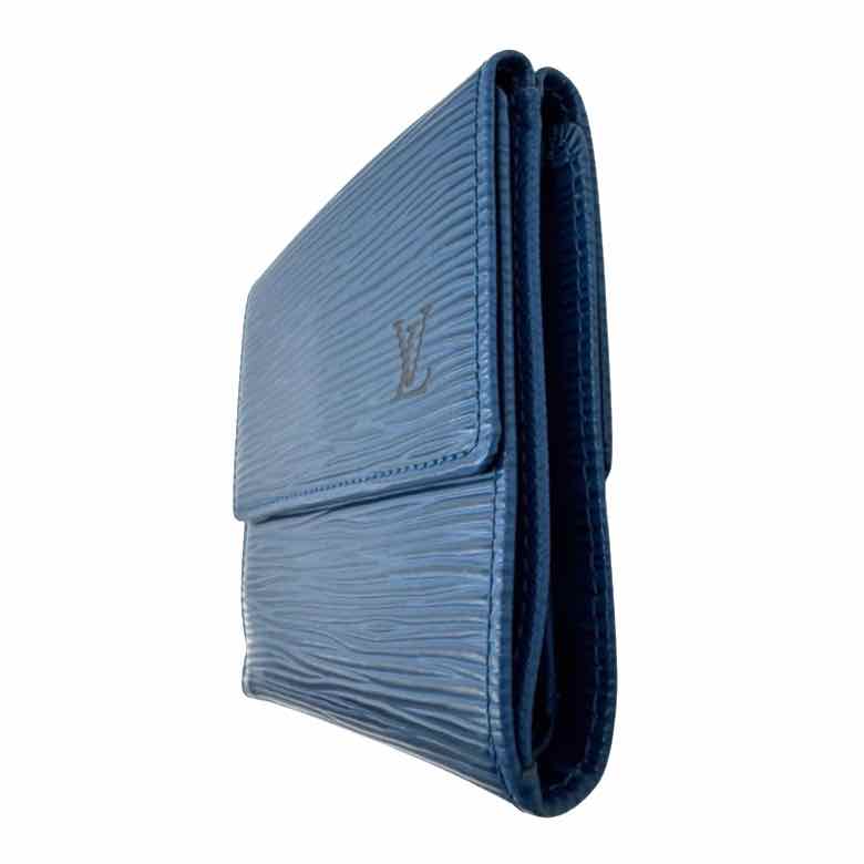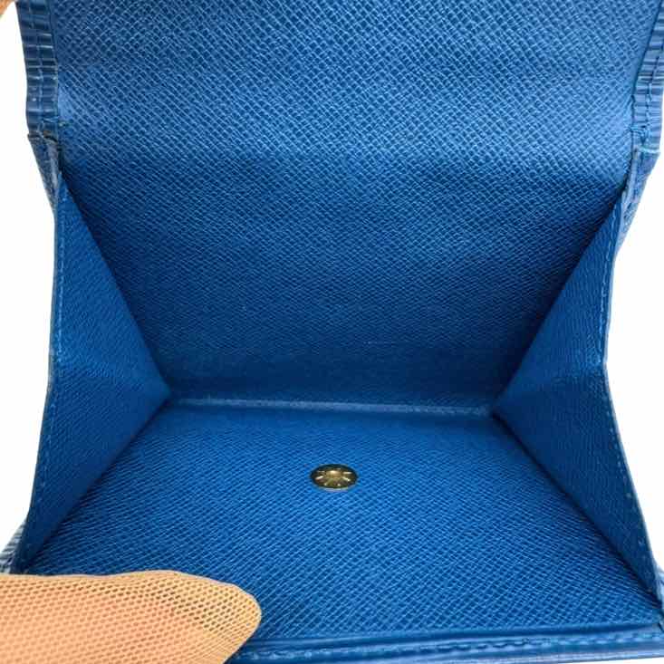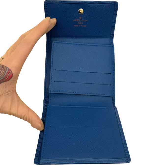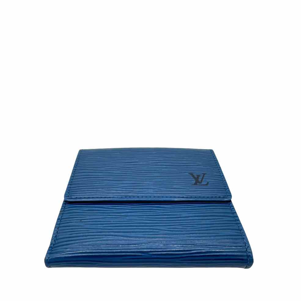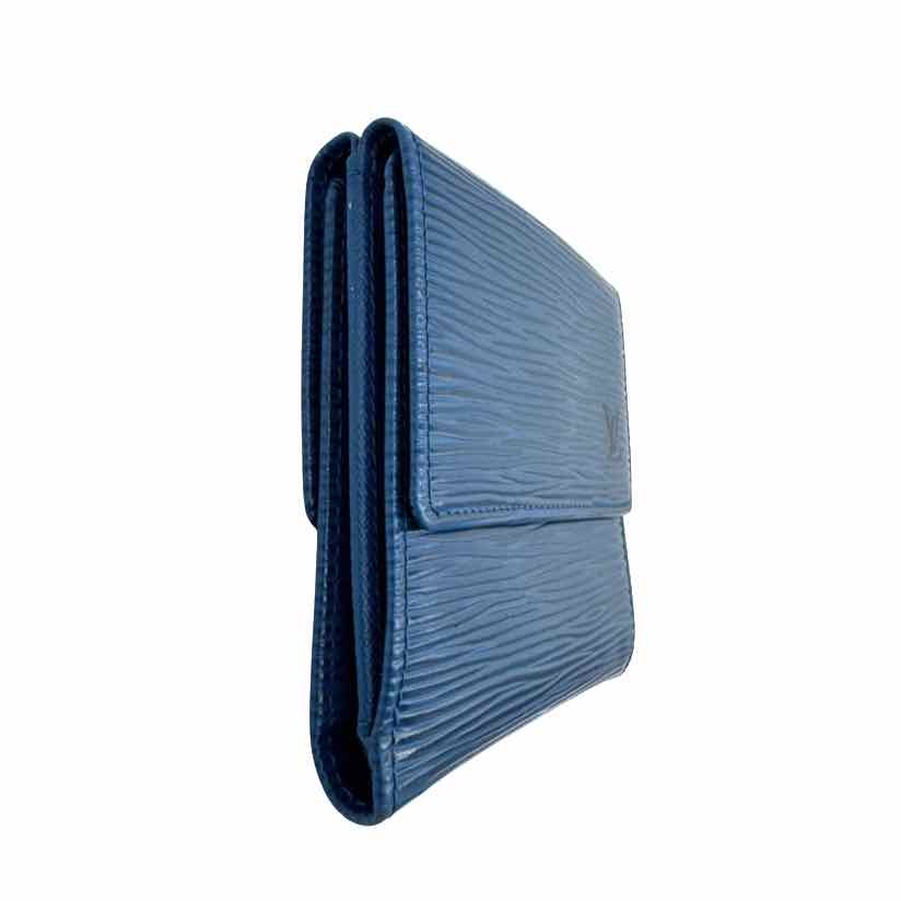 This authentic pre-owned Louis Vuitton Epi Leather Compact Wallet in blue features: epi leather exterior, leather interior, snap closure, interior flying pocket, interior bill pocket, interior coin compartment, 2 interior flat pockets, and 4 card slots.