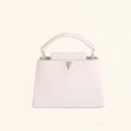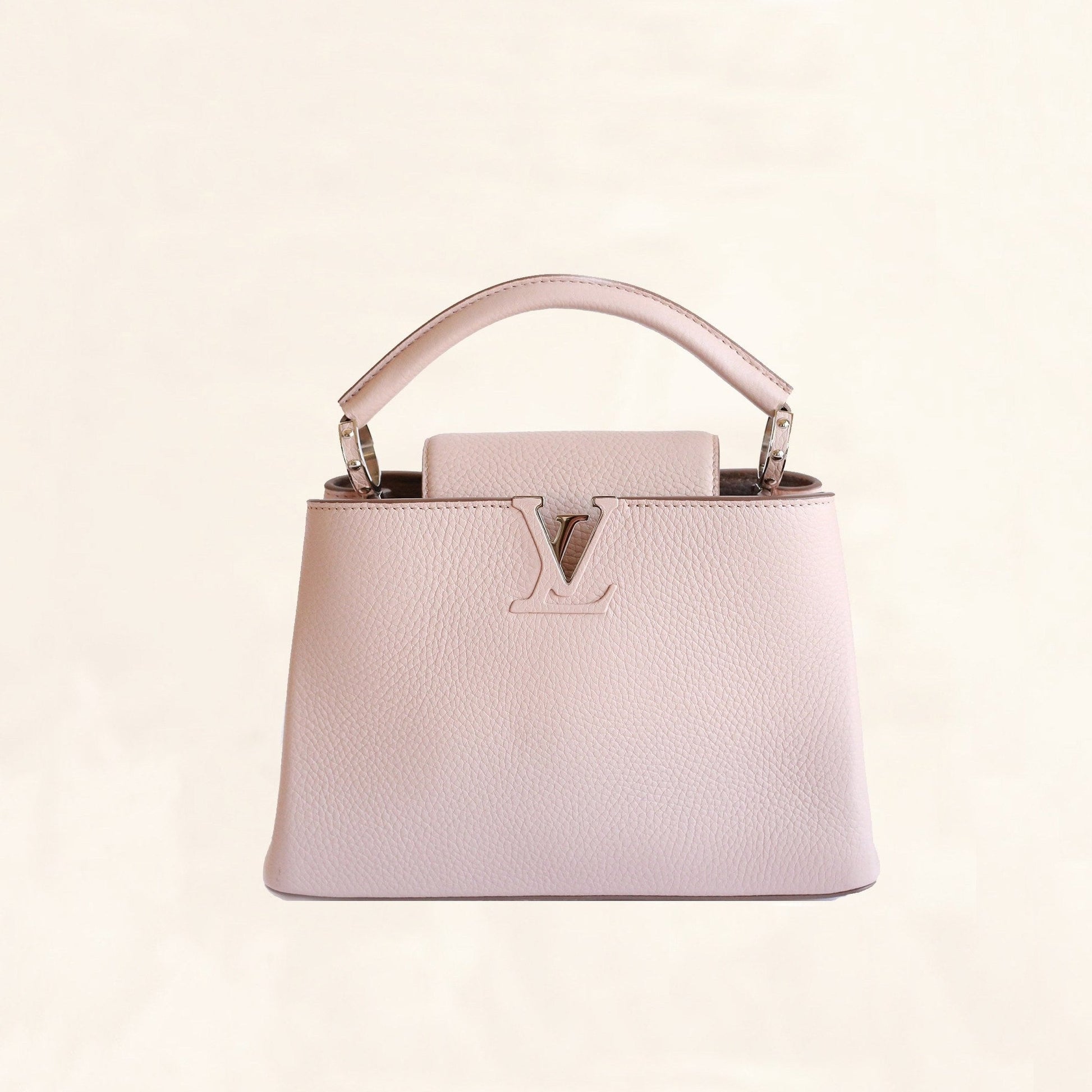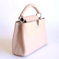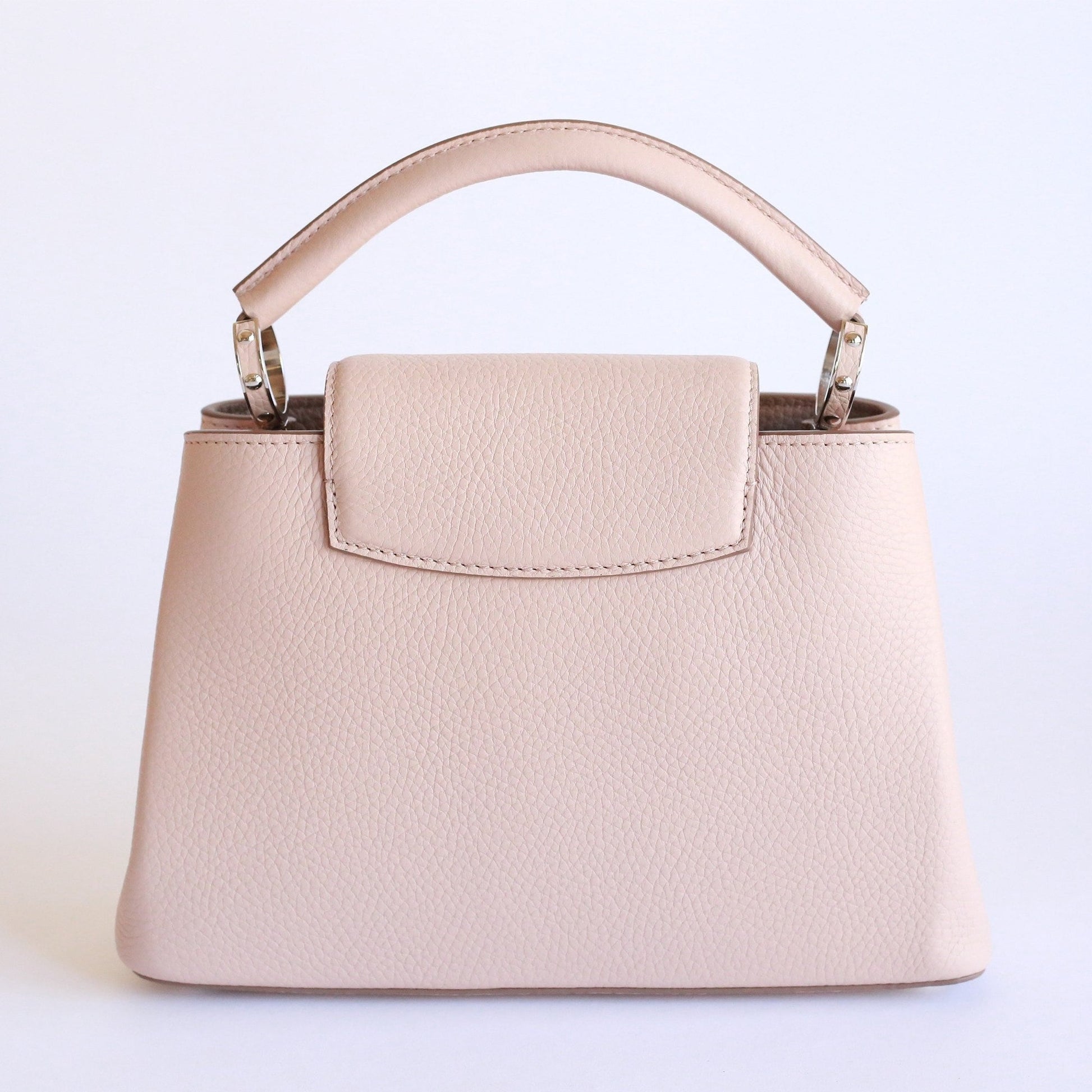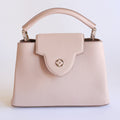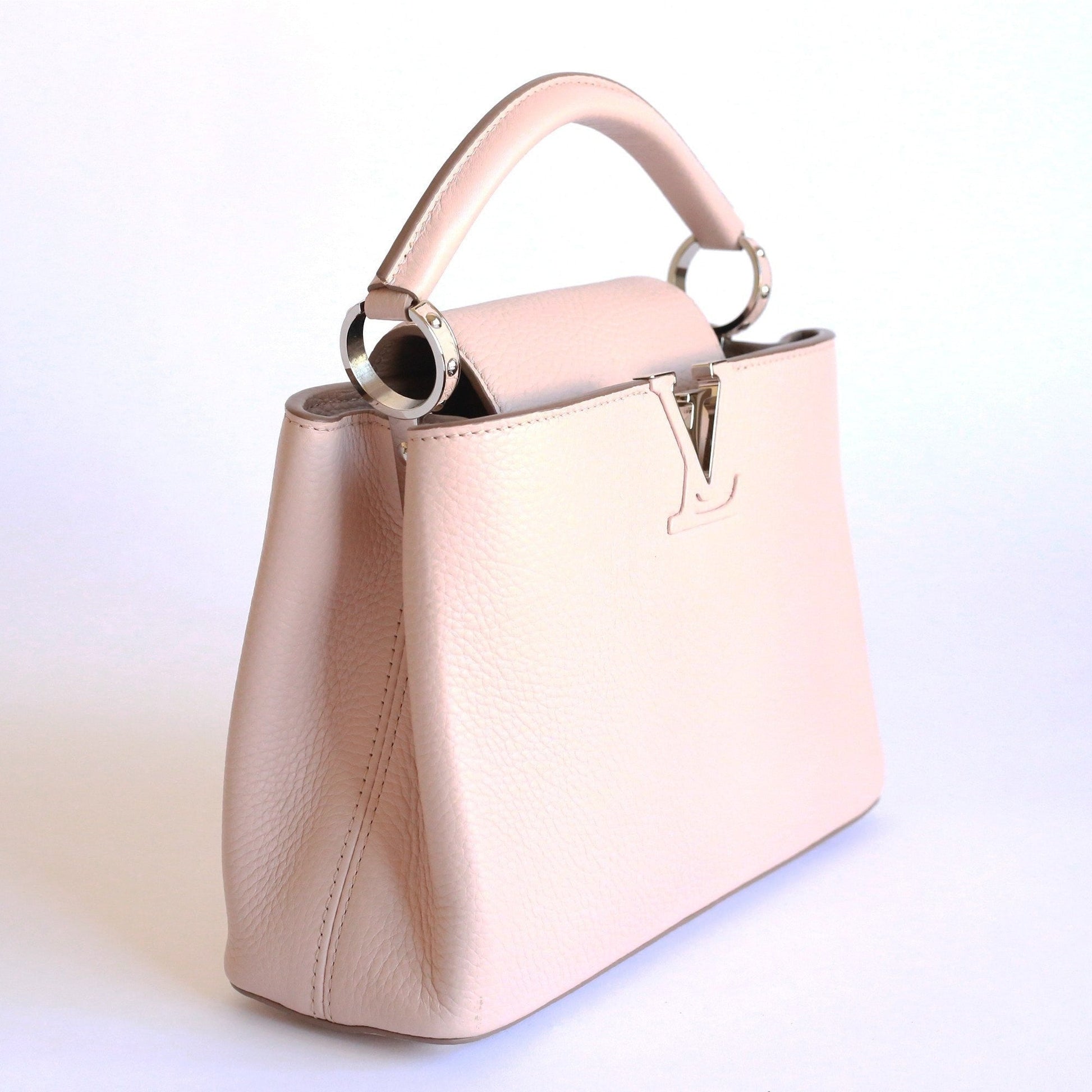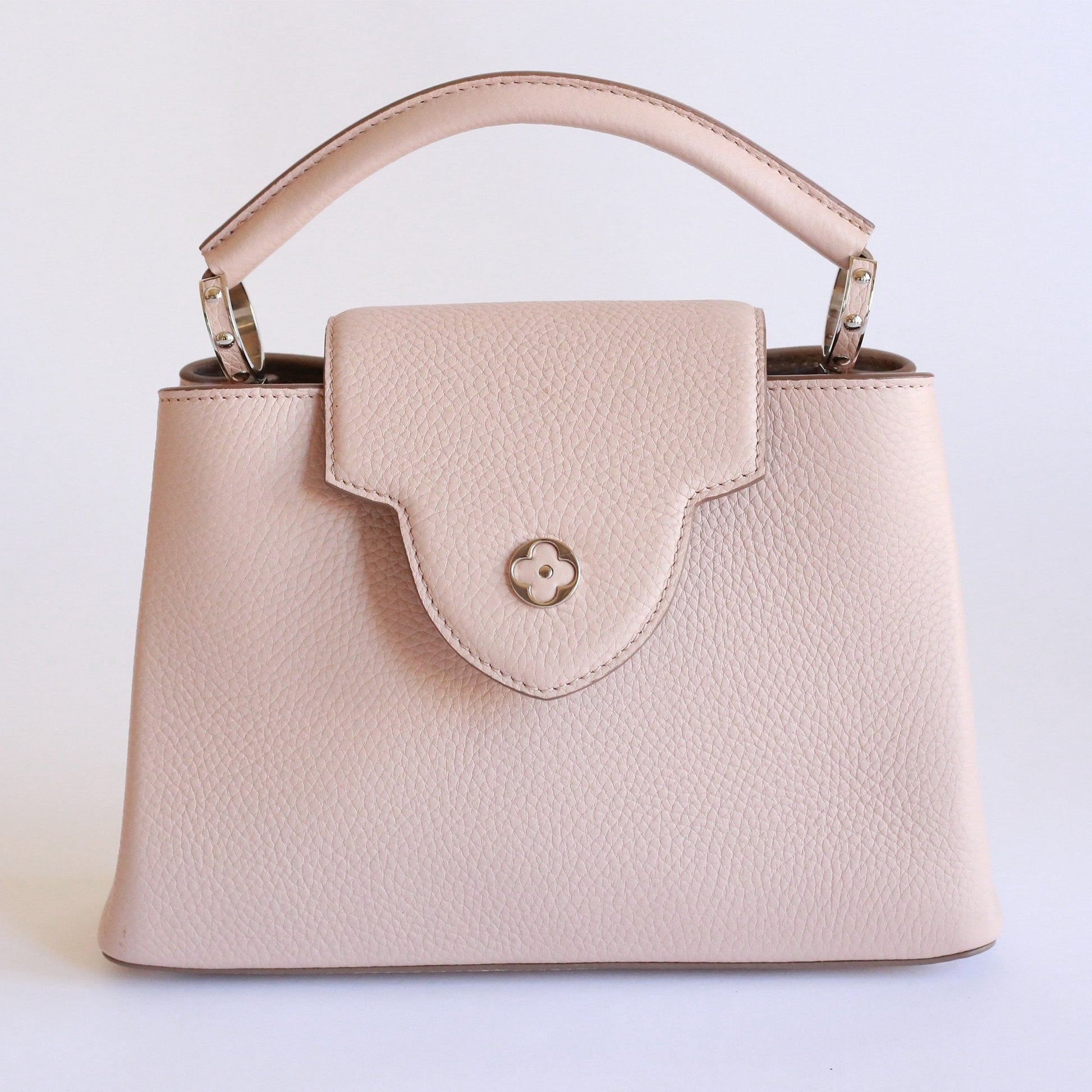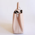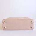 Characteristics: This piece is made of beautiful full grain taurillon leather in a blush/beige. It features a looping leather handle strap with silver ring handle links and a small cross-over flap that has a monogram flour in silver. The flap opens to a portioned leather interior.