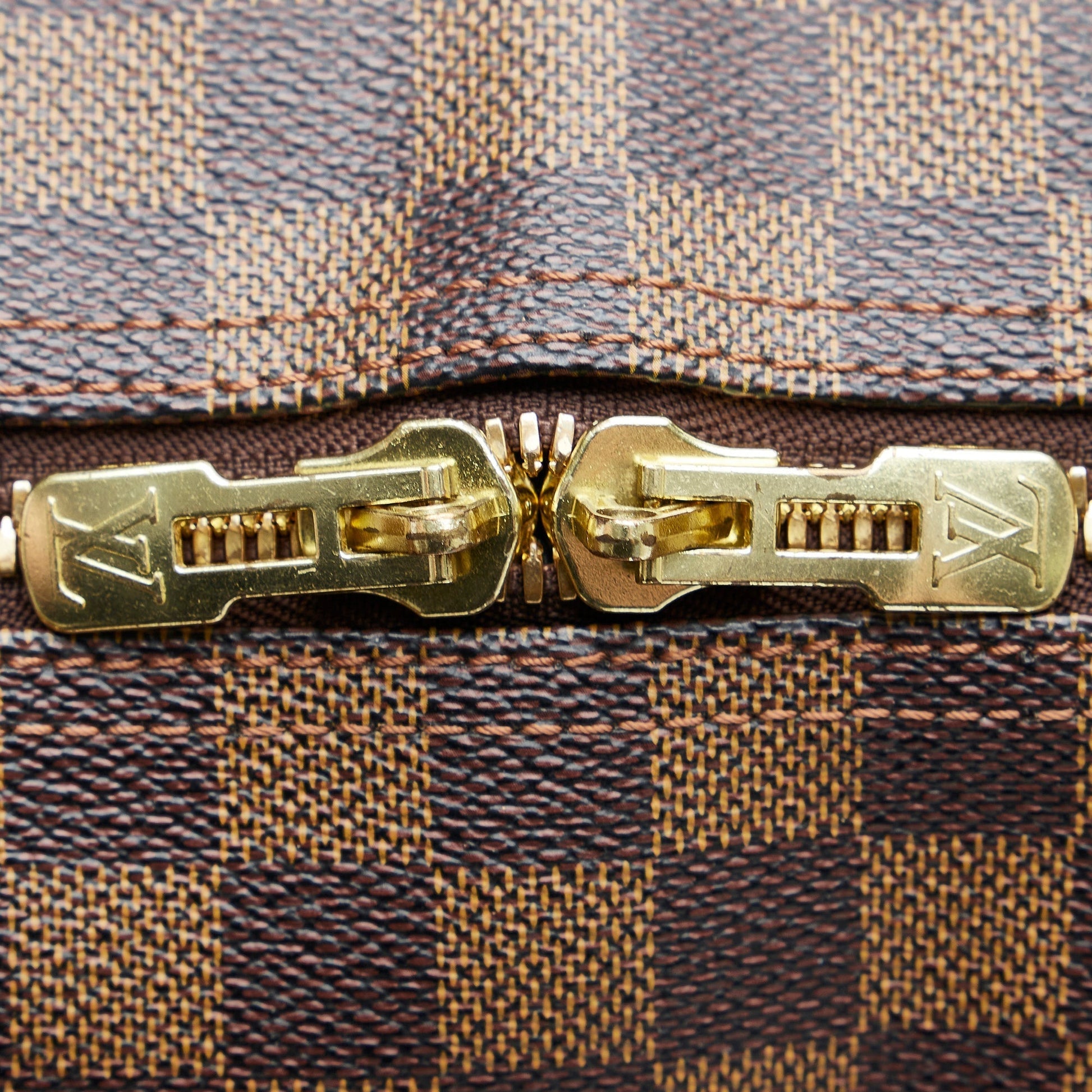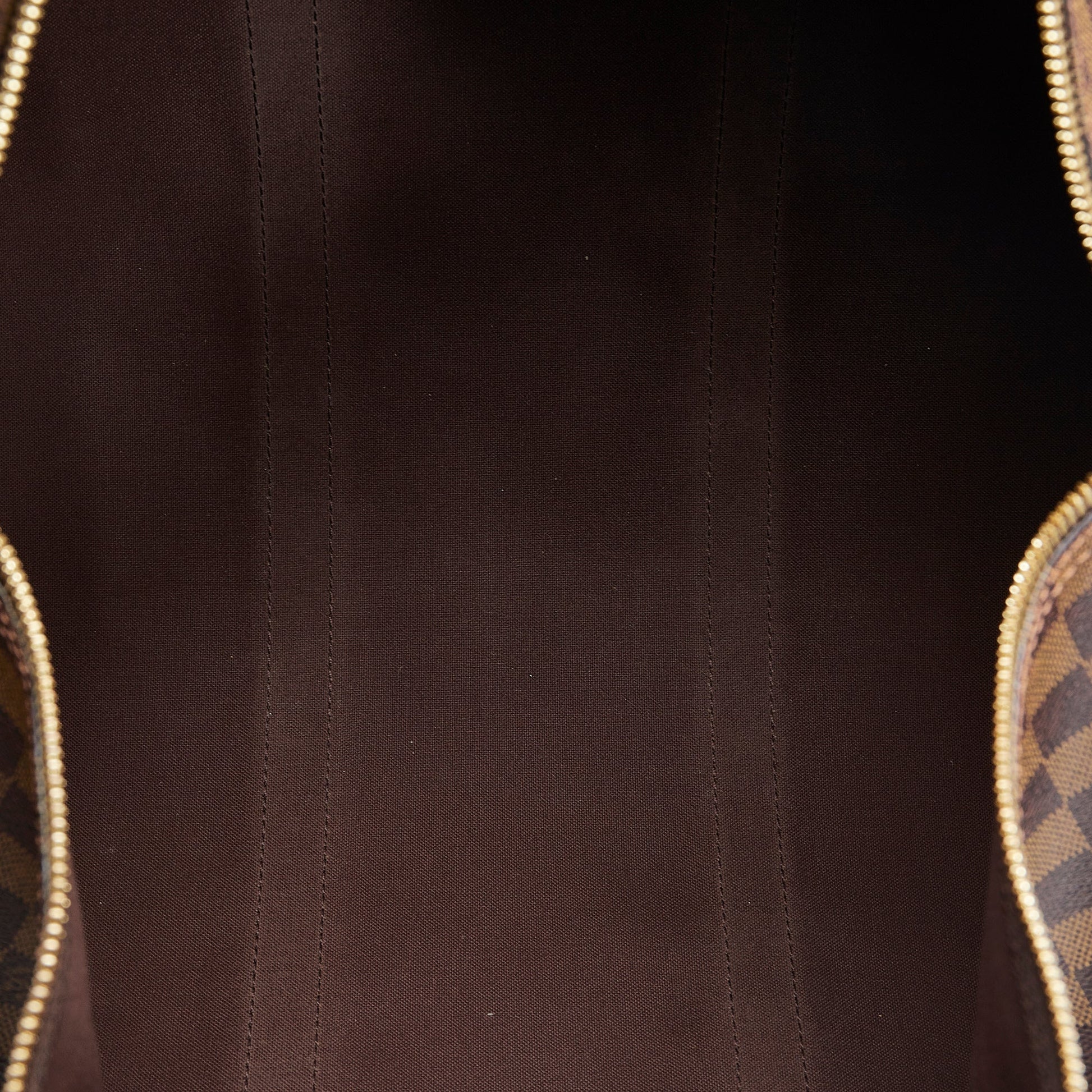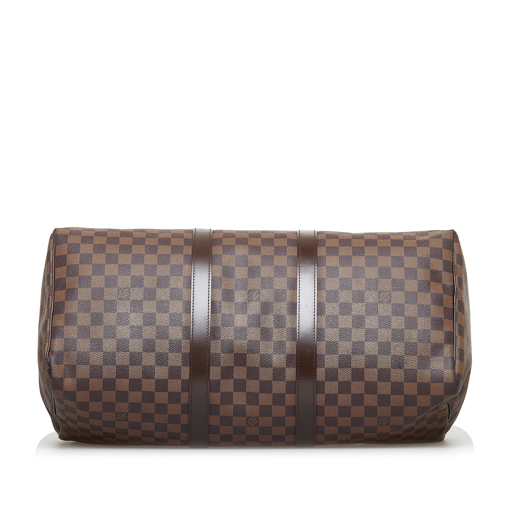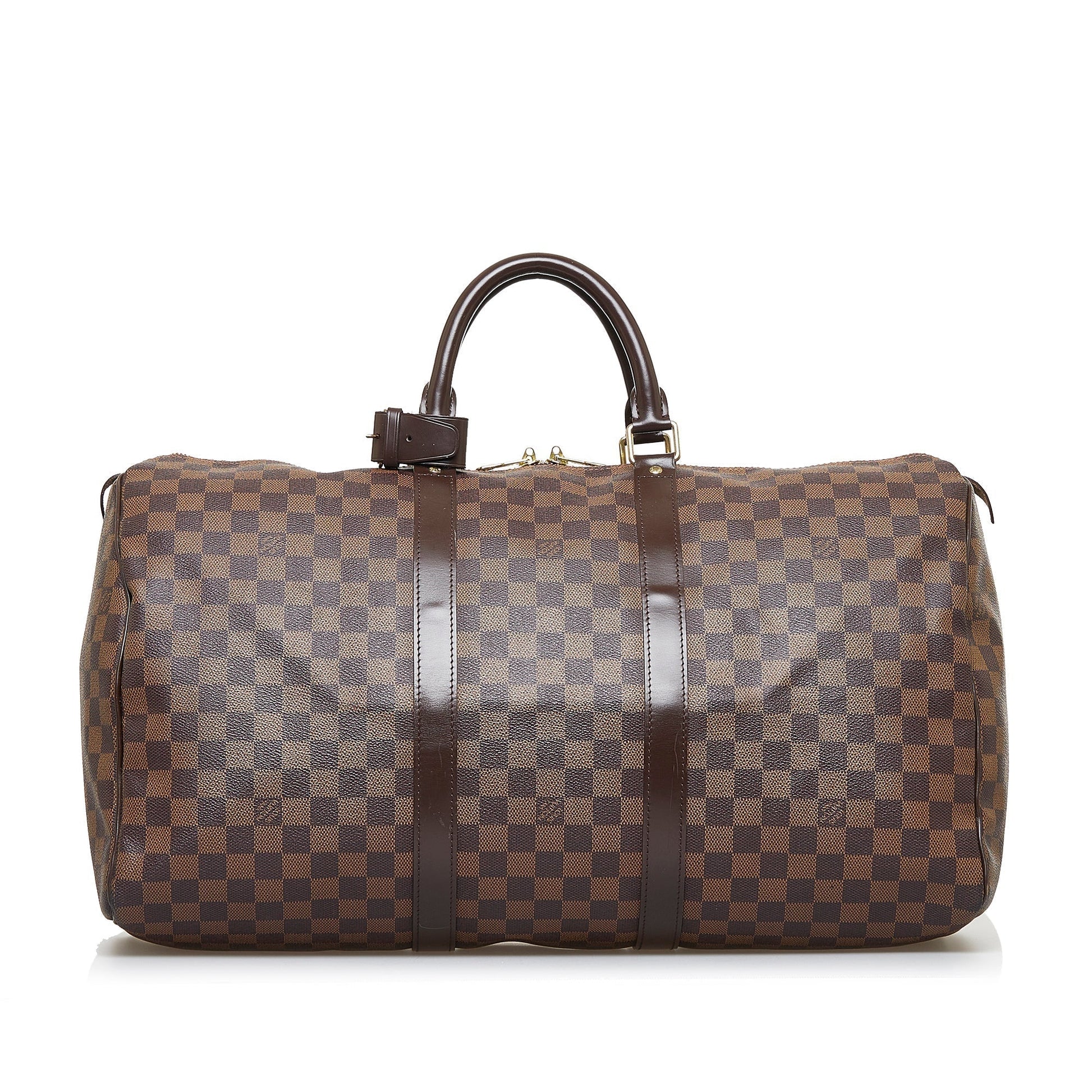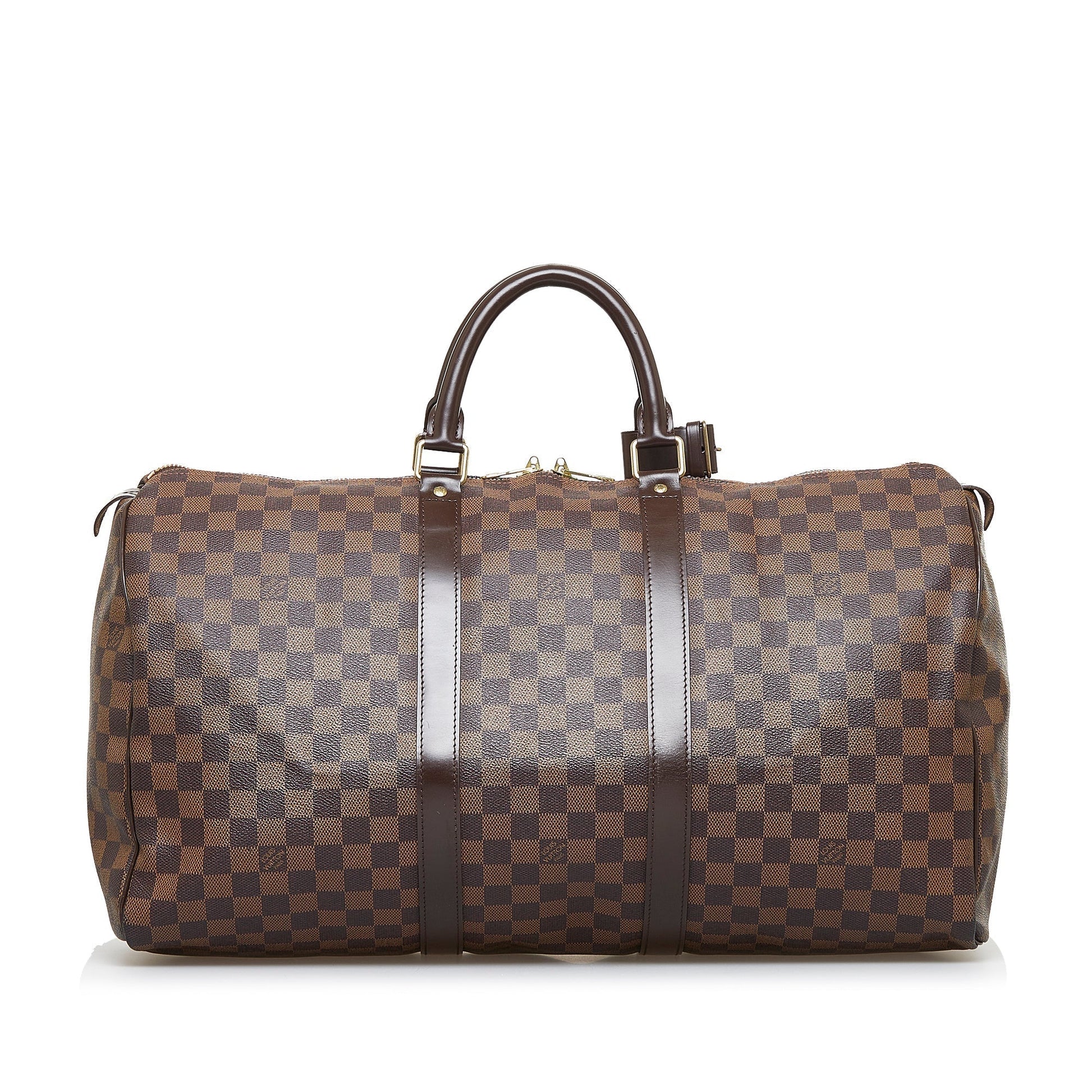 The stunning Louis Vuitton Keepall 50 features the signature chocolate brown Damier Ebène canvas with leather trim, rolled leather handles and a top zipper closure.