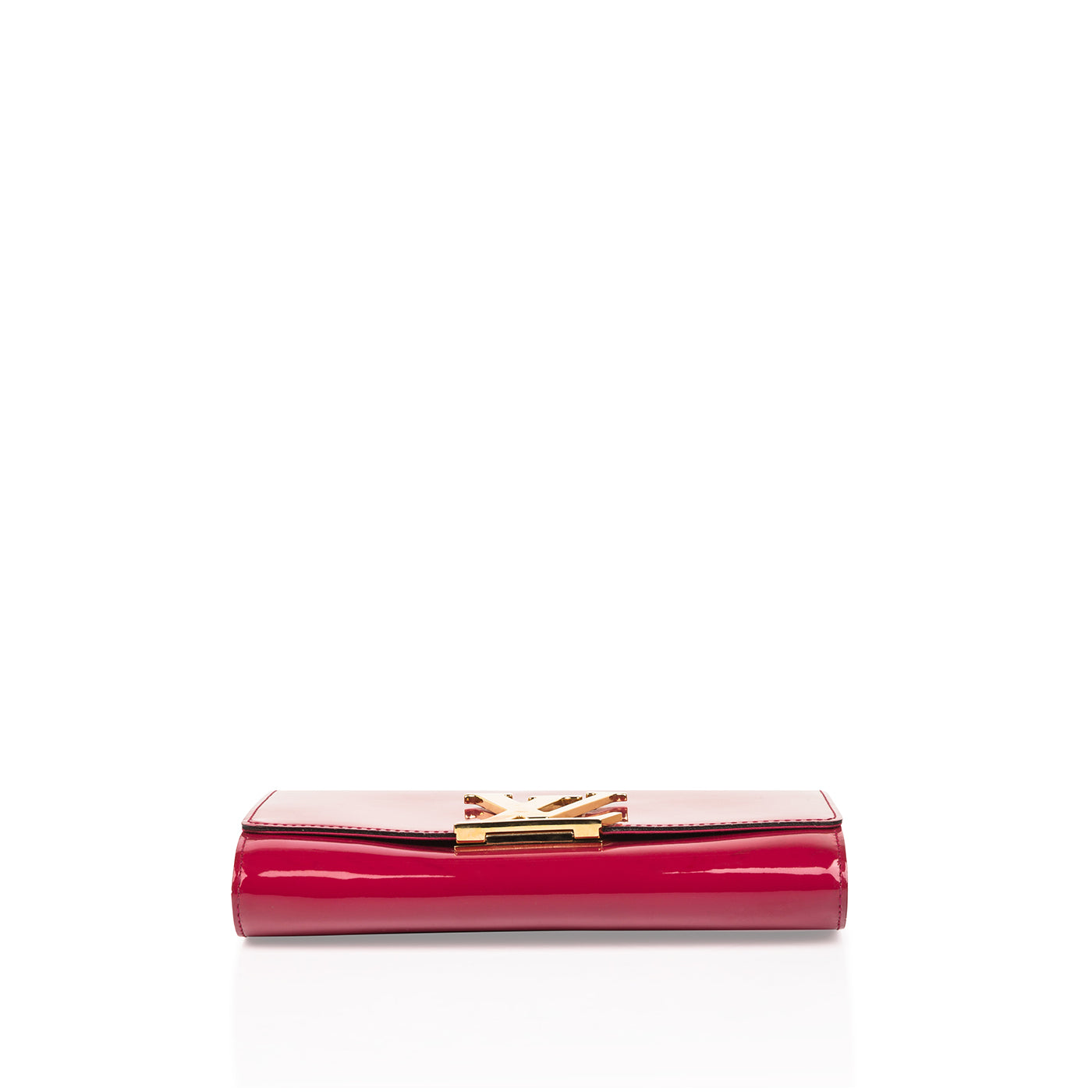 This striking Louis Vuitton Louise Clutch Patent MM presented in the brand's 2013 Collection, is the perfect addition to your evening wardrobe. Crafted in striking magenta glossy patent calfskin, this modern yet feminine clutch features an oversized LV logo flip lock clasp closure. It opens to a matching leather interior with multiple card slots, side zip and slip pockets storing bare essentials. No doubt a statement accessory for all fashionistas.