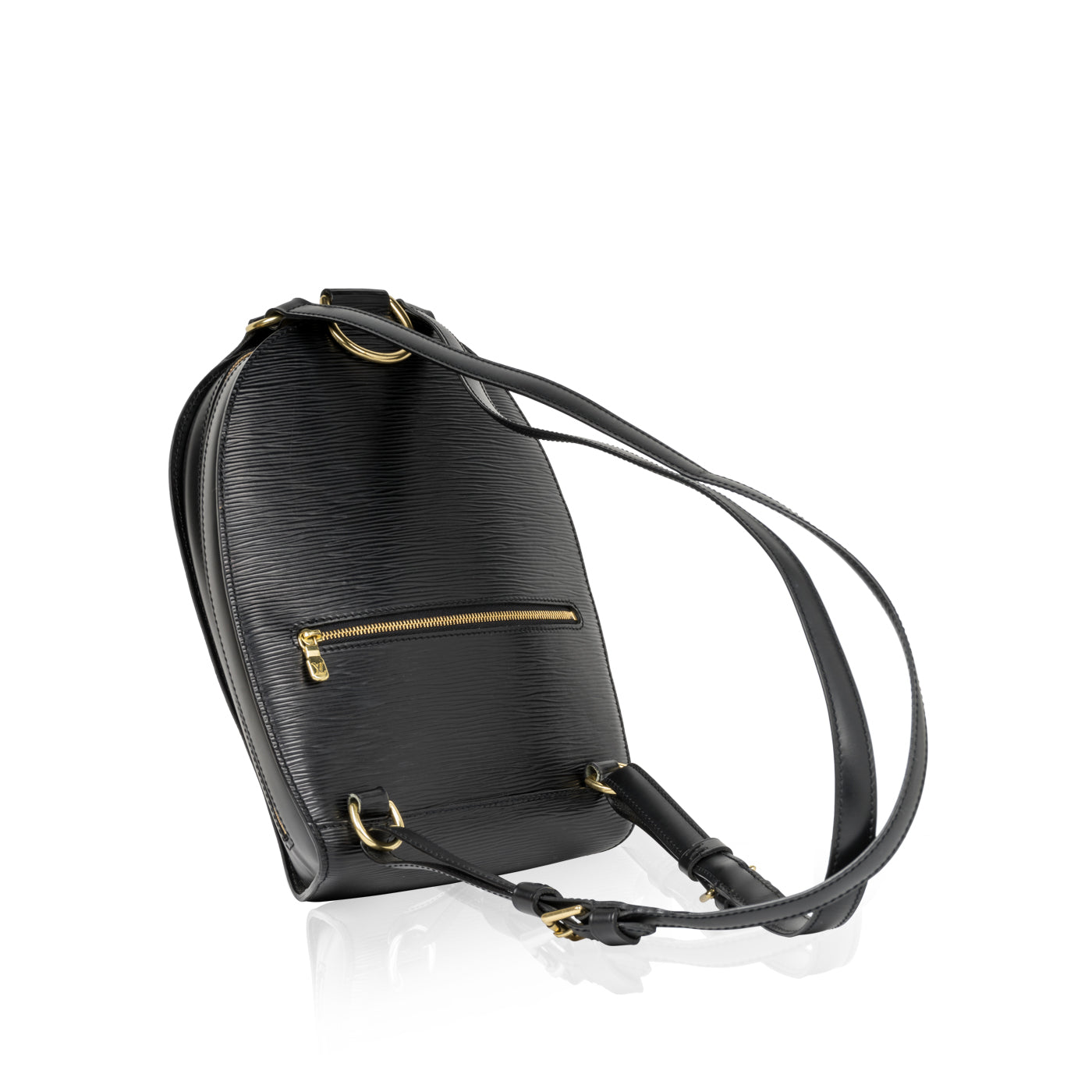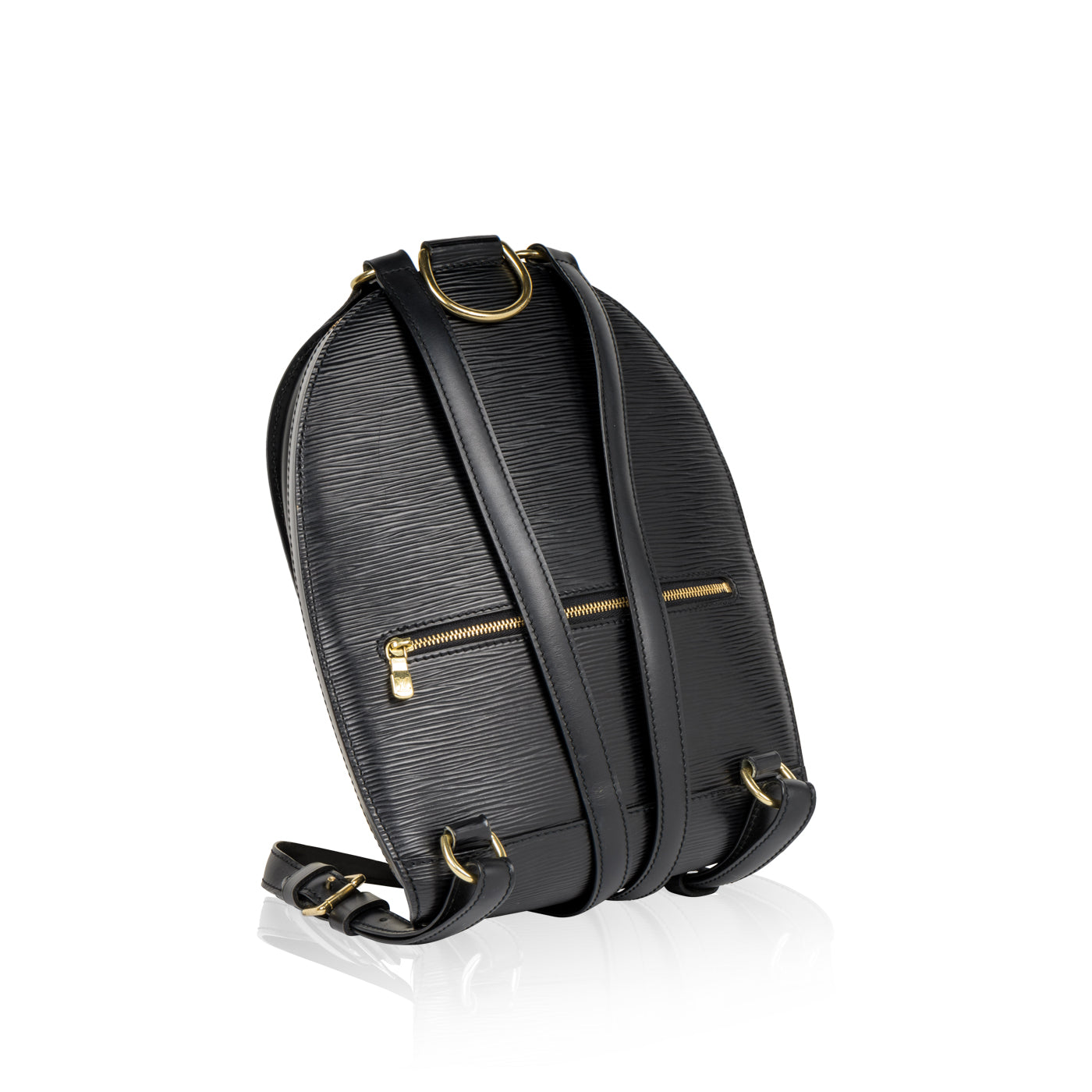The Louis Vuitton Mabillion backpack in black Epi Leather screams ‘cool girl’ with its sleek exterior and gold tone metal hardware. This is the perfect everyday bag for a low key city girl. This bag features adjustable straps, an exterior zip pocket, and a zip closure.