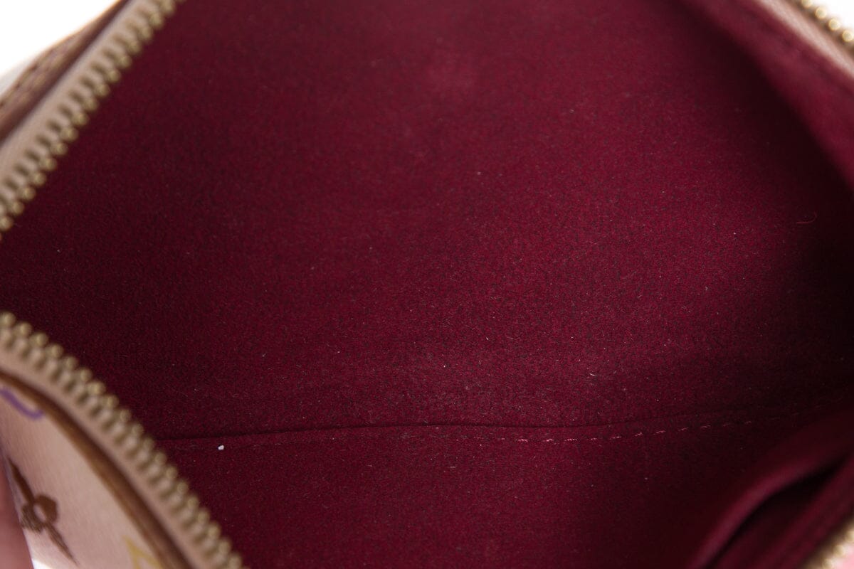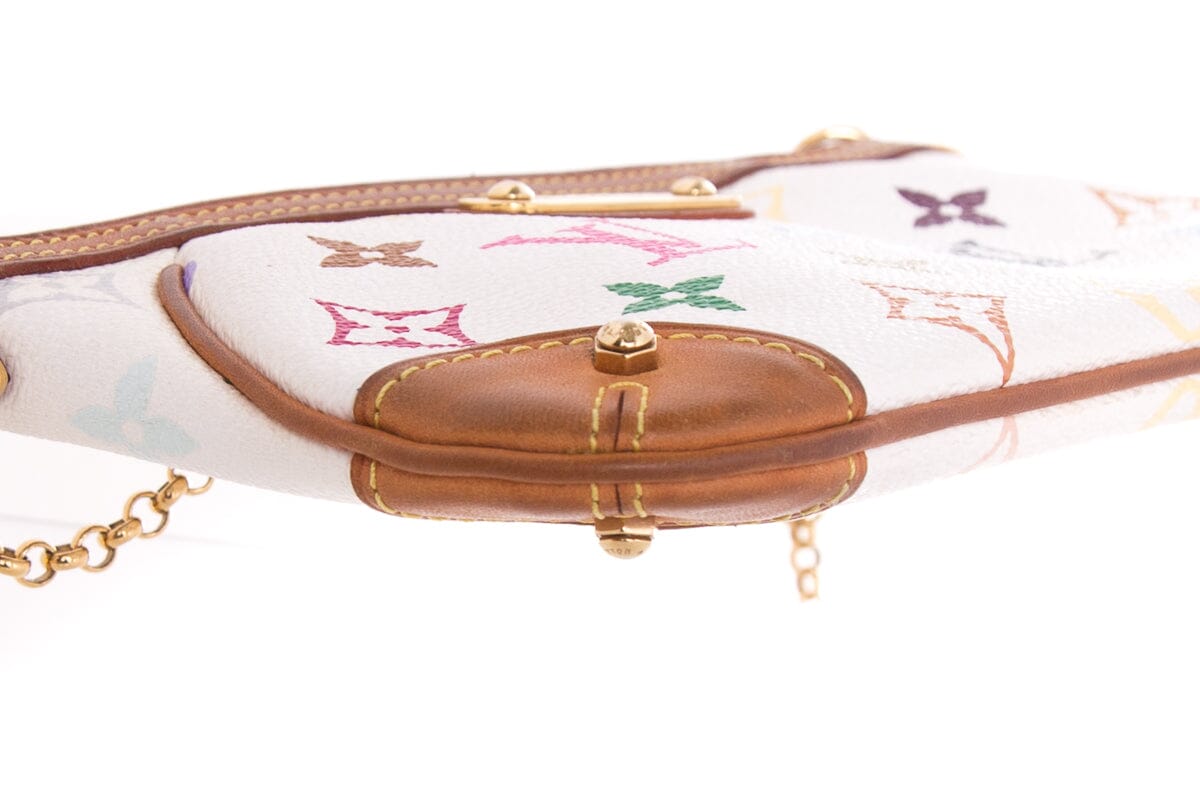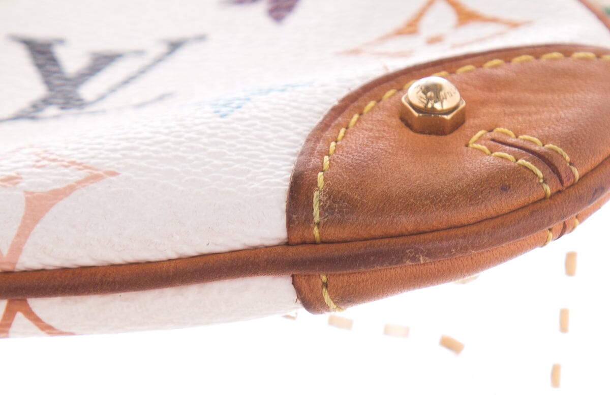 Louis Vuitton MILLA PM White Multicolor Monogram Pouchette With Gold tone Hardware. This item is in good condition; some discoloring throughout leather details.