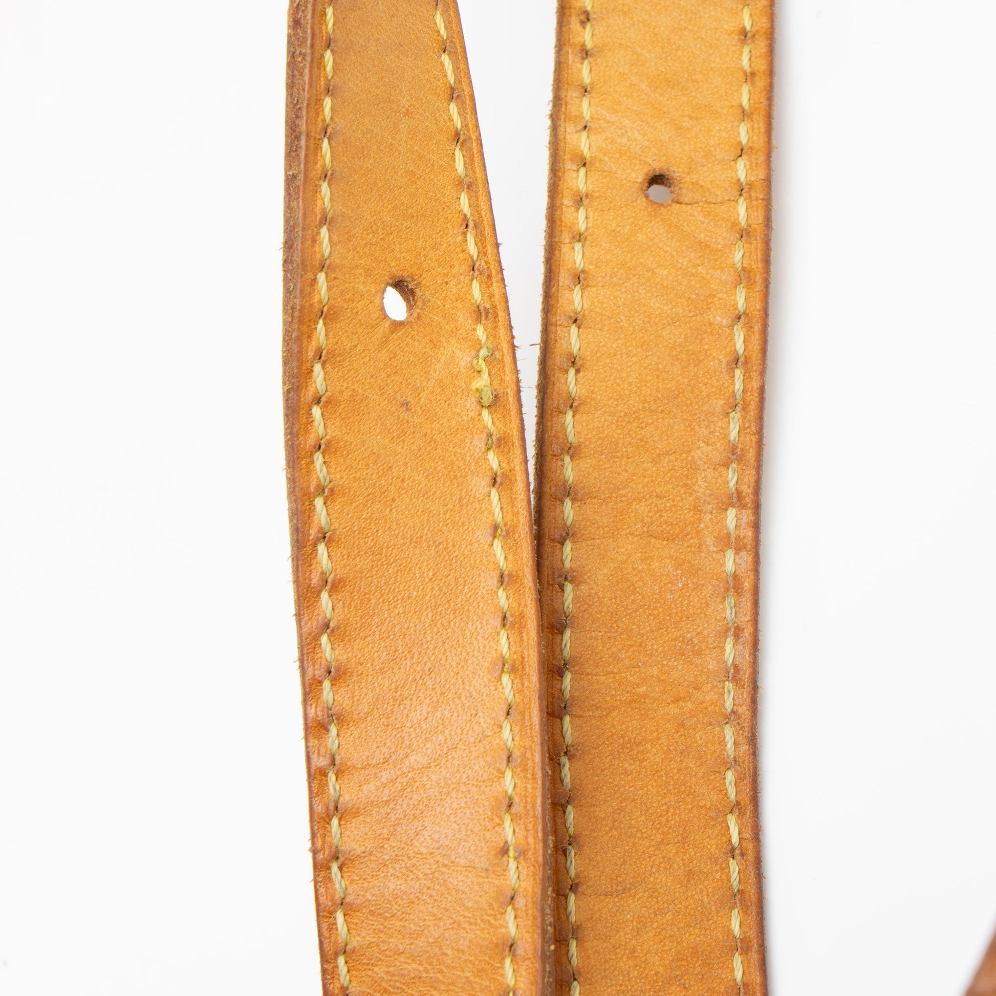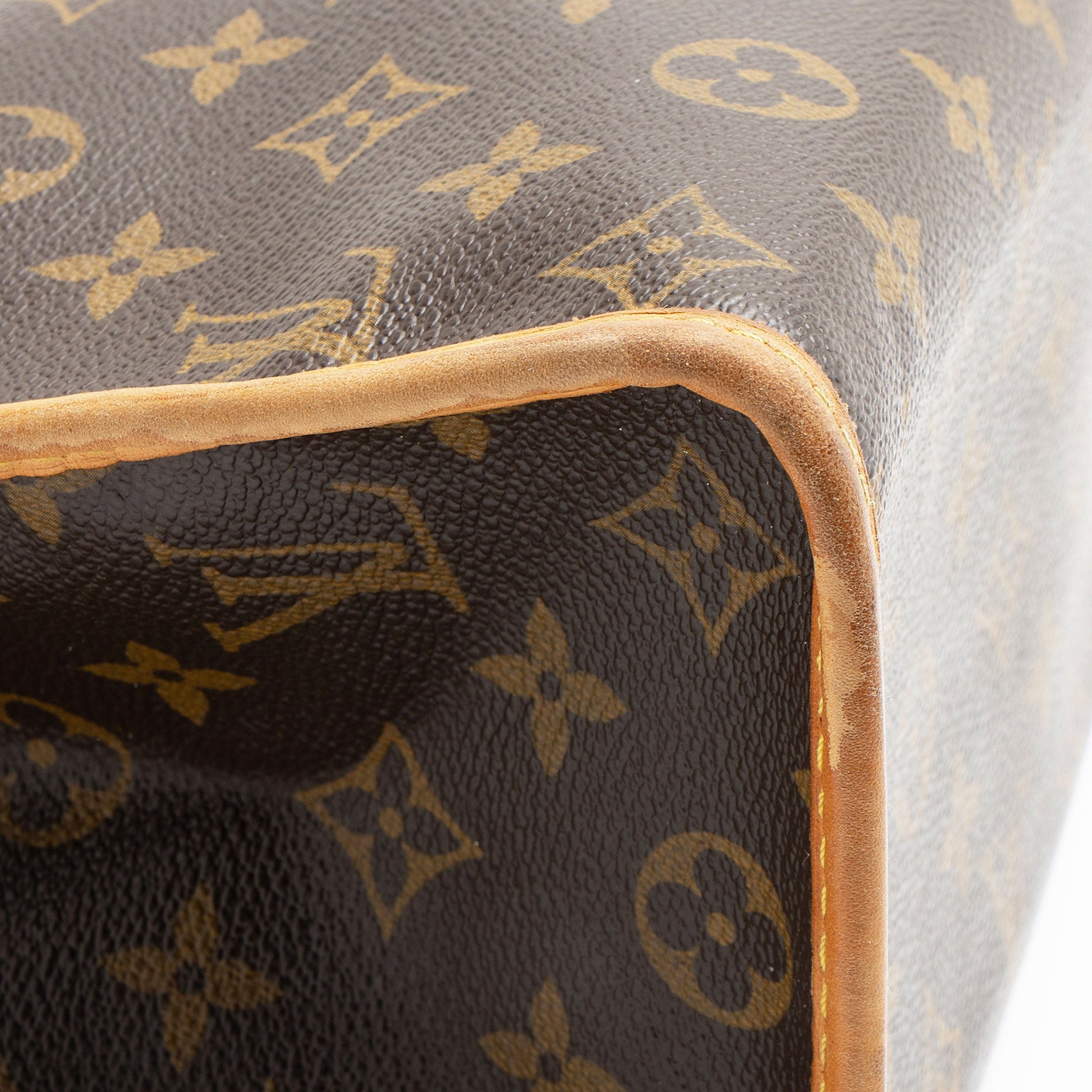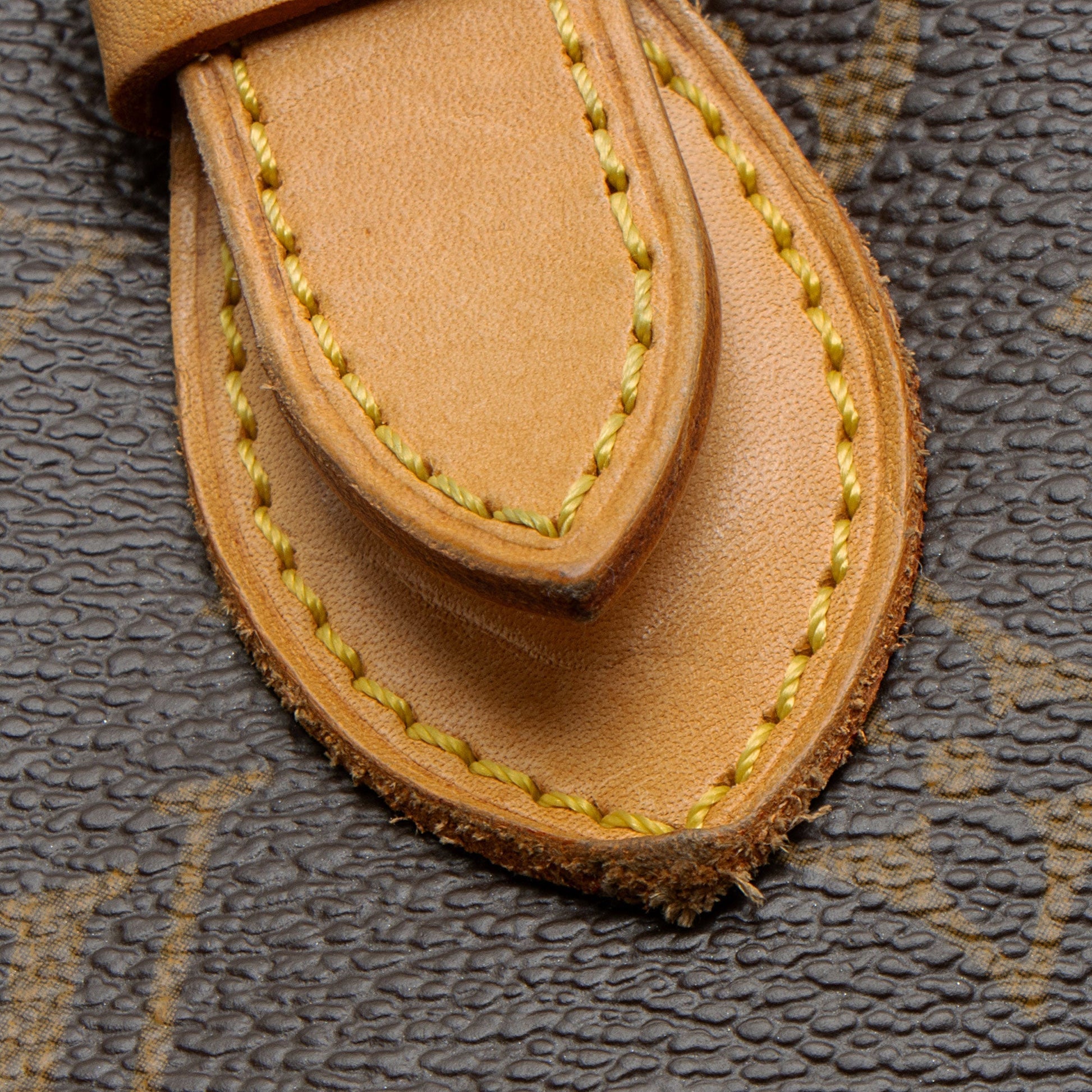 Condition Notes: Heavy darkening, marks, and scuffs throughout exterior leather trim. Heavy darkening, creasing, and wear throughout handles. Visible wear throughout handle casing. Surface scratches and tarnishing to hardware. Marks and wear throughout interior.