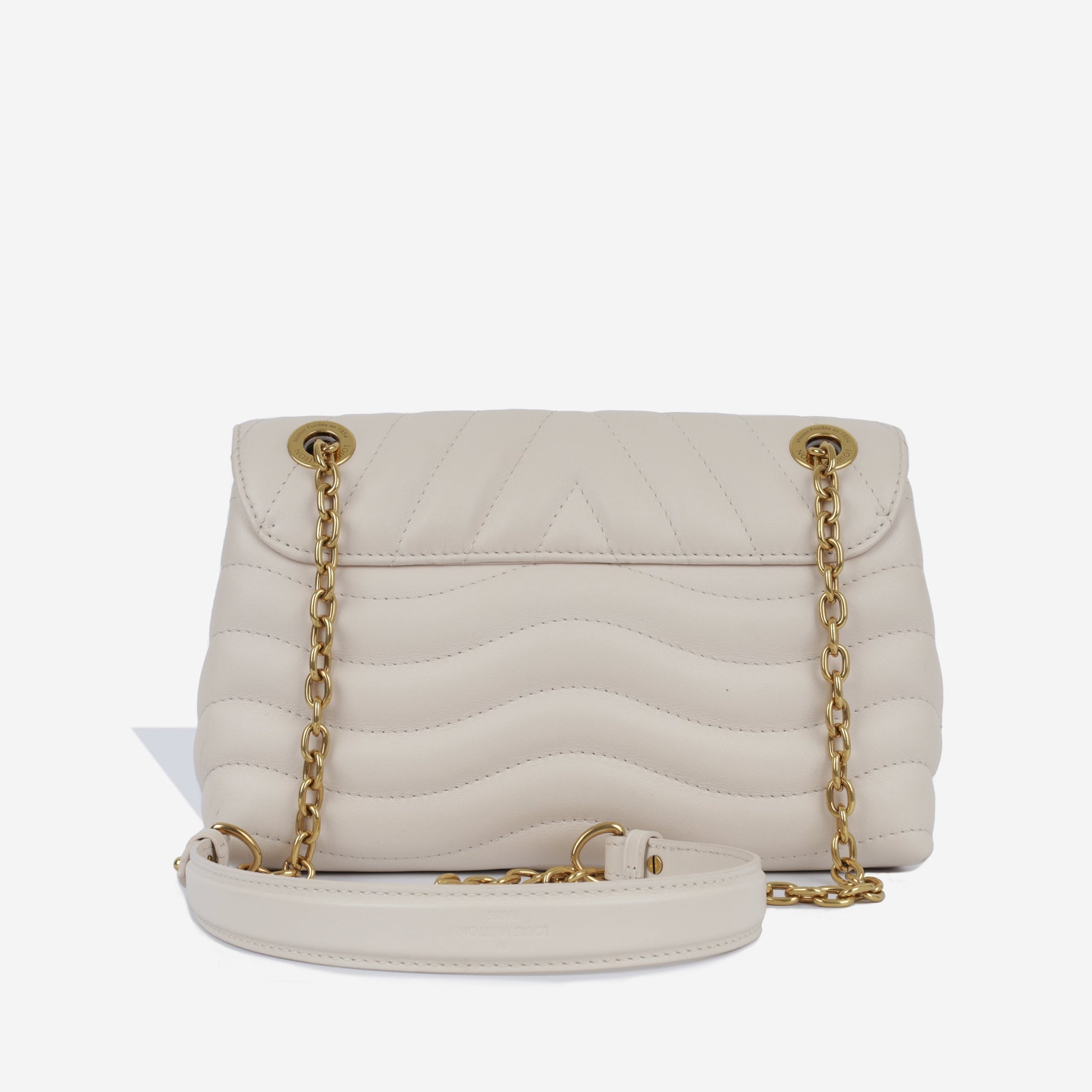 Louis Vuitton presents this New Wave Chain Bag, undeniably a fashion statement piece for your wardrobe, for its seasonal collections. The bag is crafted from smooth quilted calfskin and features a sliding vintage metal chain. A statement LV logo completes the bag.