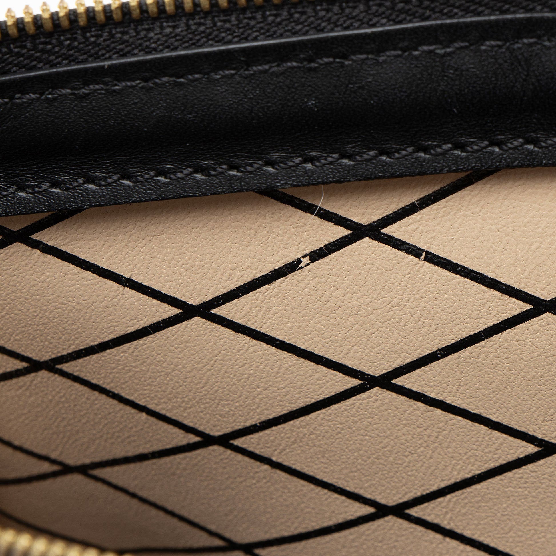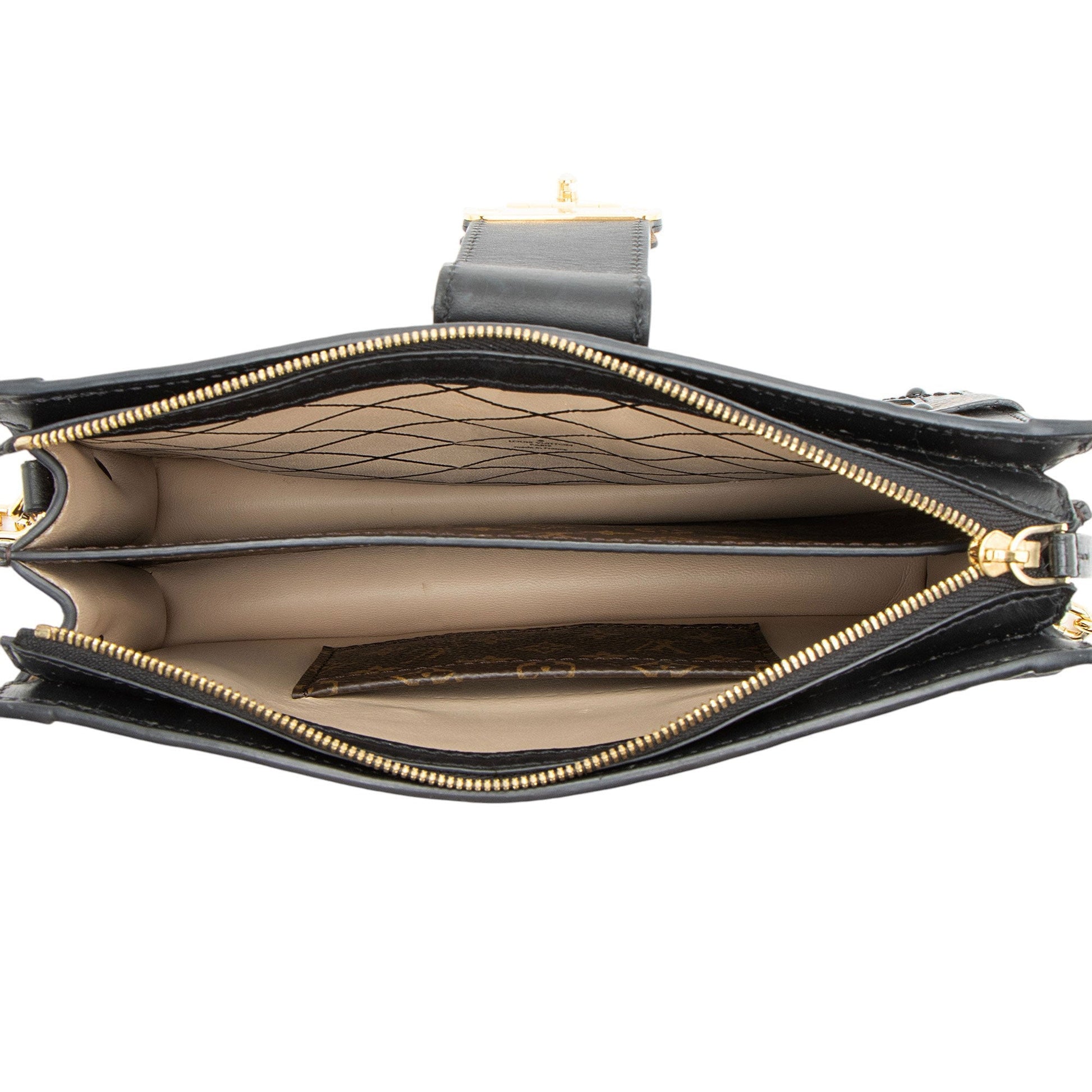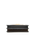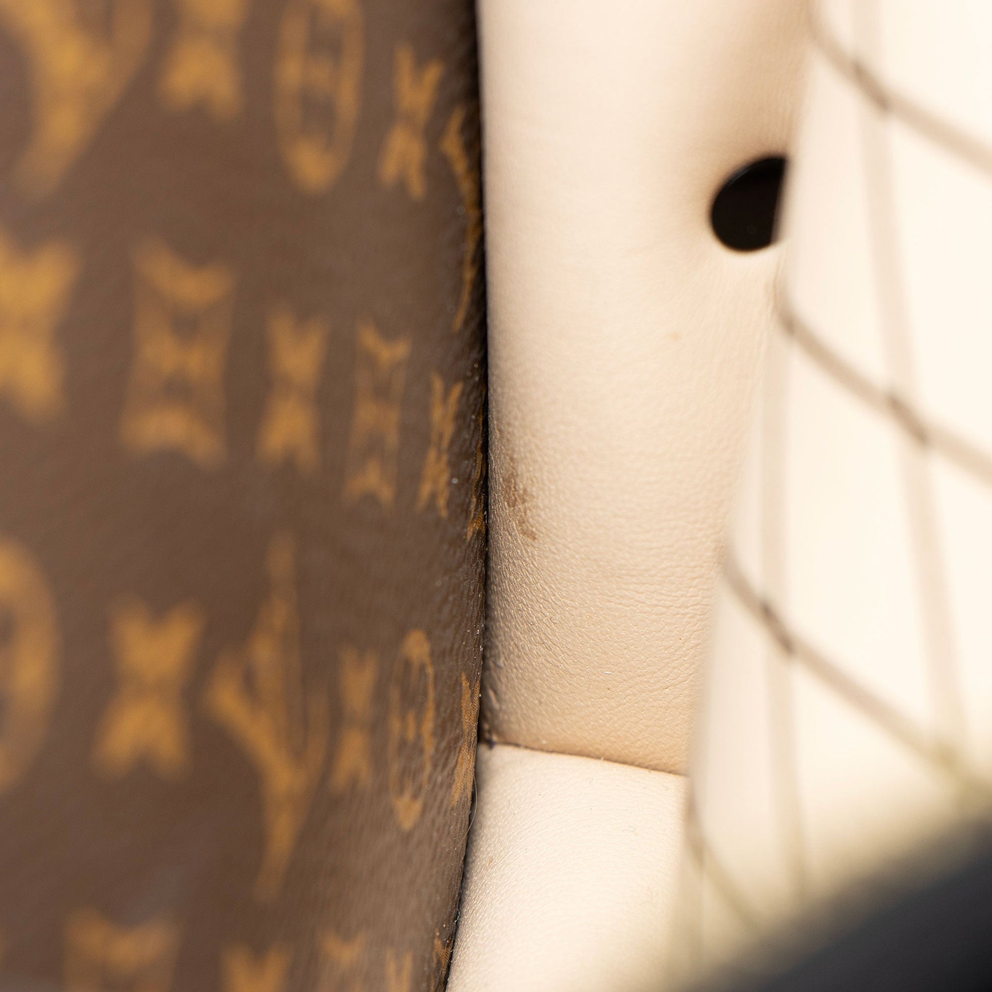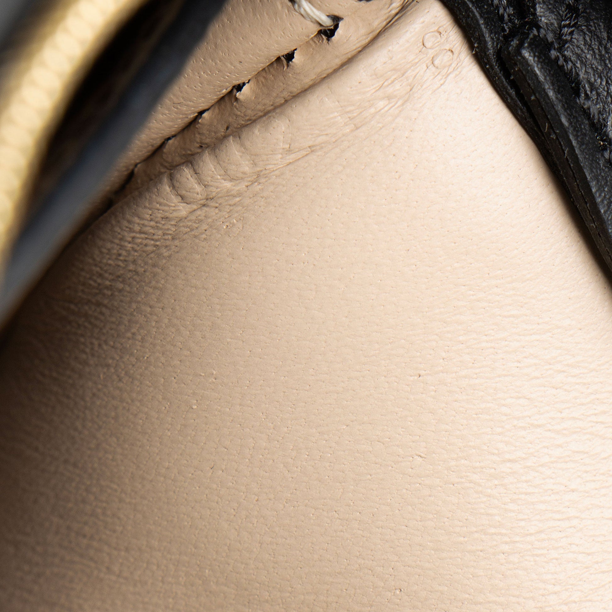 Condition Notes: Minor curling to exterior bottom corners. Light scuffs and minor creasing throughout exterior leather trim. Minor warping to shoulder strap. Surface scratches to hardware. Light marks to interior.