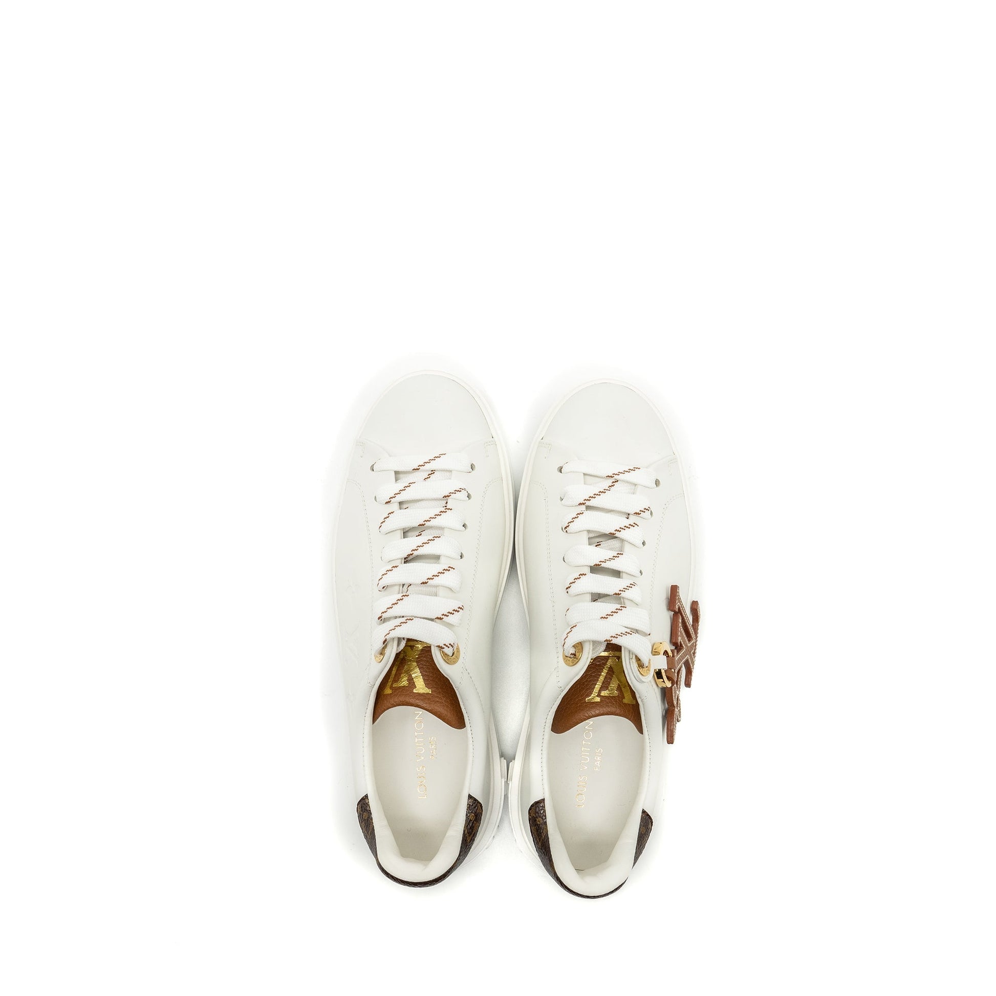 Louis Vuitton Size 37 Time Out Sneaker with Monogram and Flower Charm Calfskin White GHW