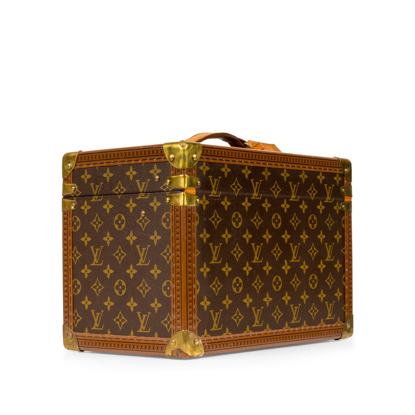 A rare piece from Louis Vuitton, this vintage vanity case is an absolute must have for any LV lover or vintage timepieces in general. Though of course it's ideal if you want to actually use it as a vanity, but we adore this piece as an interior decoration piece. Rich in history, this classic vanity is a unique accessory that you will never fall out of love with. With its signature monogram printed embossed throughout, rustic brass hardware and vintage brown LV logo trimming, this piece truly is special. Always sleek, always chic - this vanity will never go out of style.