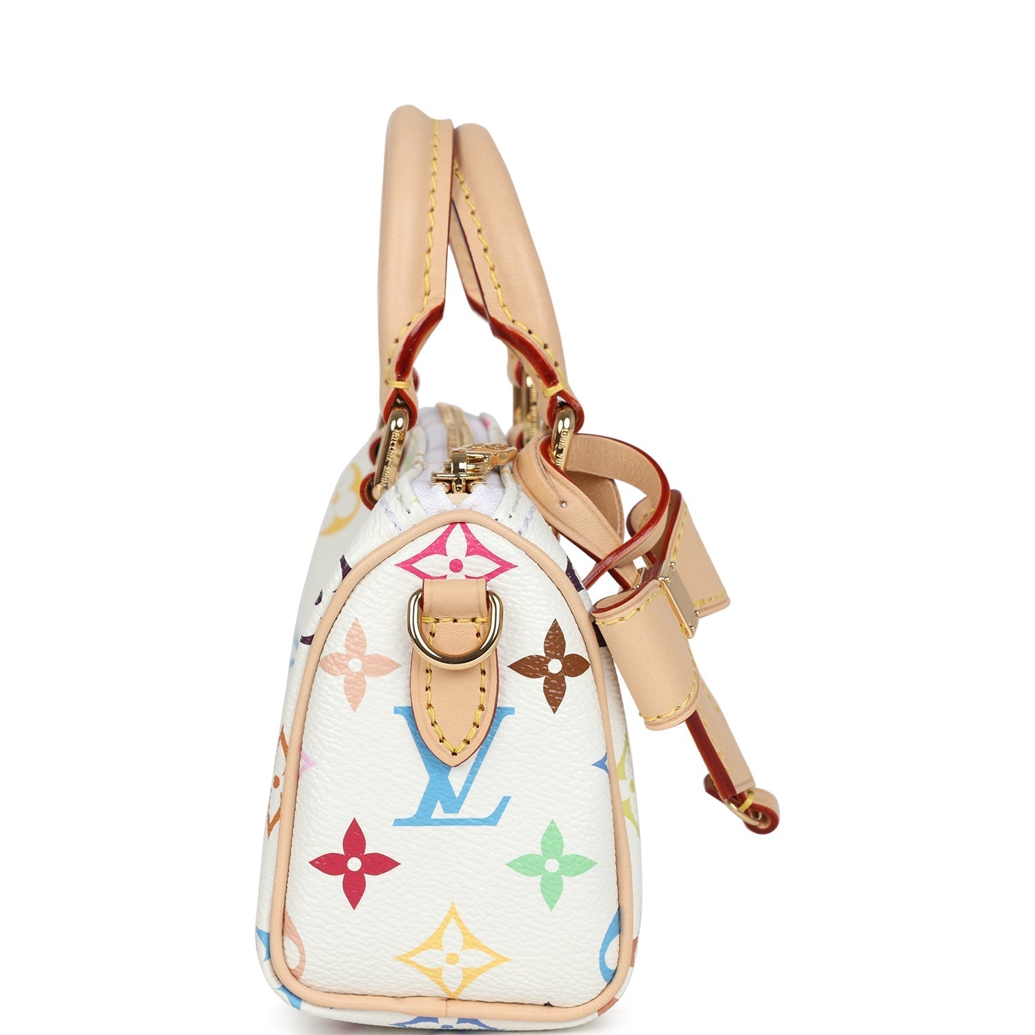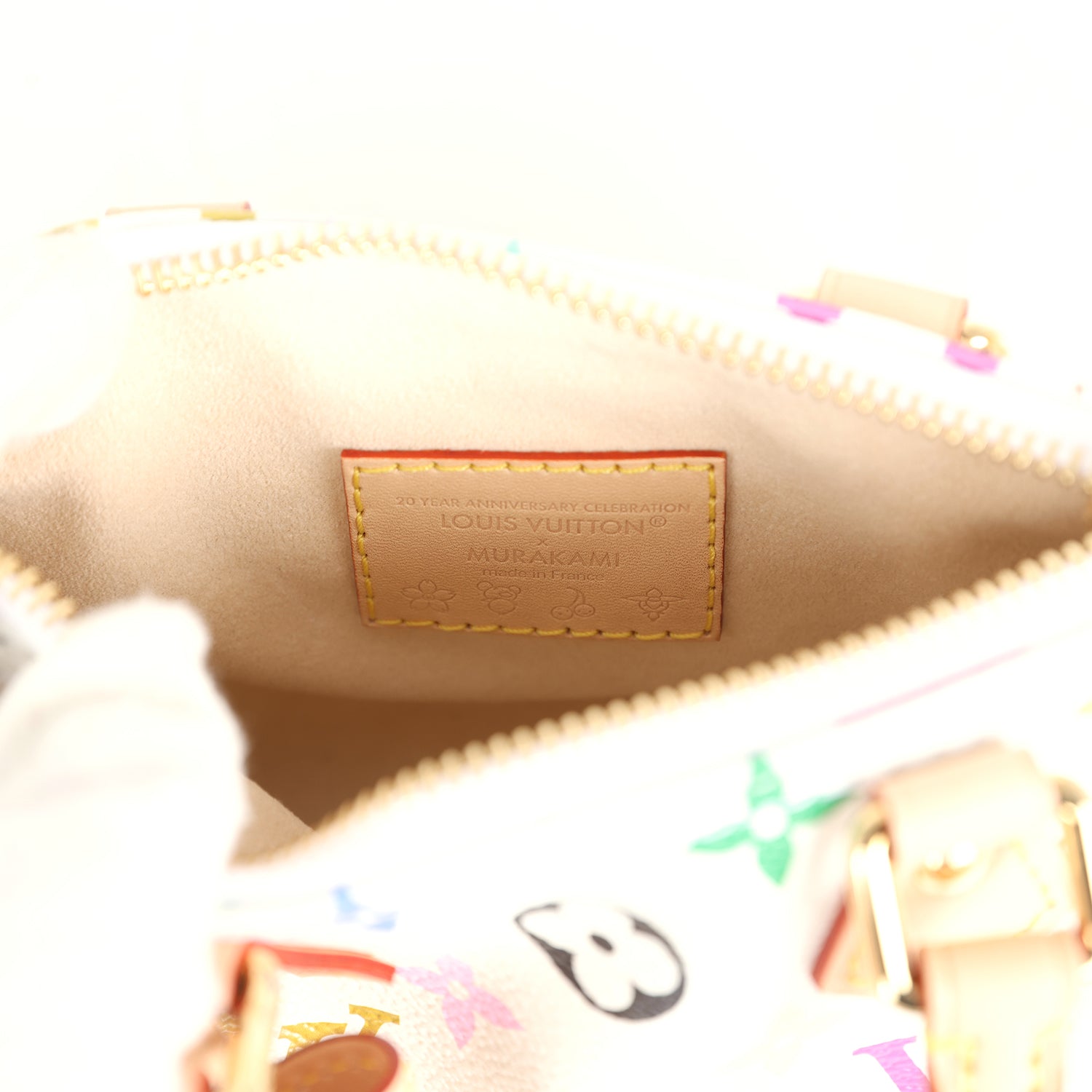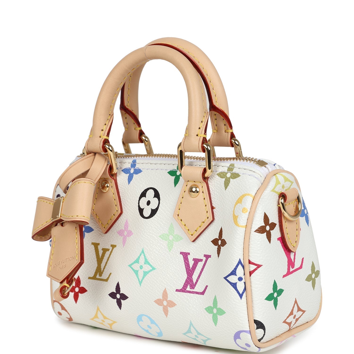 This 20th Anniversary Re-Edition 2025 Louis Vuitton X Takashi Murakami Nano Speedy is in white monogram multicolored coated canvas leather with gold hardware, features natural cow-hide leather trimming, a zipper closure, a removable cow-hide leather keychain, double rolled handles and a removable adjustable cow-hide leather shoulder/crossbody strap.