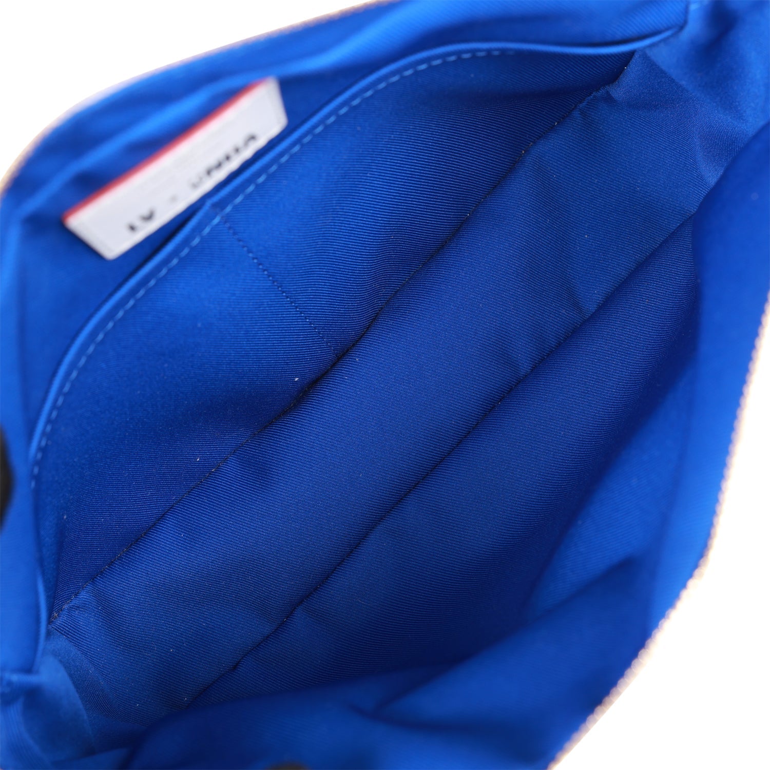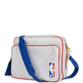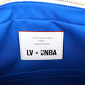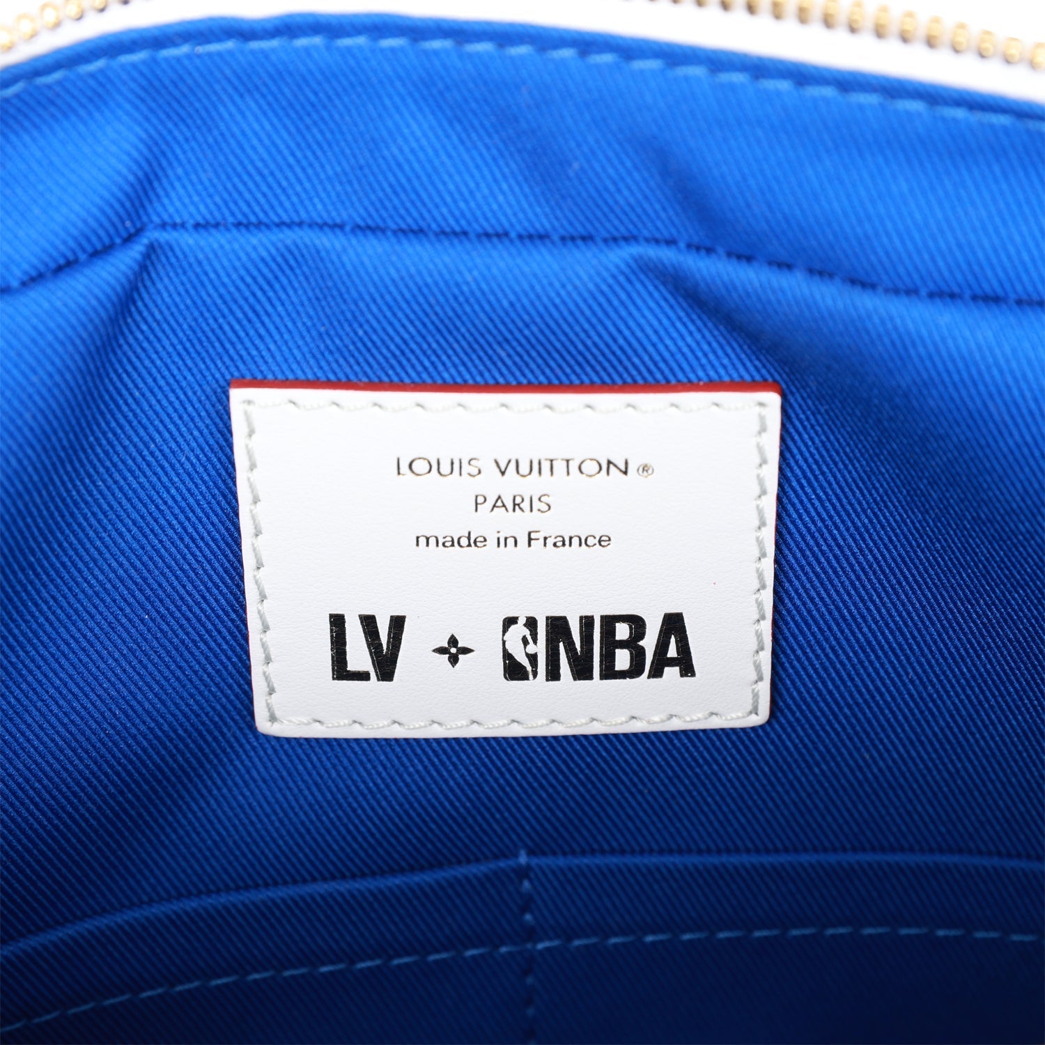 This limited edition LV x NBA Nil PM bag is of Antartica coated canvas with golden brass hardware and features the NBA logo, red leather trim, a zip closure, a removable leather luggage tag, back slip pocket and an adjustable blue leather strap.