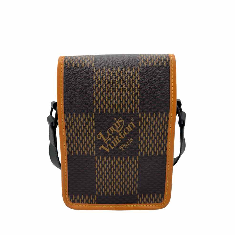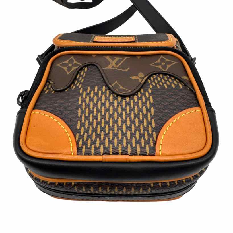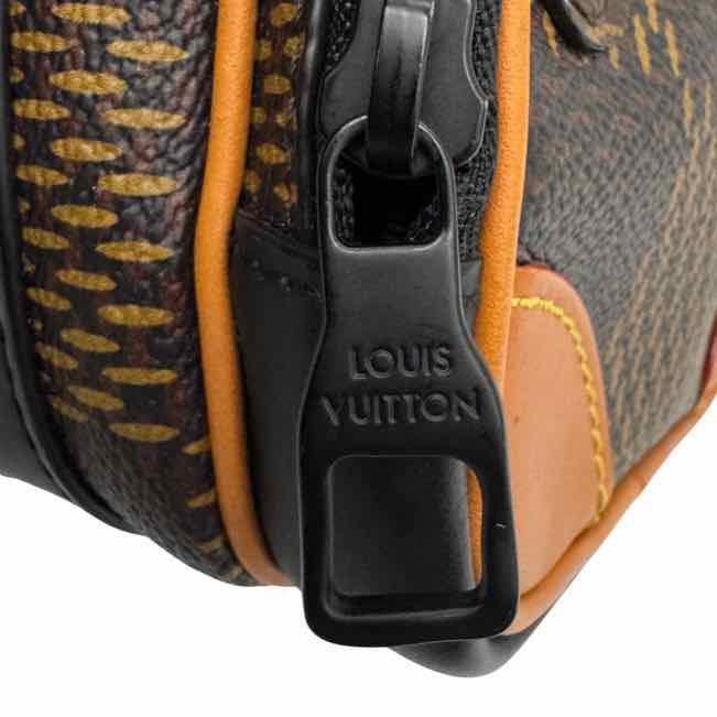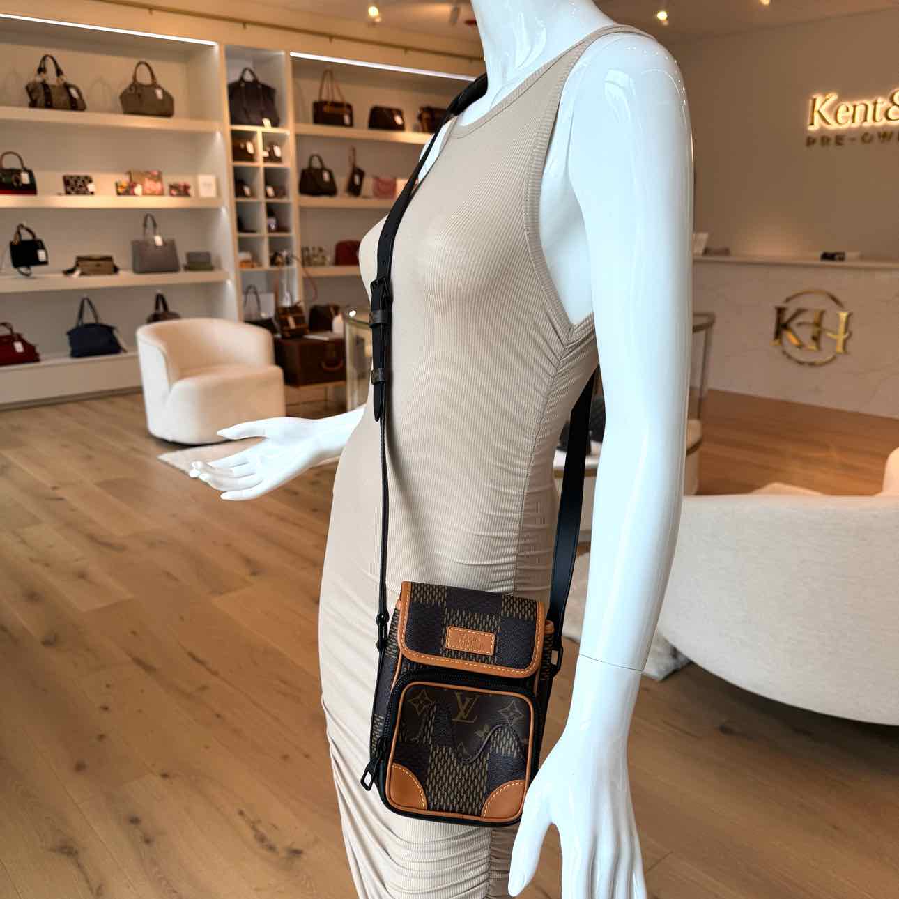 This authentic pre-owned Louis Vuitton X Nigo Giant Damier Ebene Monogram Nano Amazone Messenger Bag features: coated canvas exterior with vachetta trim, fabric lined interior, black hardware, velcro flap closure, adjustable crossbody strap with shoulder pad, and exterior zip pocket on front. Includes original dust bag.