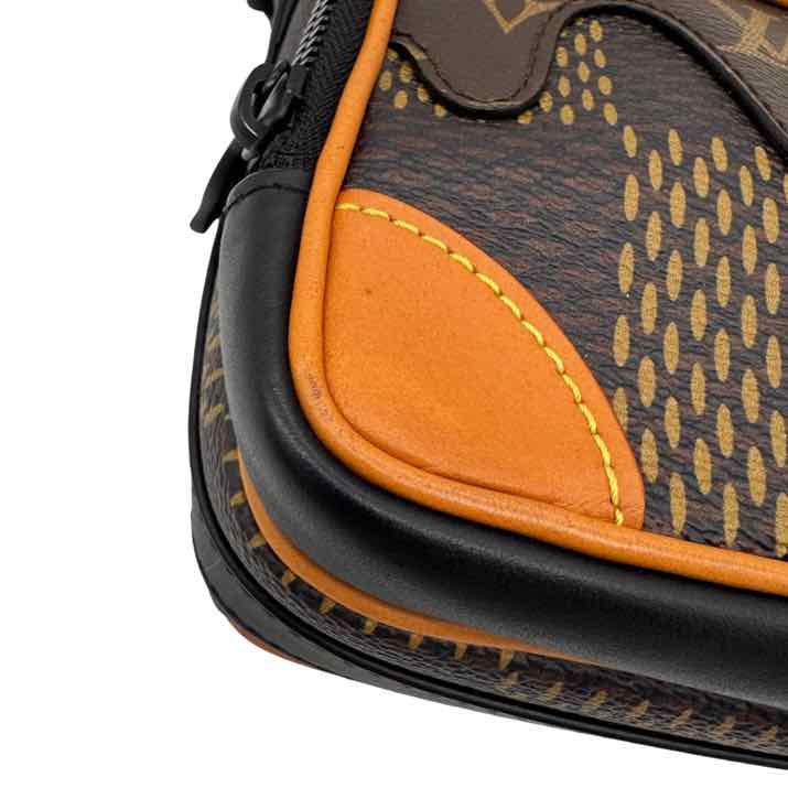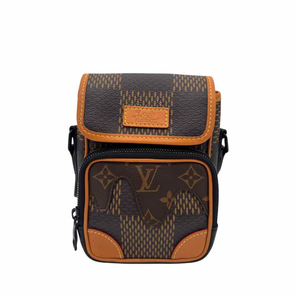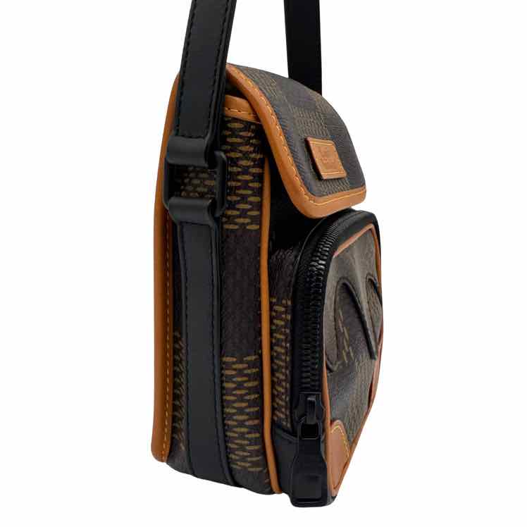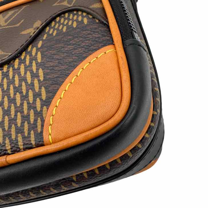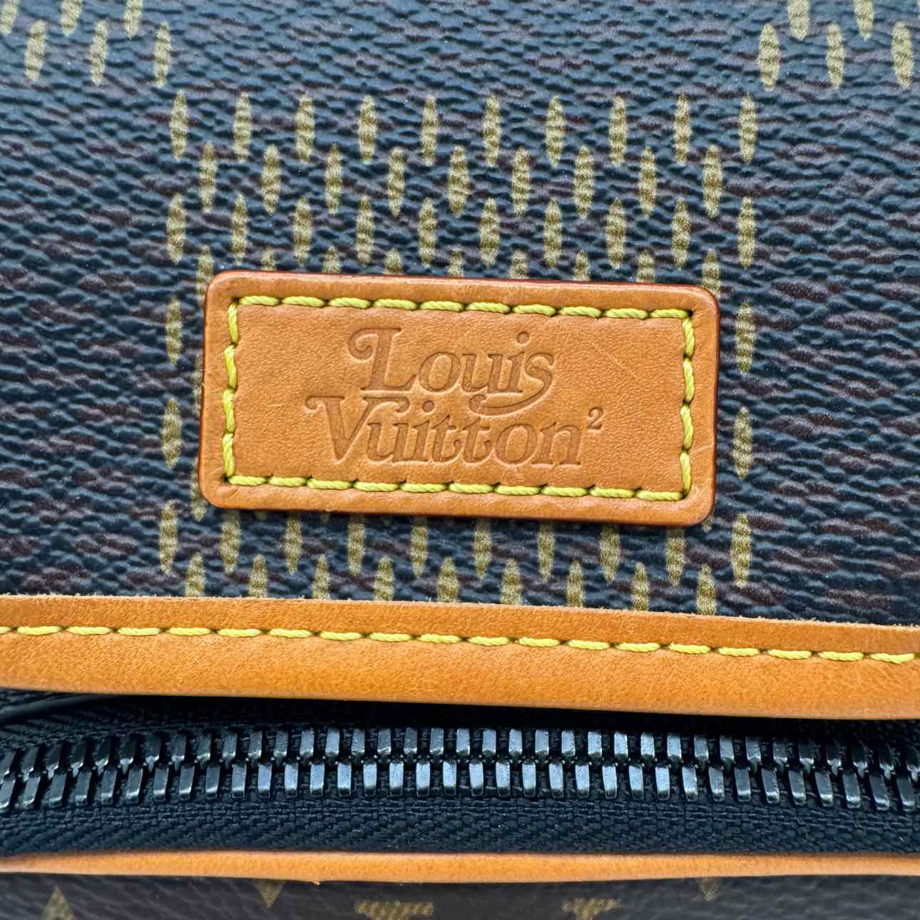 This authentic pre-owned Louis Vuitton X Nigo Giant Damier Ebene Monogram Nano Amazone Messenger Bag features: coated canvas exterior with vachetta trim, fabric lined interior, black hardware, velcro flap closure, adjustable crossbody strap with shoulder pad, and exterior zip pocket on front. Includes original dust bag.