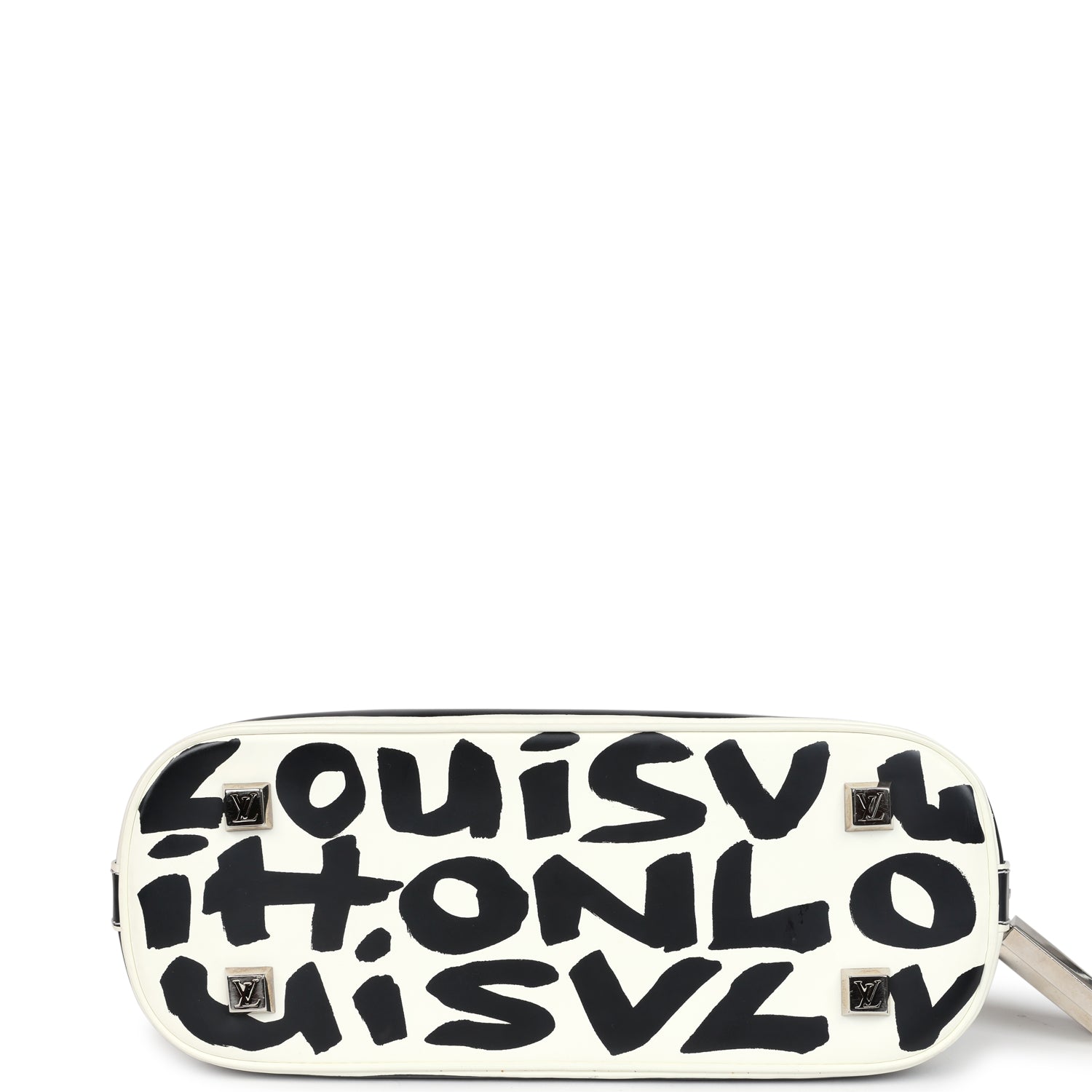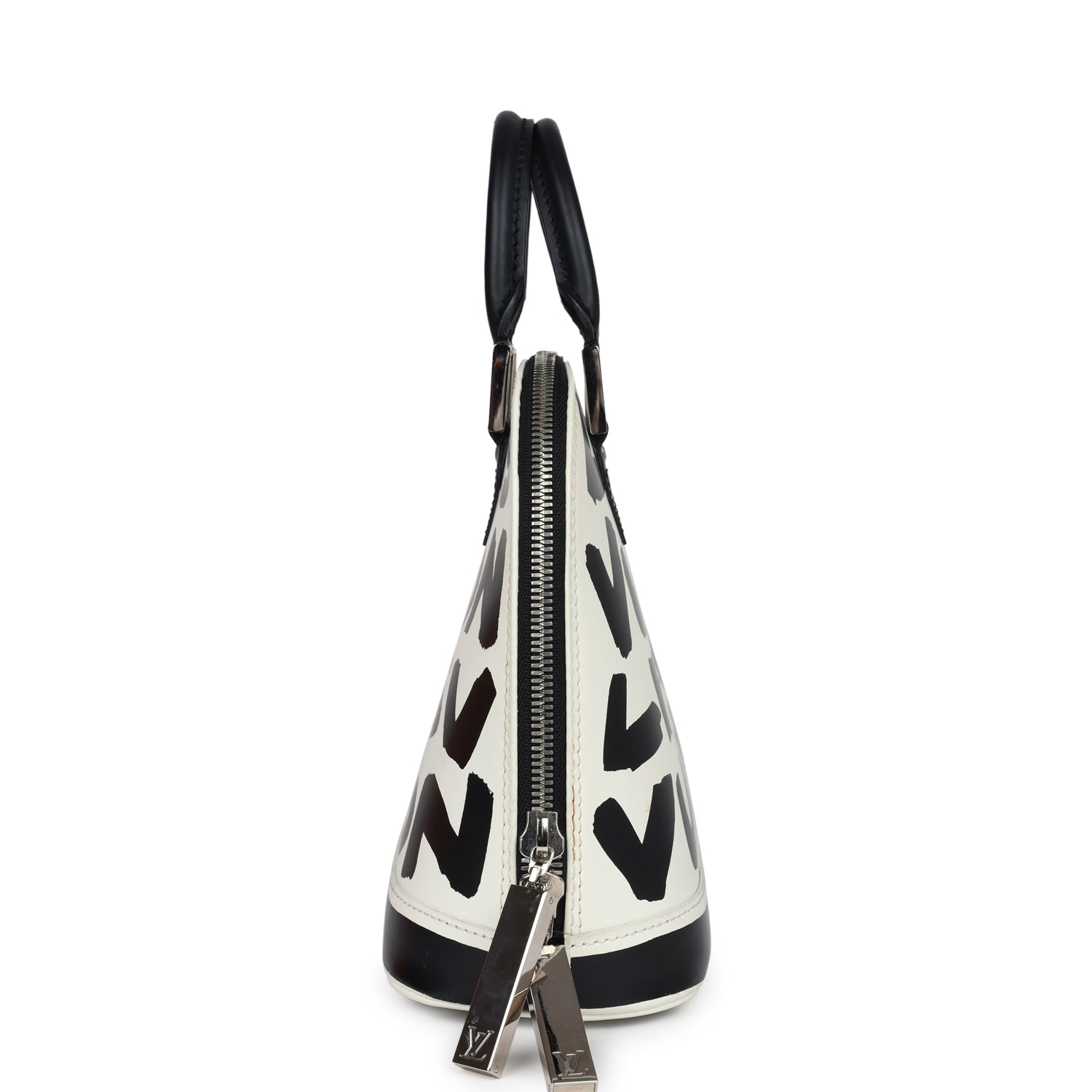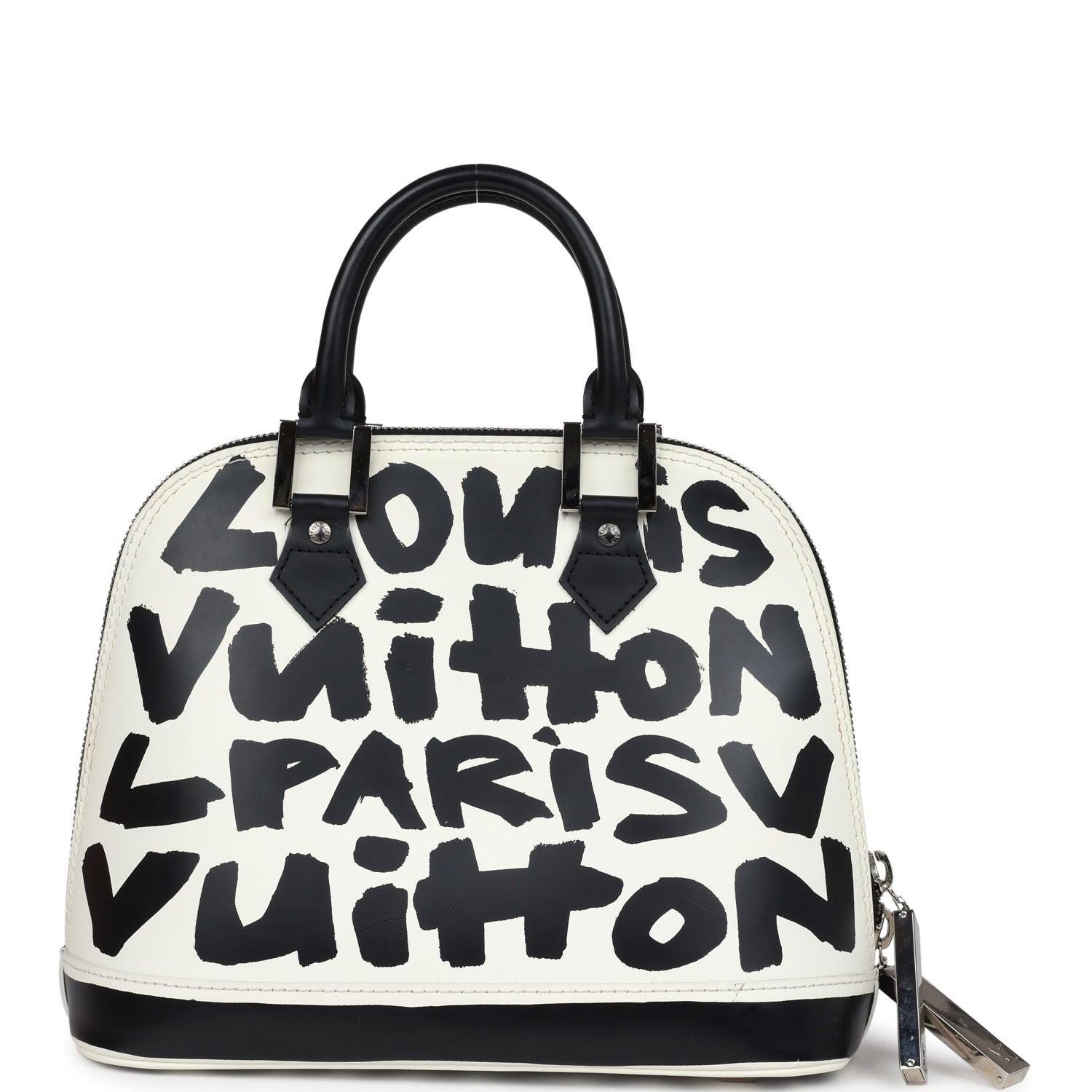 This vintage 2001 Louis Vuitton X Stephen Sprouse graffiti leather Alma MM bag has silver tone hardware and features white and black graffiti calfskin leather, has two double rolled top handles, and a zip around closure with silver logo hardware zipper pulls.