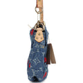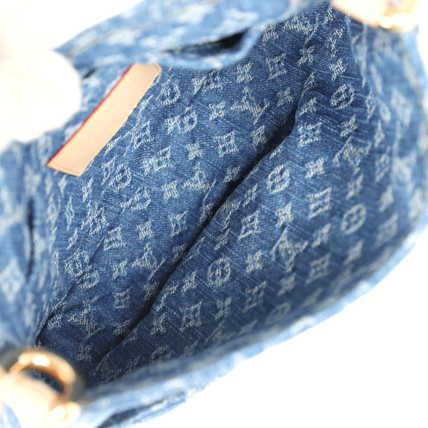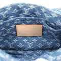 The interior is lined with blue monogram denim, featuring one slip pocket on the back wall.