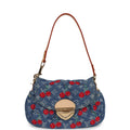 This 20th Anniversary Re-Edition 2025 Louis Vuitton X Takashi Murakami Cerises (Cherry) Sunset Bag is in blue monogram denim with gold-toned hardware, featuring natural cow-hide leather trimming, yellow contrast stitching, an oversized gold-tone tuck-lock closure, a front flat pocket, one flat cowhide leather shoulder strap, one detachable flat cowhide leather shoulder strap, and all over Takashi Murakami signature cherry motif embroidery.