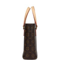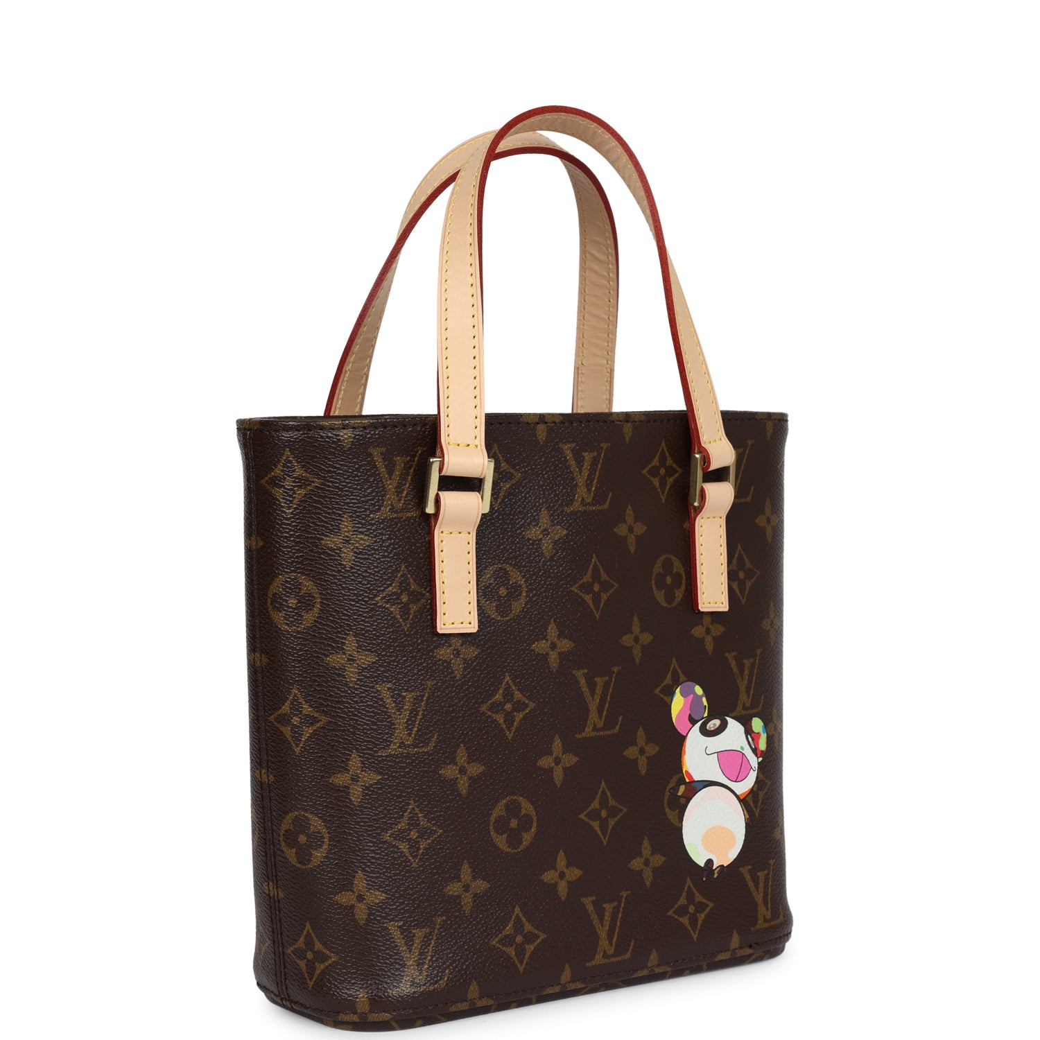 This vintage Louis Vuitton x Takashi Murakami Vavin PM is of brown monogram coated canvas leather with a painted Murakami multicolored panda design on the front and back with gold hardware and natural vachetta leather top handles.