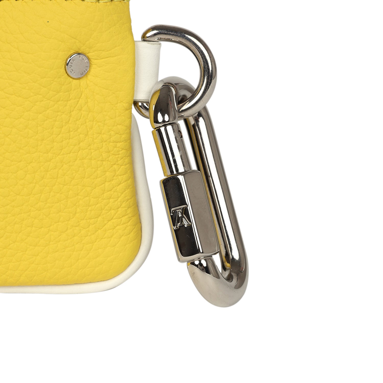 This 2021-22 Fall/Winter Louis Vuitton X Virgil Abloh Everyday Keepall Bandouliere 50 Yellow Leather with Silver Hardware, features "Louis Vuitton" on the front of the pouch in white grained calfskin, a zipper closure, LV silver-tone detachable Carabiner on the side of the pouch and a LV clip on a sliver-tone chainlink on inside of pouch with the option to clip/hand onto another bag.