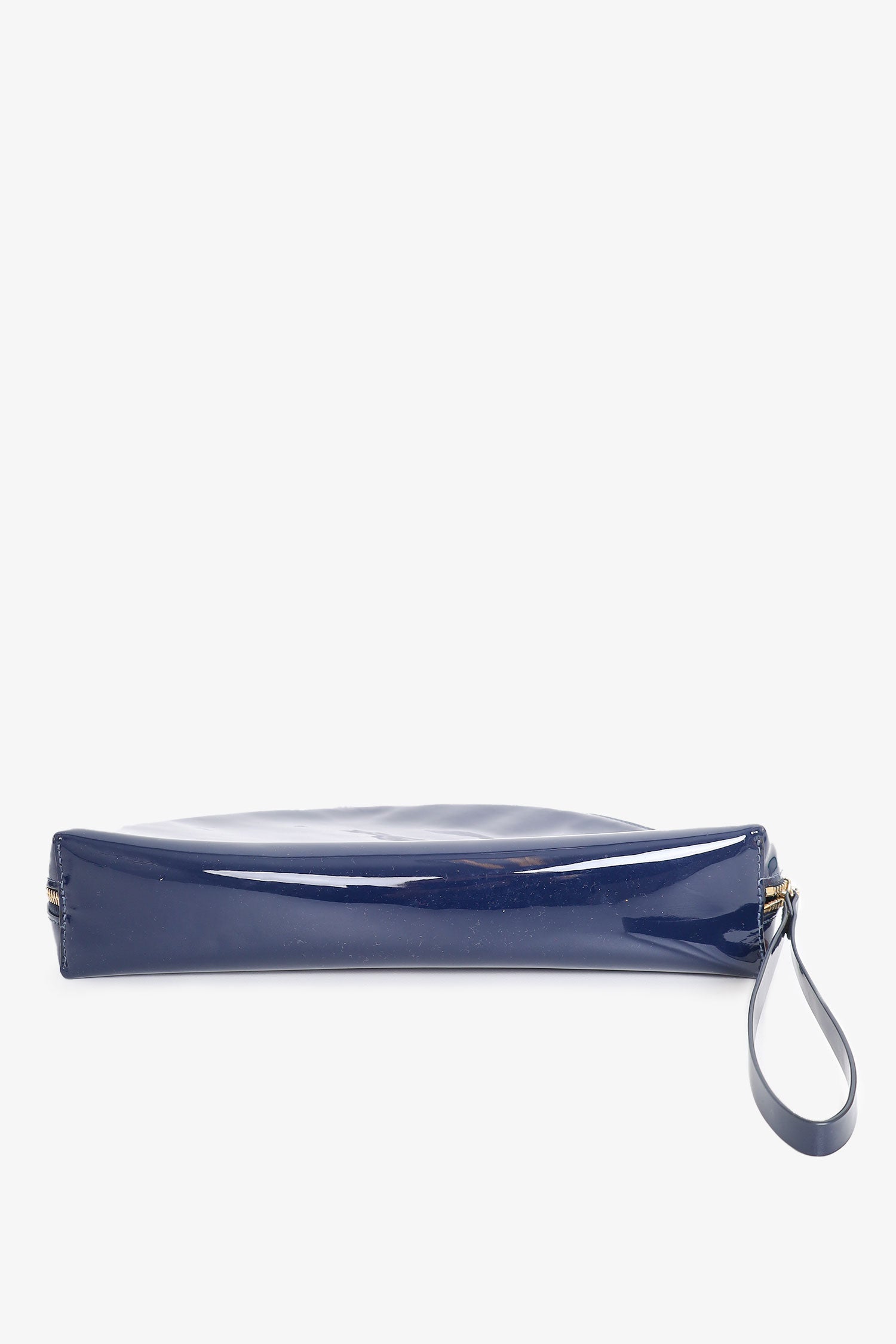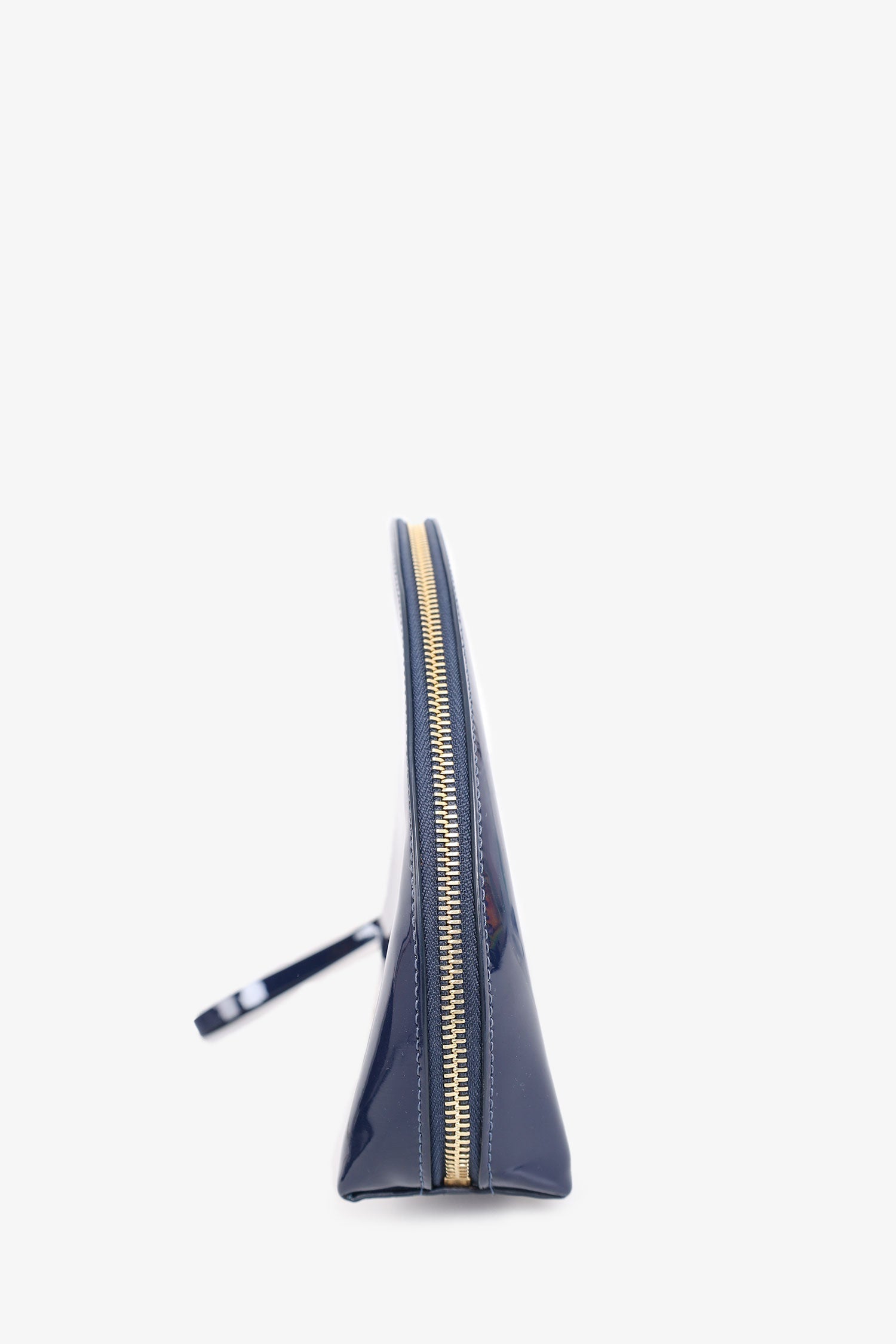 Mansur Gavriel Navy Patent Half Moon Clutch. Zip-closure. Gold-tone hardware. Suede interior. Single interior card slot.