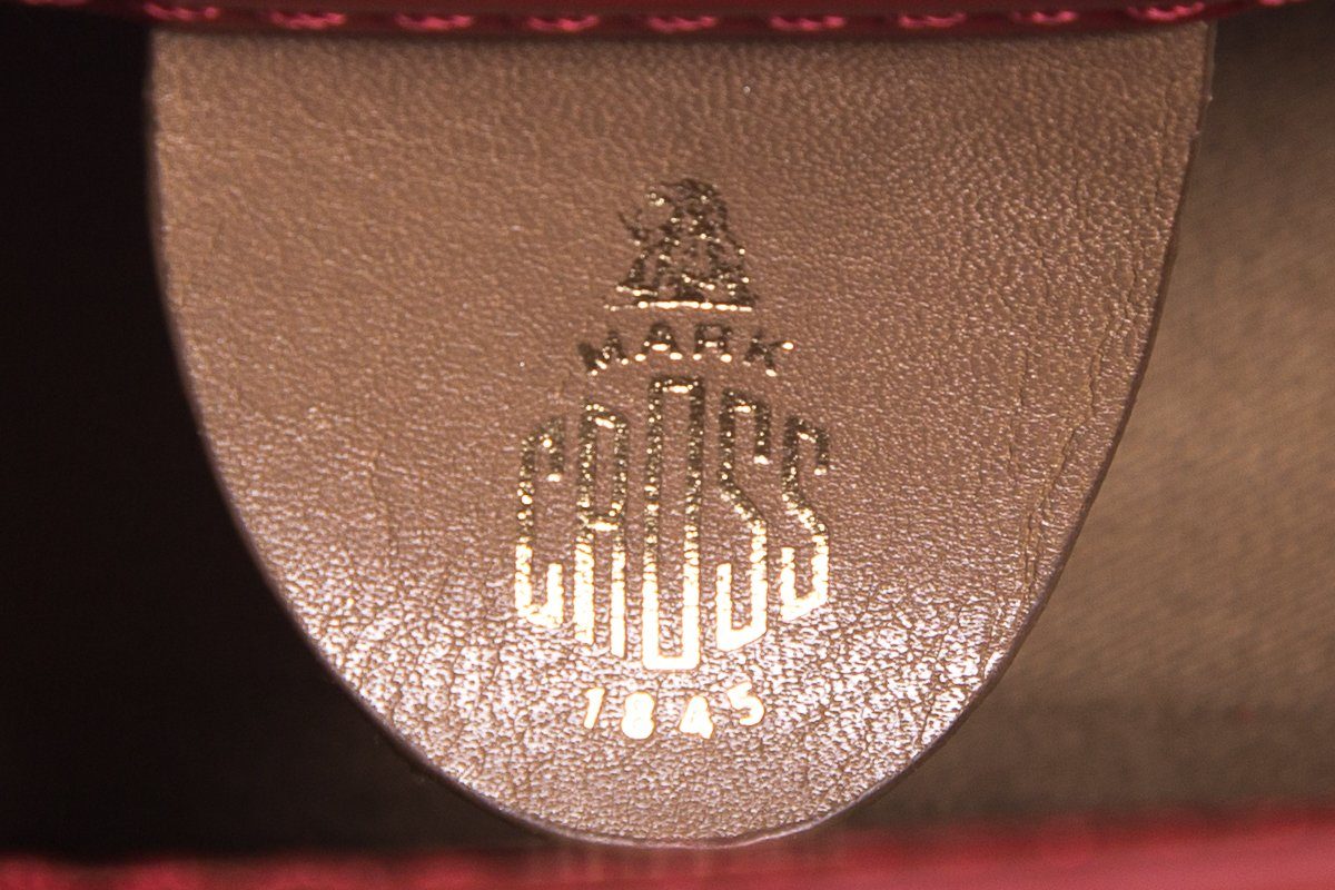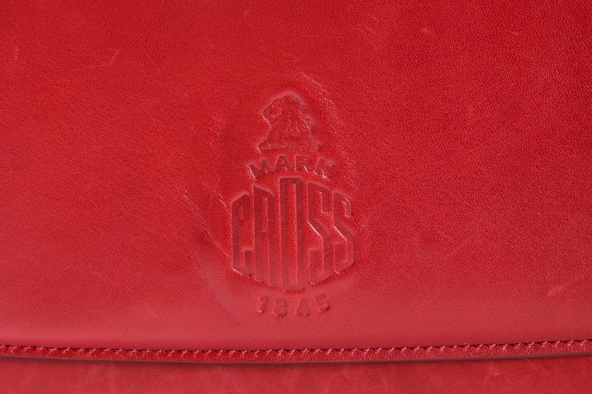 Red leather Mark Cross envelope clutch with Mark Cross with gold-tone hardware, optional drop-in chain-link shoulder strap, dual interior compartments, brown logo jacquard woven lining, three interior pockets; one with zip closure, single interior pen hole.