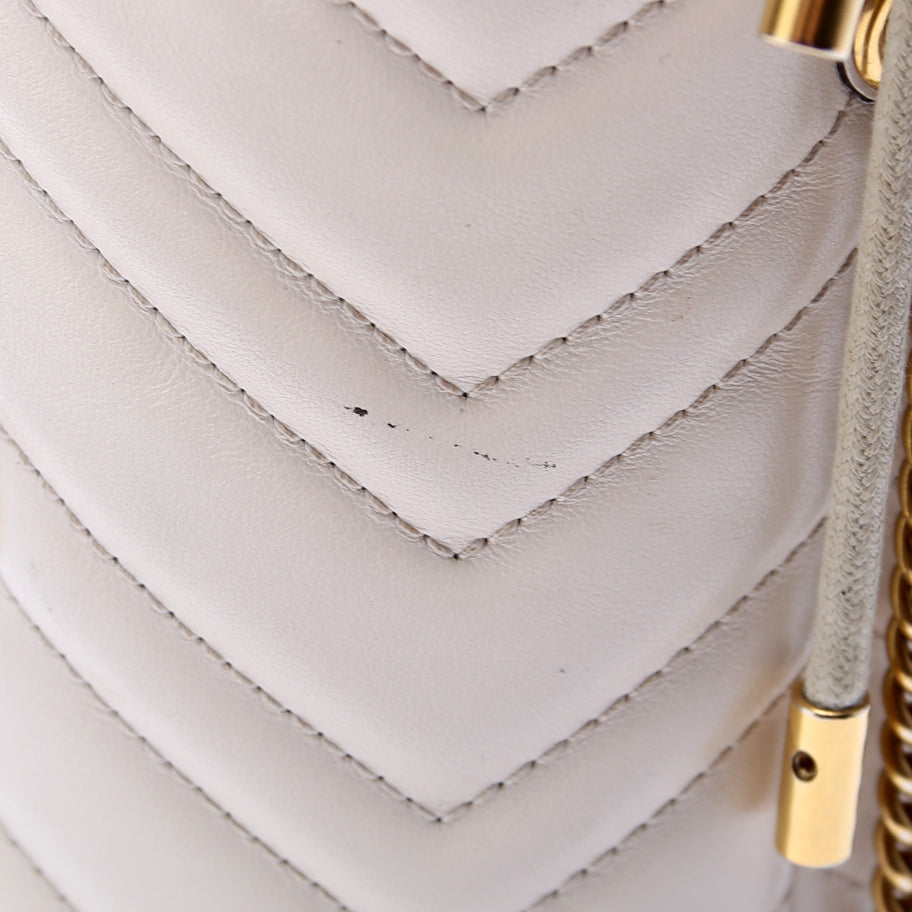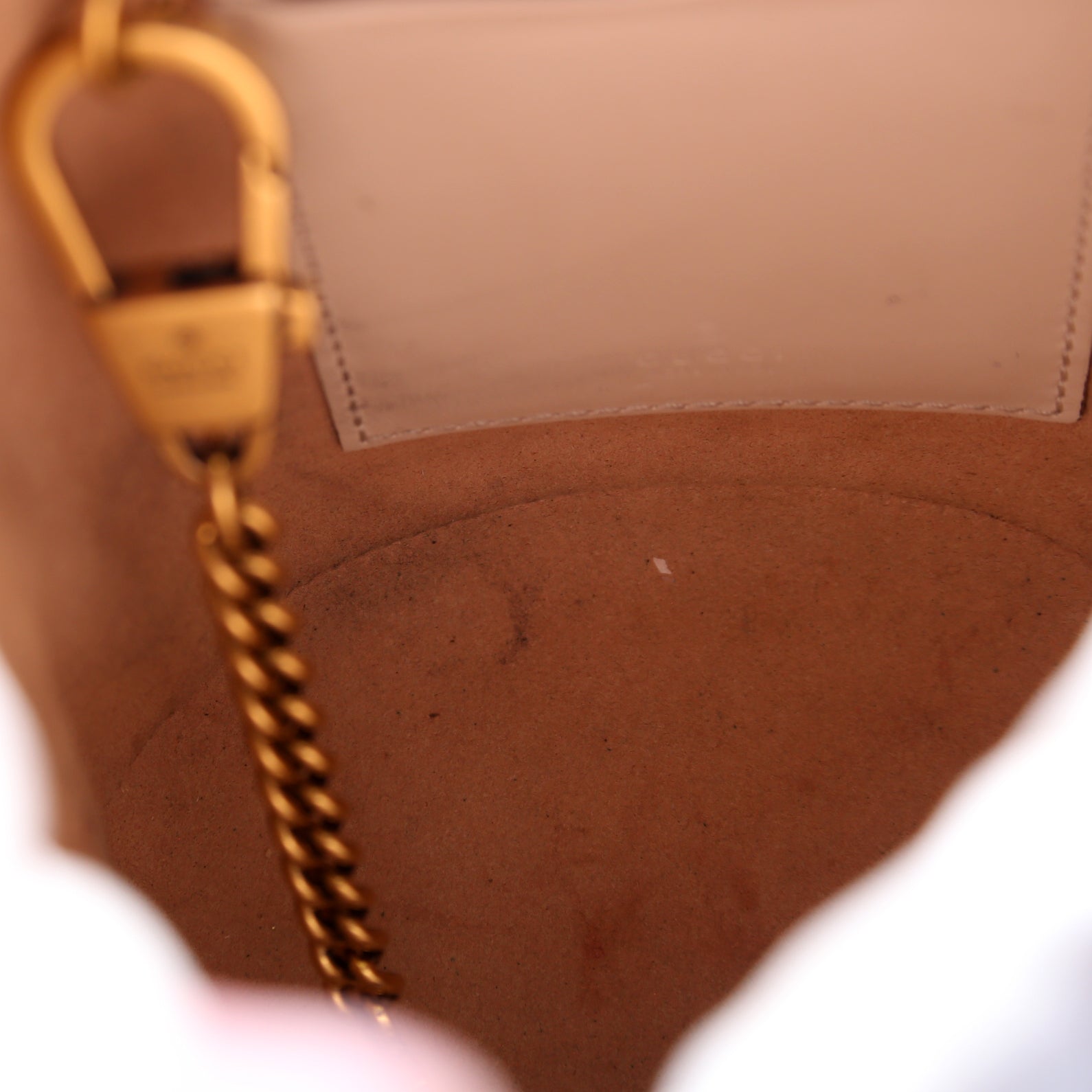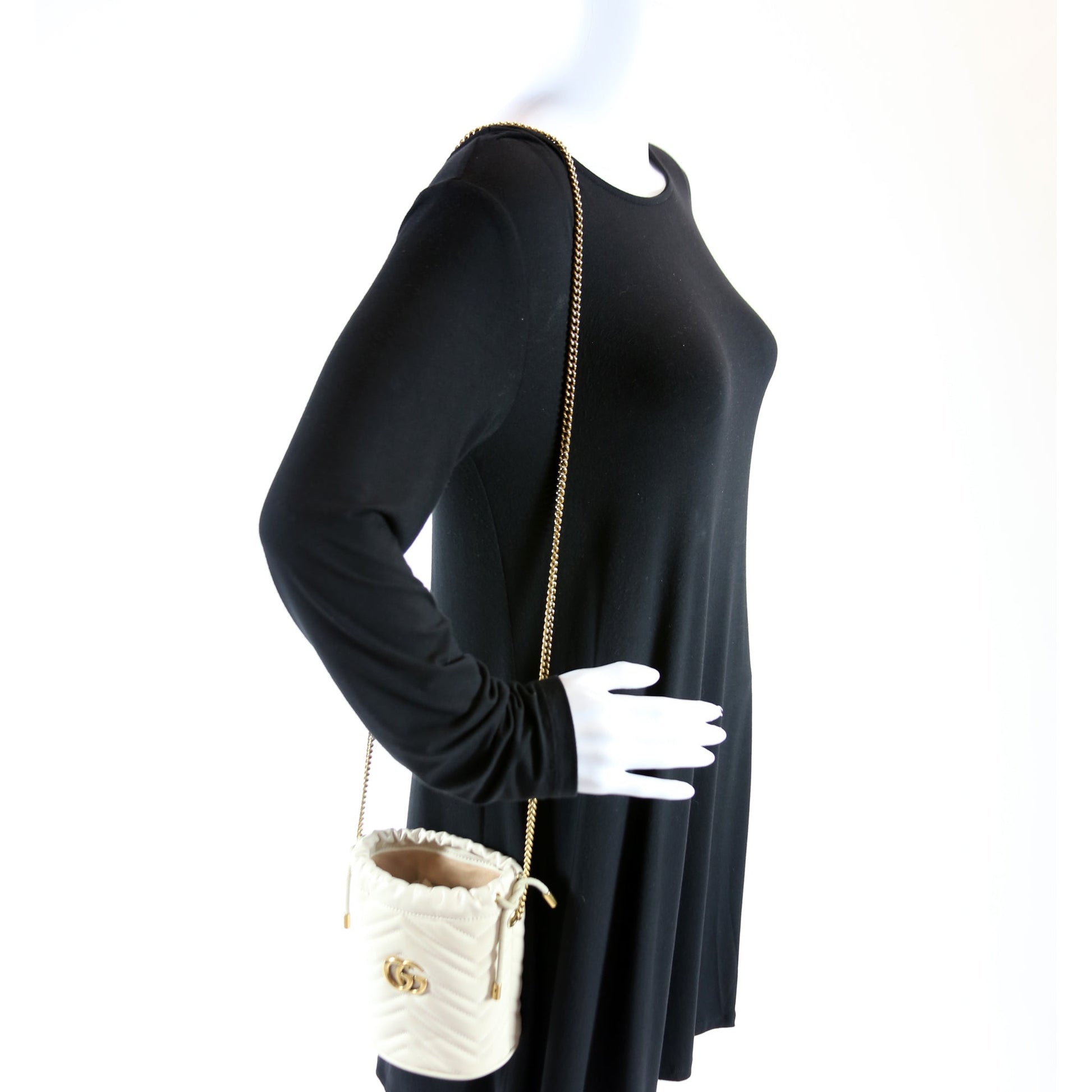 This Gucci Marmont Mini Bucketis eye catching bag. The exterior is in the classic Gucci Marmont leather.