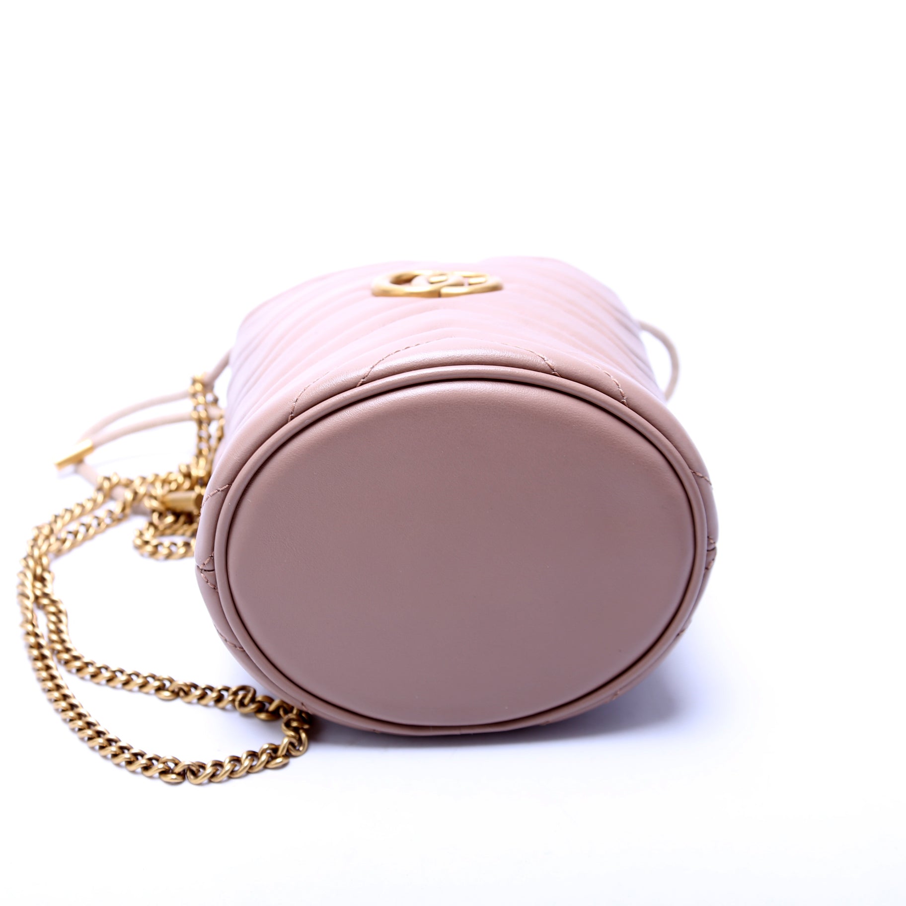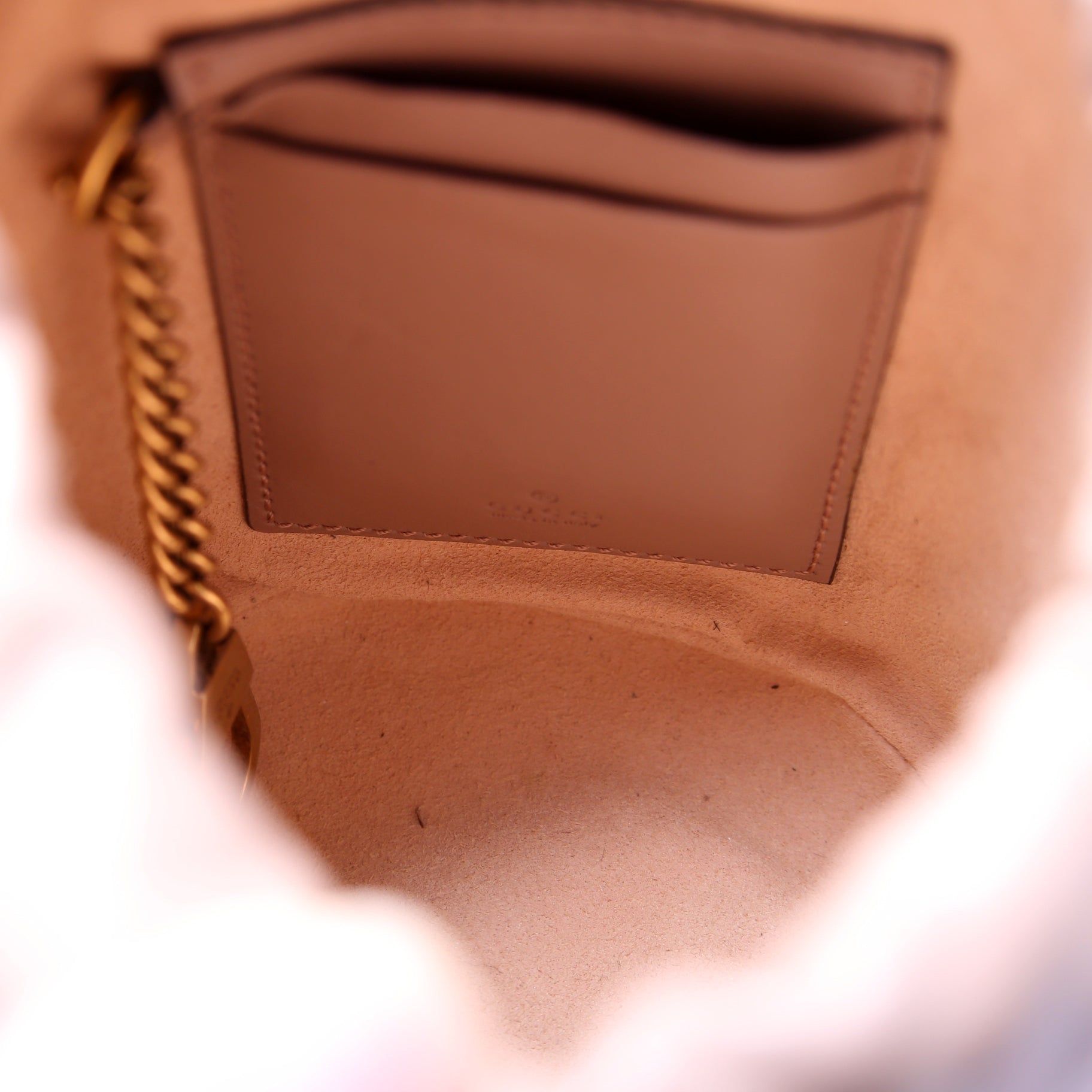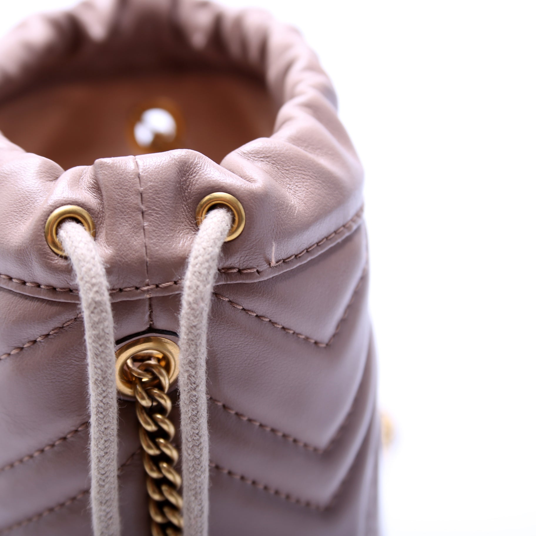 This Gucci Marmont Mini Bucketis eye catching bag. The exterior is in the classic Gucci Marmont leather.