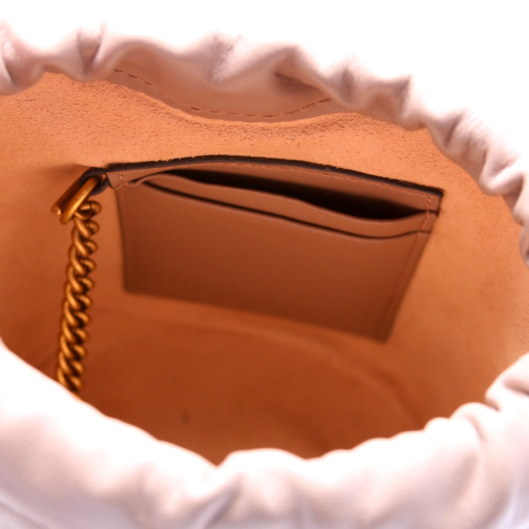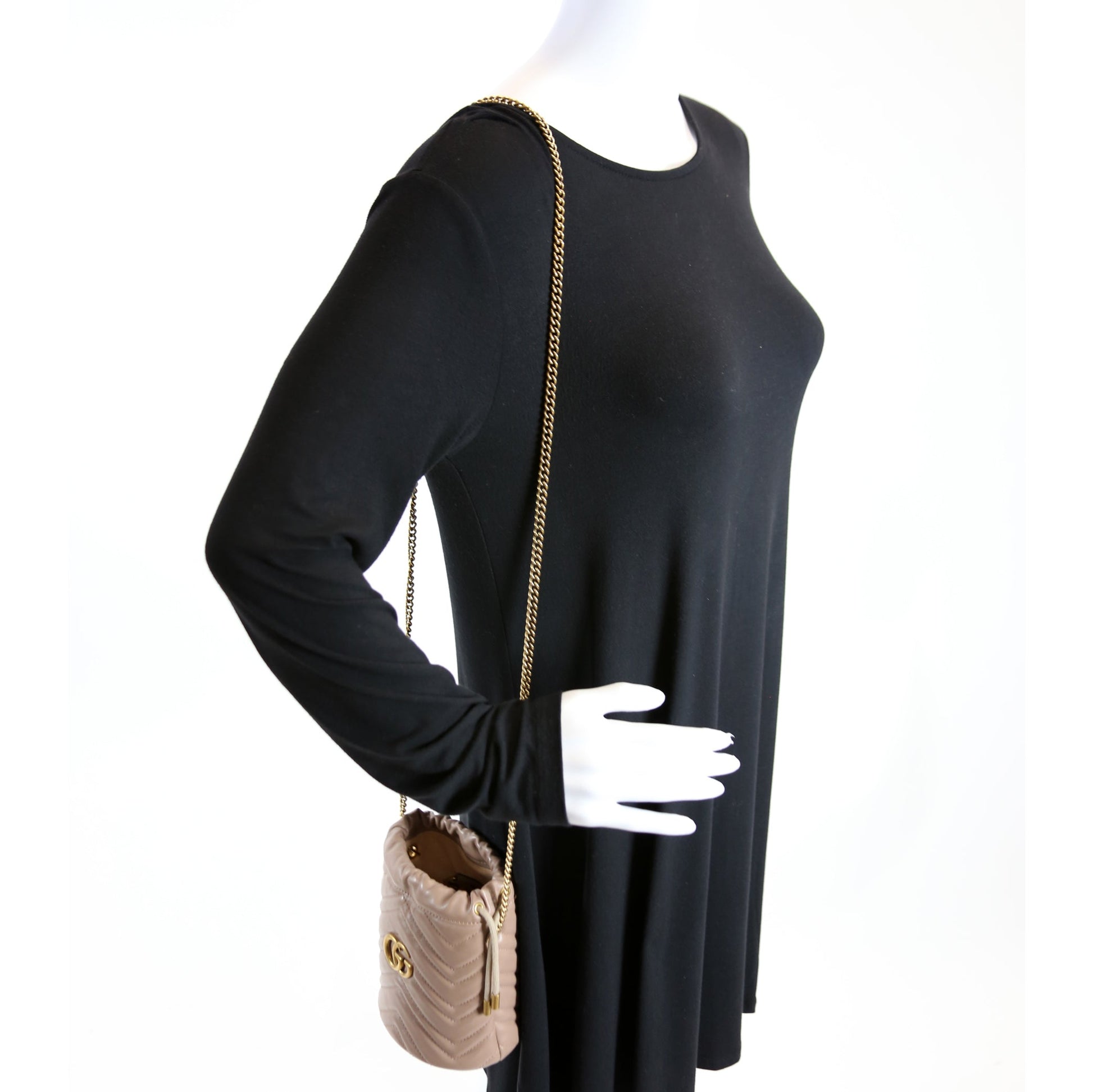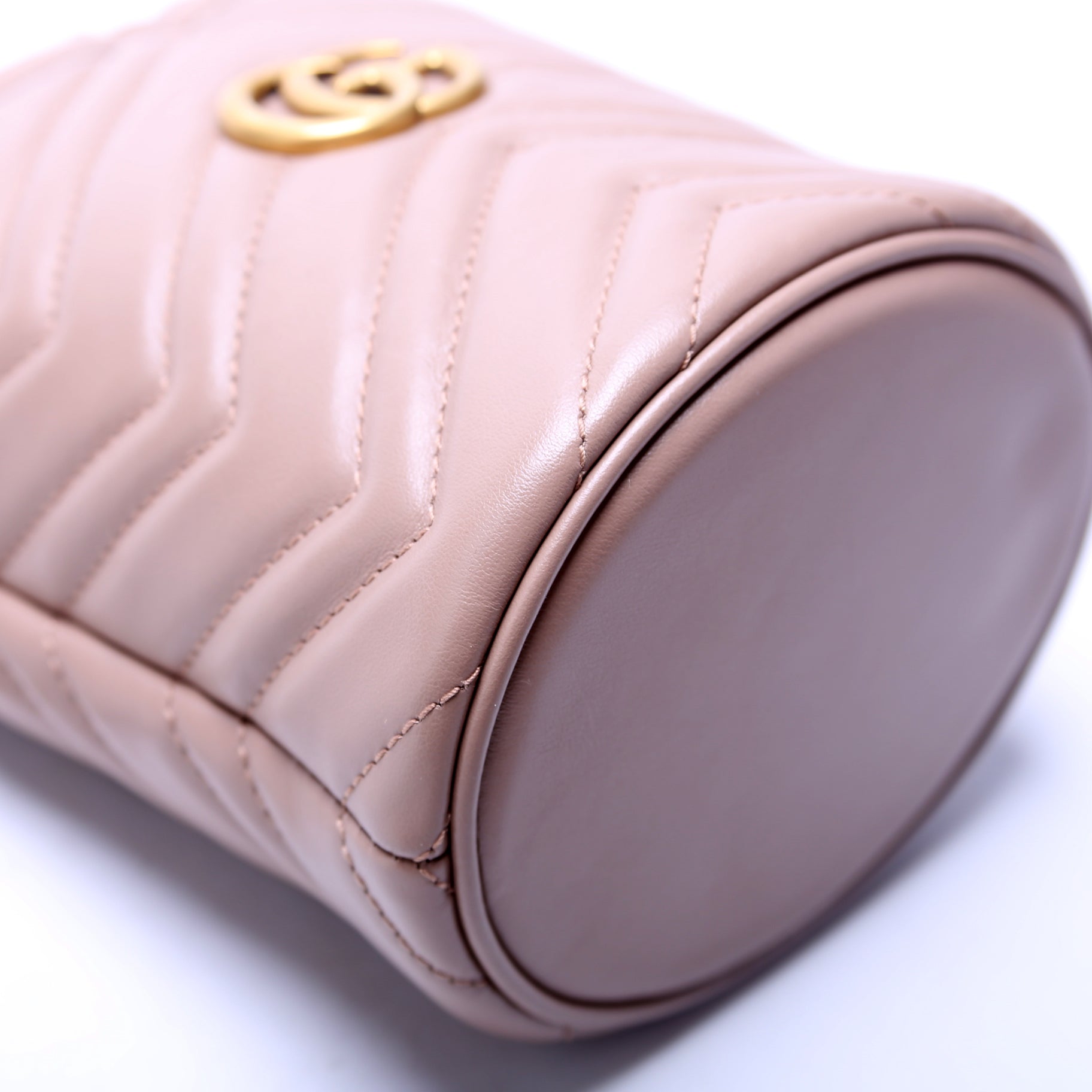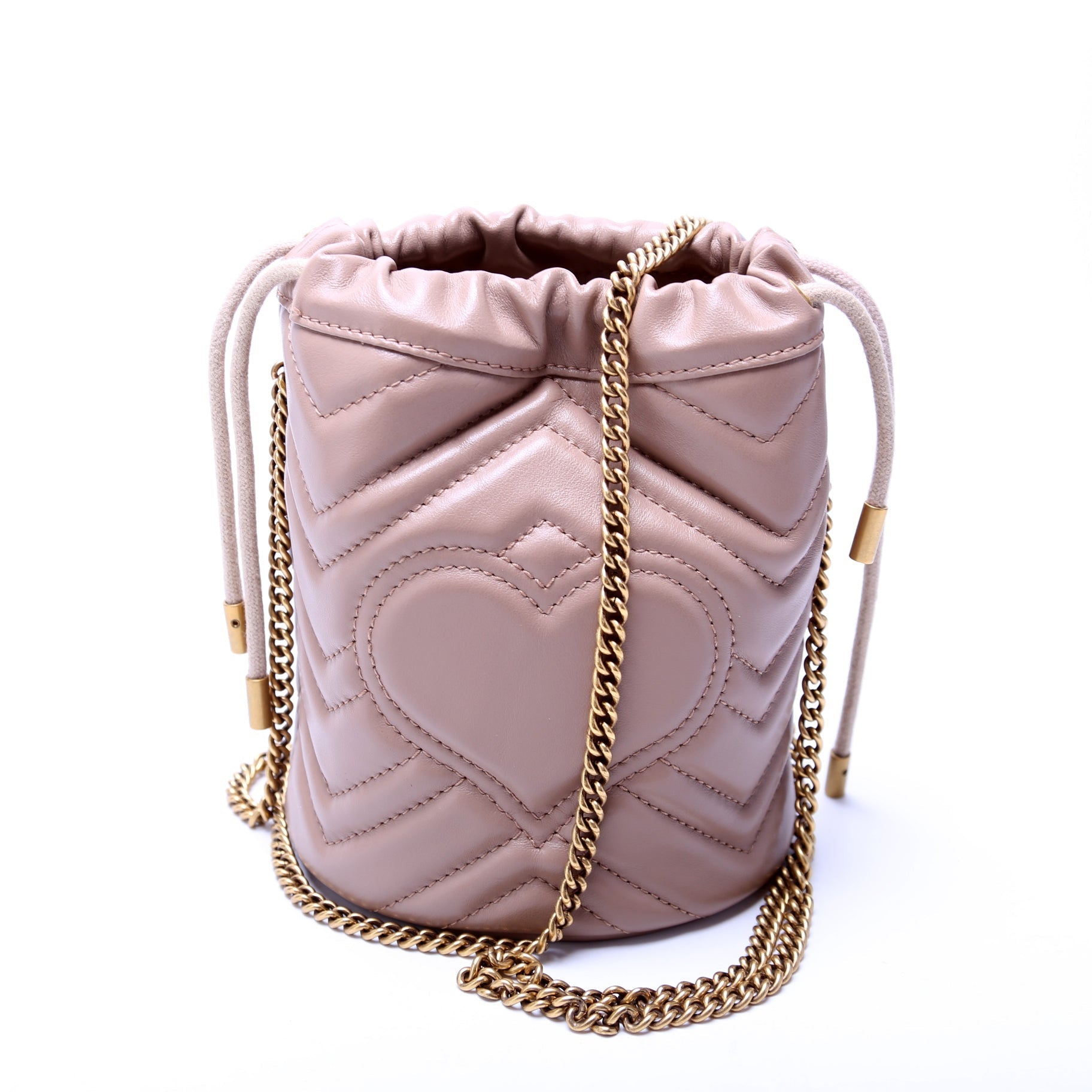 This Gucci Marmont Mini Bucketis eye catching bag. The exterior is in the classic Gucci Marmont leather.