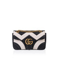 A true statement piece for any woman with a passion for fashion. Gucci presents this unique and edgy bag from their popular Marmont collection. Carefully crafted in black and white matelassé leather, complimented by antique gold-tone hardware and signature GG logo, this piece is definitely eye catching. Wear this bag from day to night, whether you pair it with a pair of jeans and a jumper, or trousers and a silk blouse. The Marmont collection is a famous line from Gucci that took It-Girls and influencers of the world by storm. This is the ideal bag for any young woman with a fashion forward sense of style and doesn't mind being the centre of attention. A handbag well-worthy of any luxury handbag collection that you will have in your wardrobe forever!