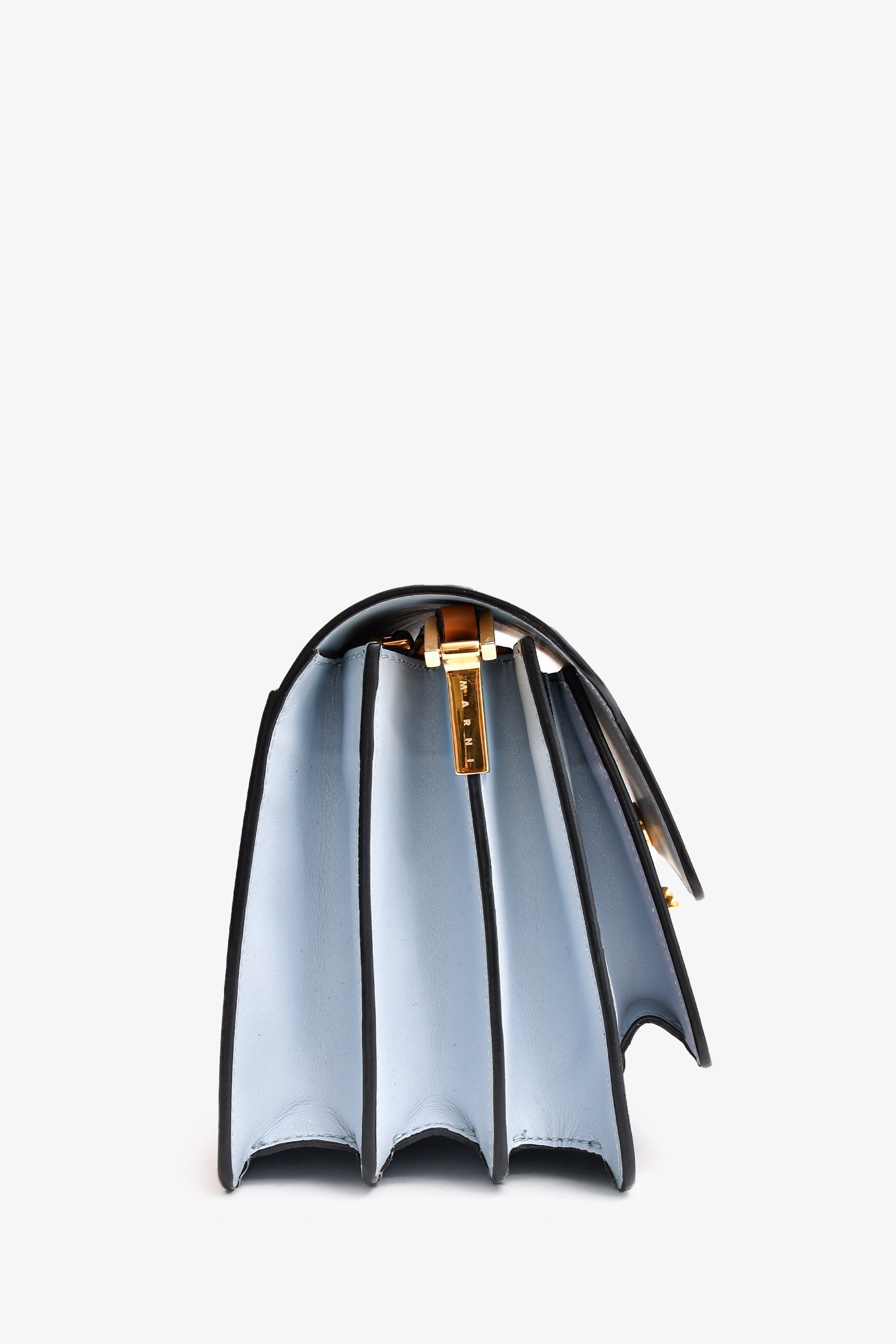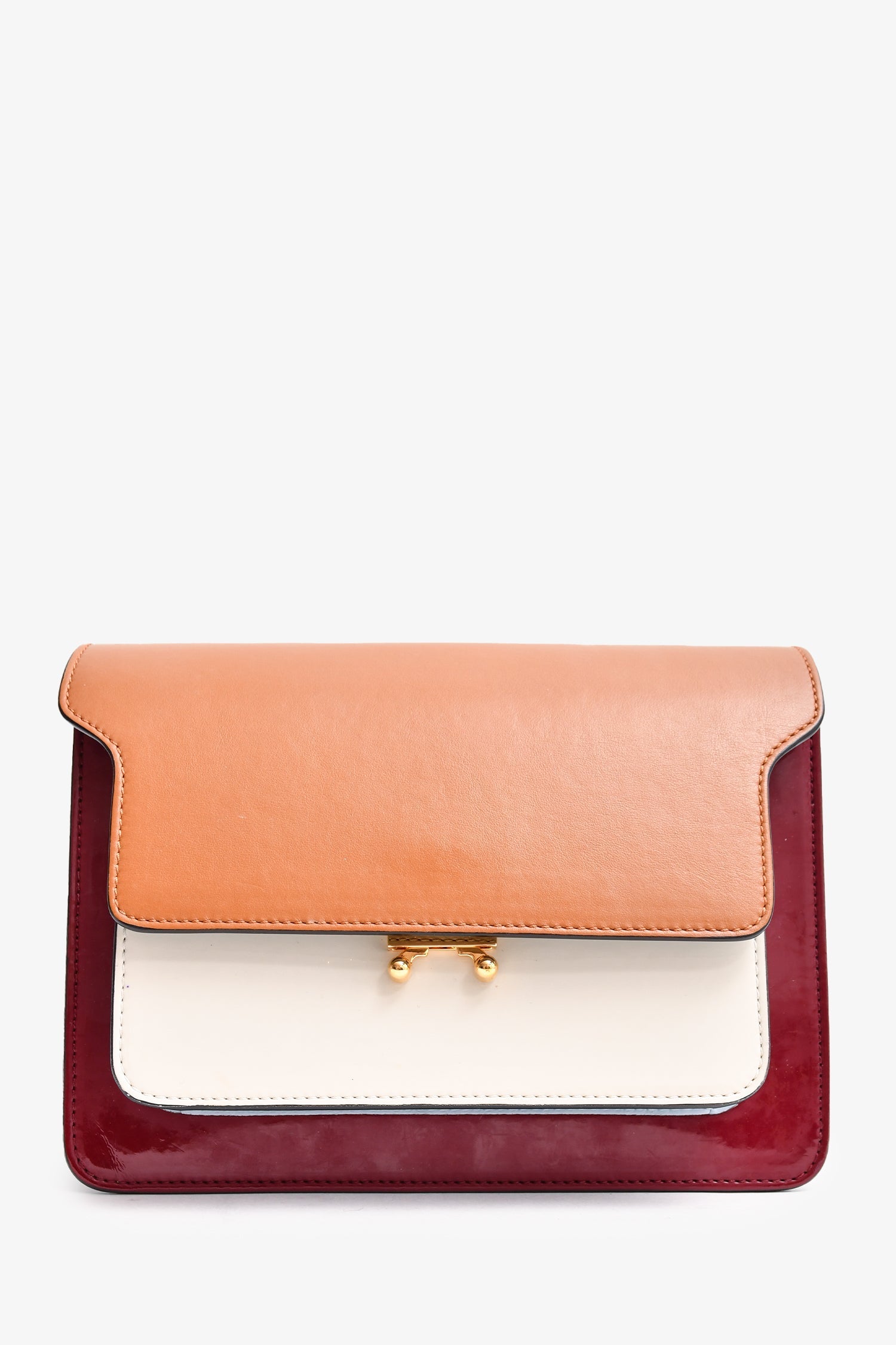 Marni Brown/White/Burgundy Leather/Patent Trunk Bag With Strap. Gold-tone hardware. Clip-on flap closure. Four compartments. Two additional ones with zipper closure. One exterior back compartment. Tonal stitching.