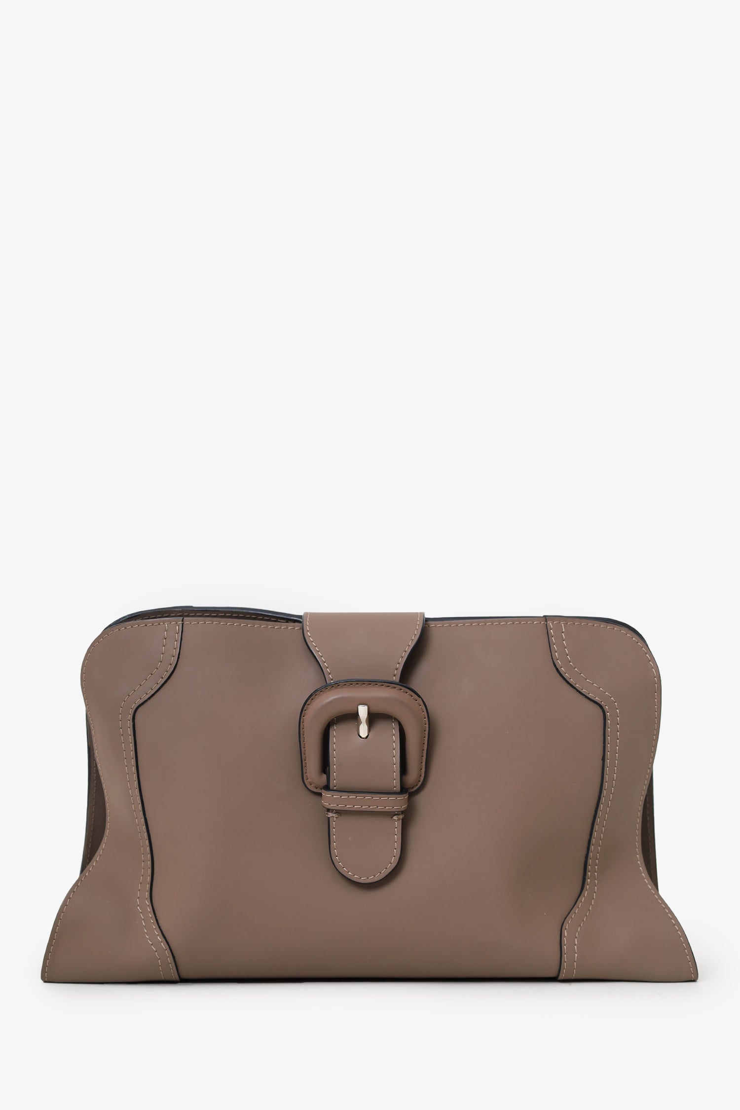 Marni Taupe Leather Buckle Clutch. Front fold-over faux-buckle piece with snap-button closure. 3 interior compartments. 2 side open compartments, middle compartment with top flip-lock closure; 2 slip pockets in middle compartment. Lined interior. Silver-tone hardware. Tonal stitching.