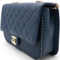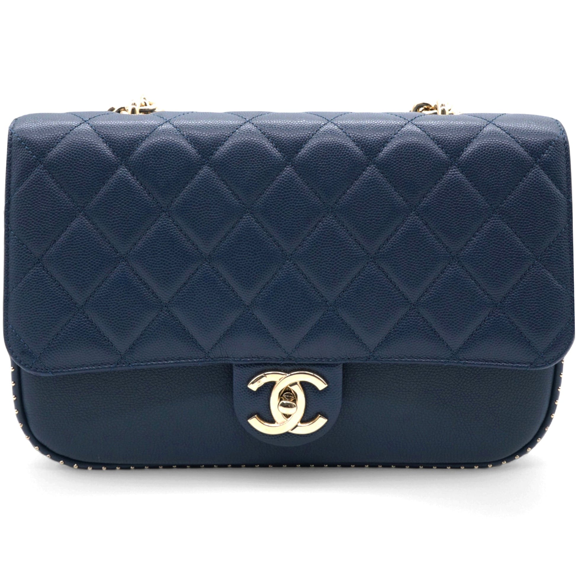 | This classic shoulder bag is crafted of diamond-quilted caviar leather in blue. It features leather threaded gold chain shoulder straps, a flat exterior pocket, and a gold CC turn lock. The flaps open to an inner flap and blue fabric interior with patch pockets. | Material: Leather Lining: Textile Hardware: Gold color finish metal Accessories: Serial Number: 24754360 Production Year: 2017 | ![]() |