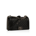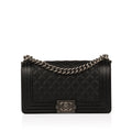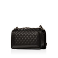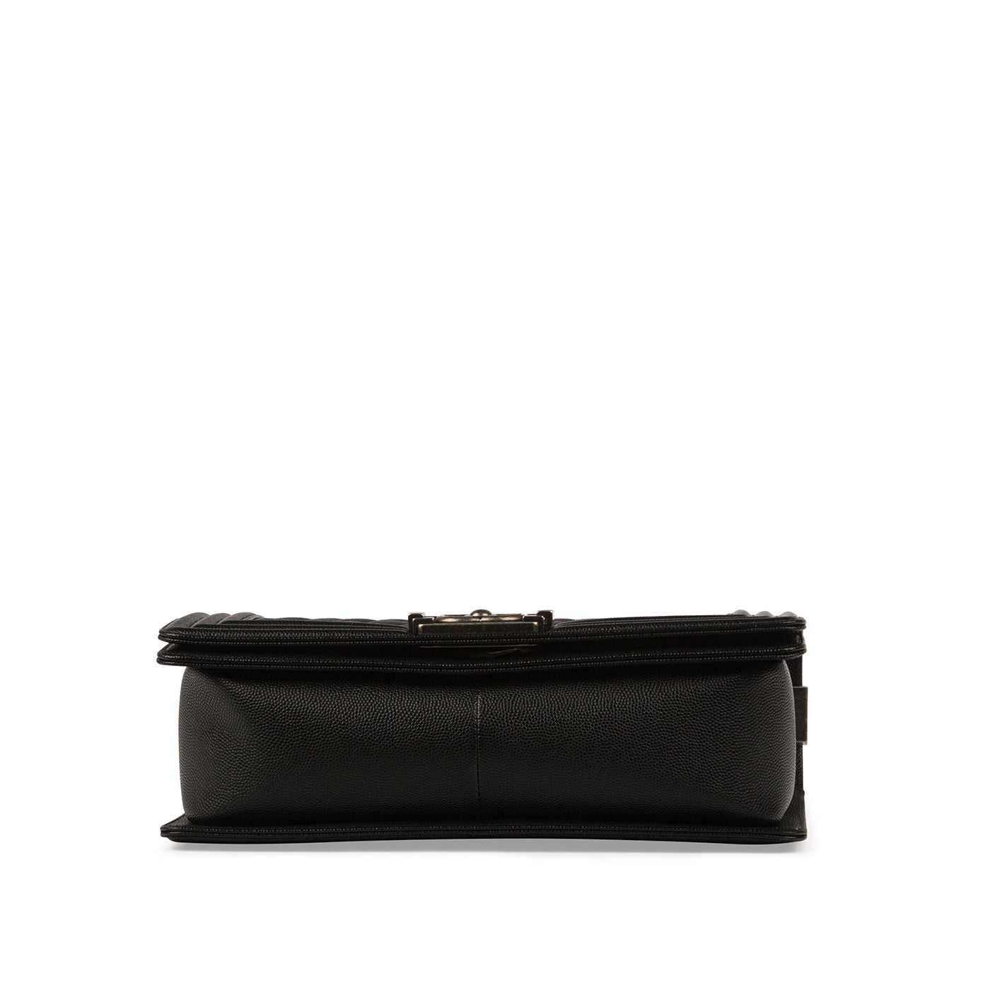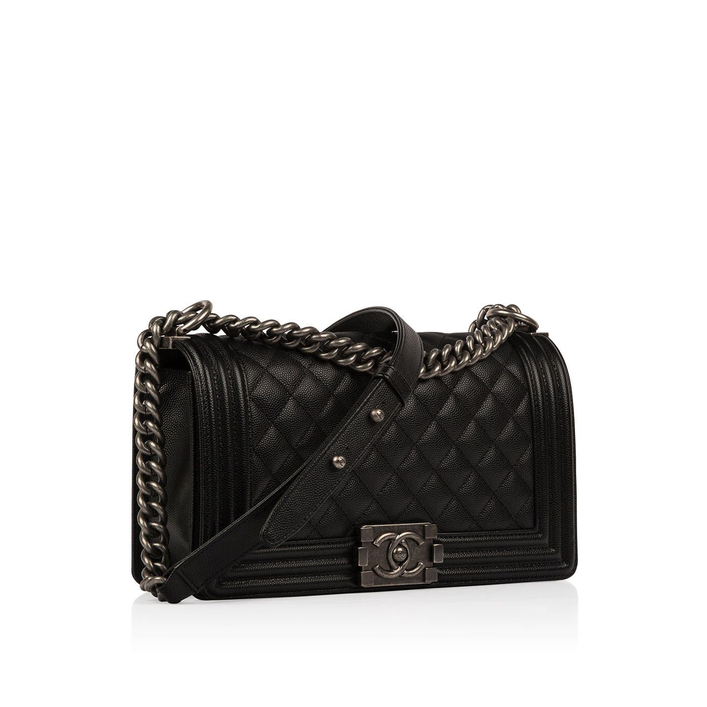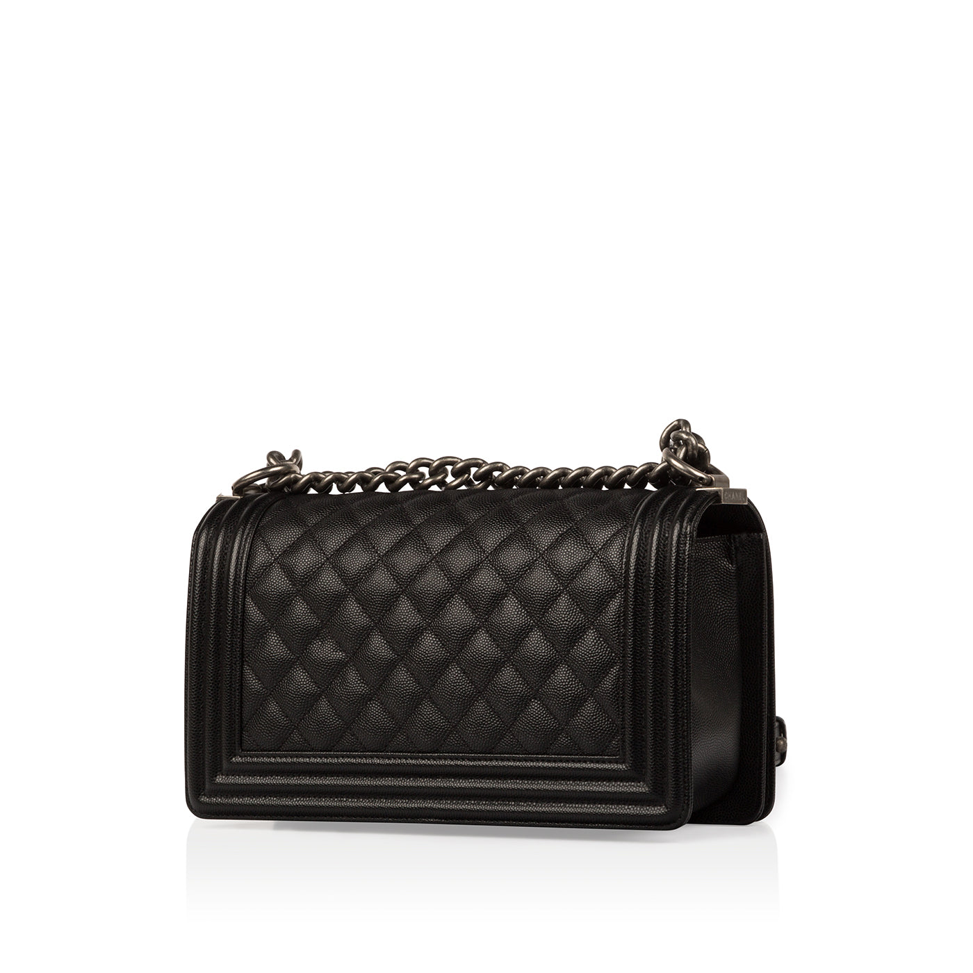 Chanel presents one of its highly-acclaimed and most sought after bags, the Chanel Boy Bag in Medium in the timeless combination of Black Caviar Leather and Ruthenium Hardware. As designed by Karl Lagerfeld, the Boy Bag collection was established to embody boyish charm and femininity. This magnificent handbag is crafted from quilted caviar leather. Its charm is only fortified through the delicate punctuation of ruthenium hardware from the chain-link strap to the signature CC push lock. Its interior features fabulous fabric lining and a single storage compartment, not to mention a subtle slip pocket.