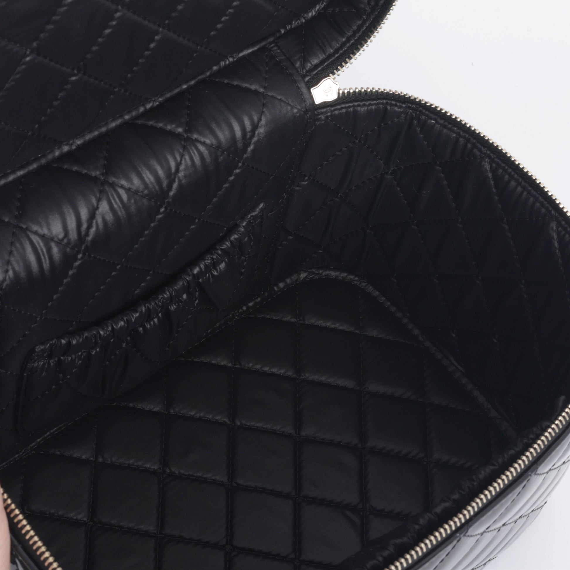 The Chanel Medium Vanity Case in Black Patent Leather combines functionality and luxury with its glossy finish and iconic interlocking CC logo, offering timeless sophistication. Compact and versatile, it's perfect for carrying essentials like makeup and accessories, making it an elegant choice for any occasion.