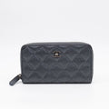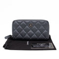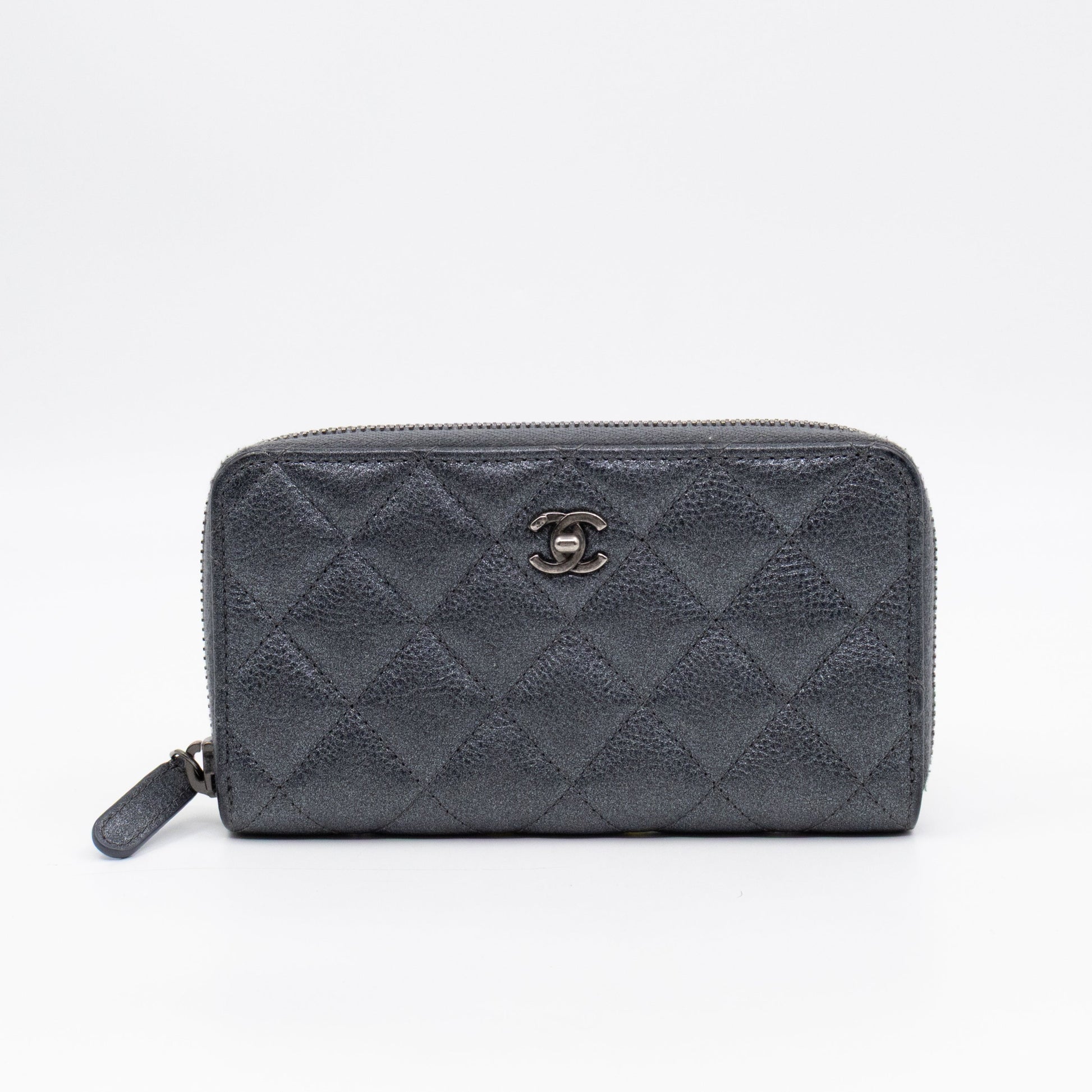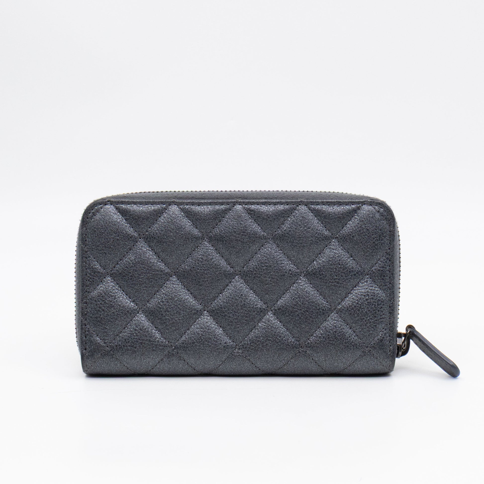 Stylish Chanel zip around wallet in medium size. Made with special dark grey metallic calfskin leather and ruthenium-tone hardware. Opens up to 2 card slots on both sides and zipper compartment in the middle, burgundy leather inside lining. Front has a CC turn-lock decoration. Great size for daily use.