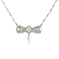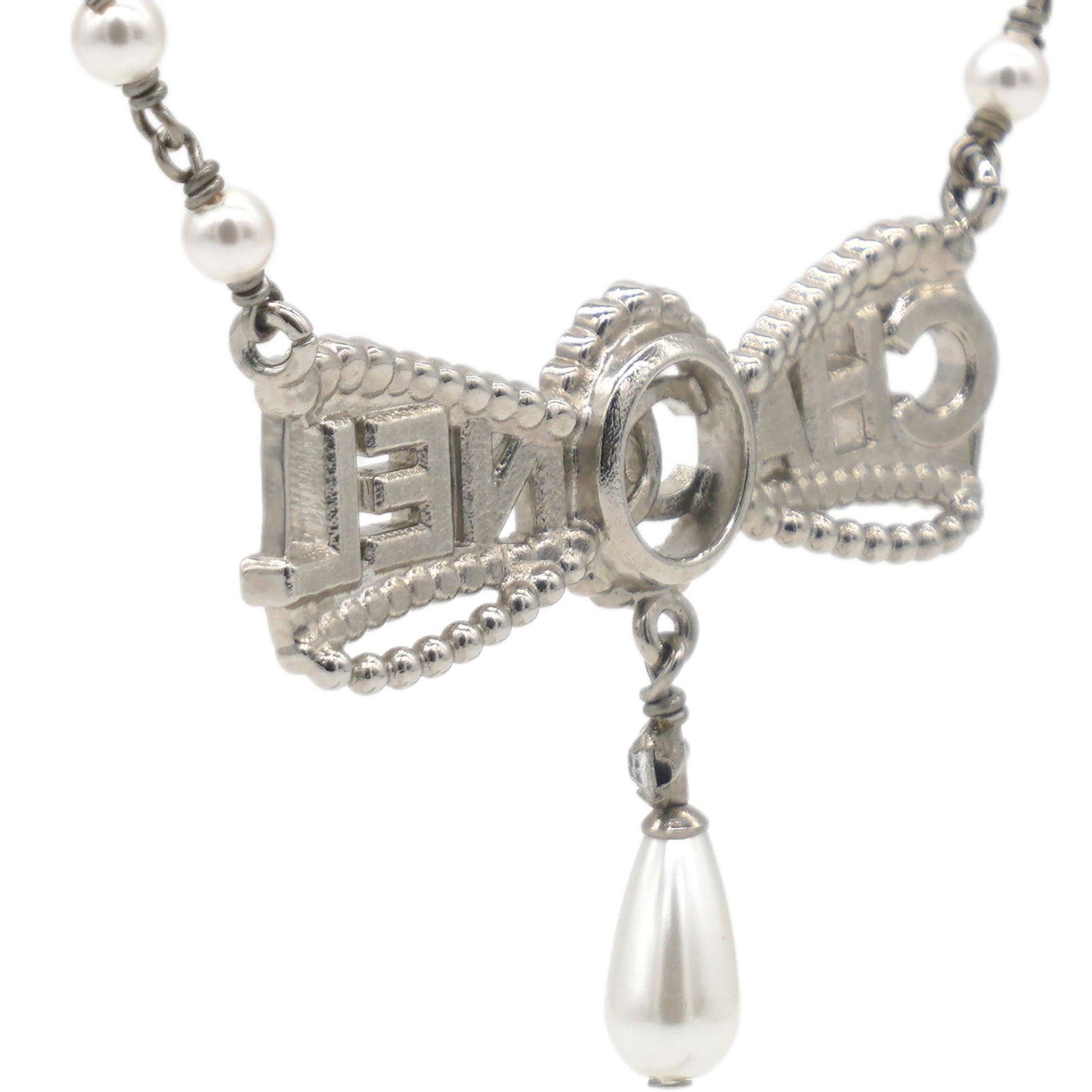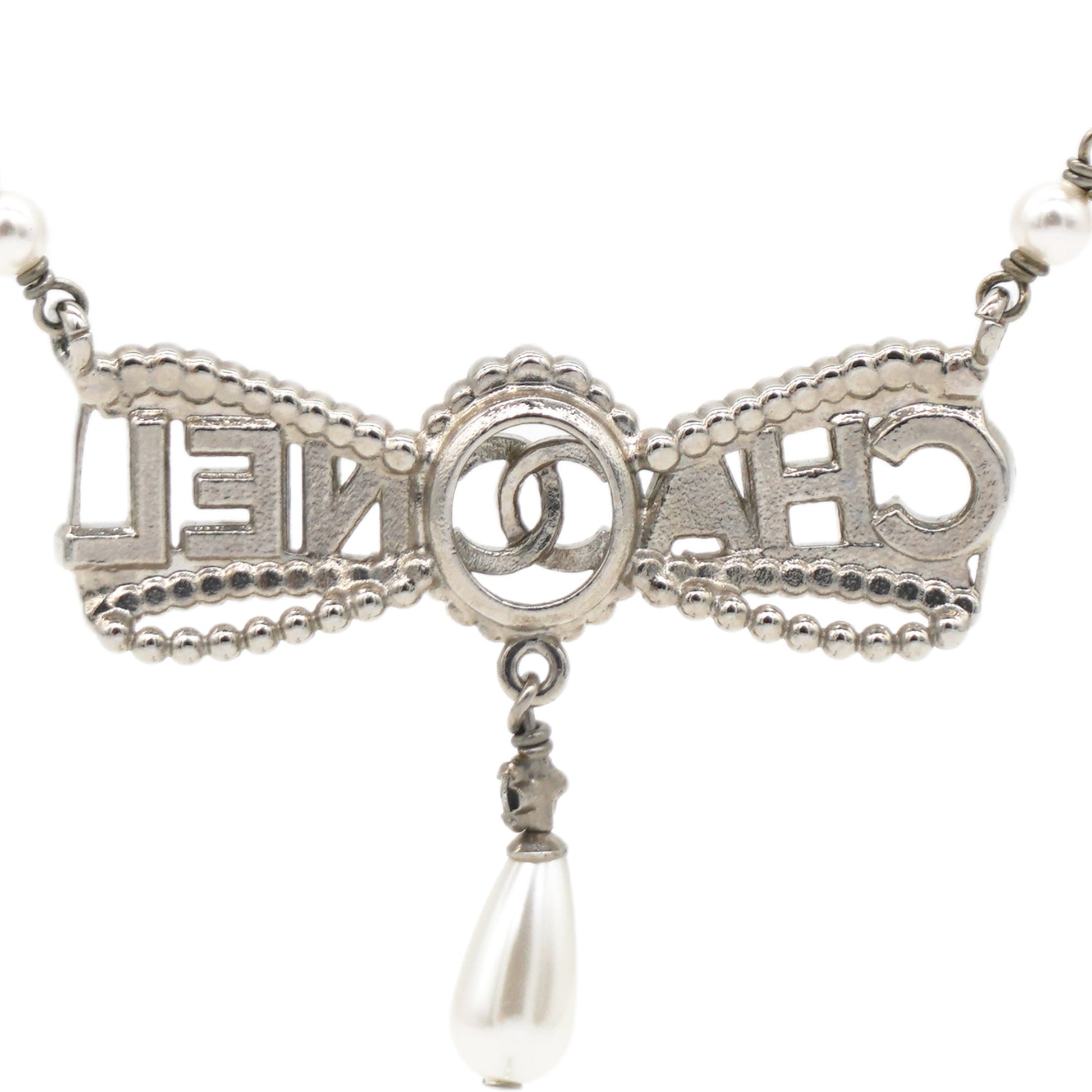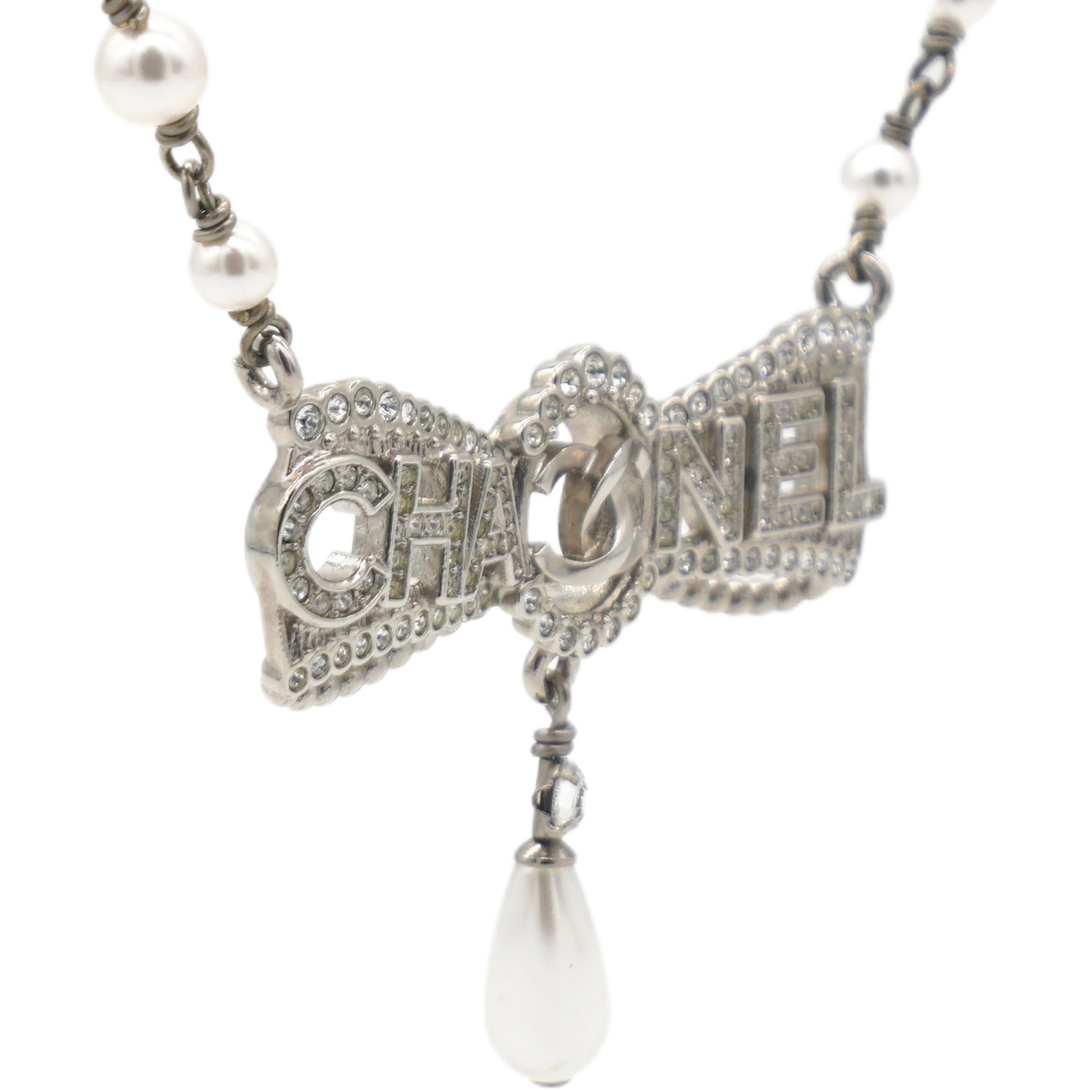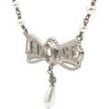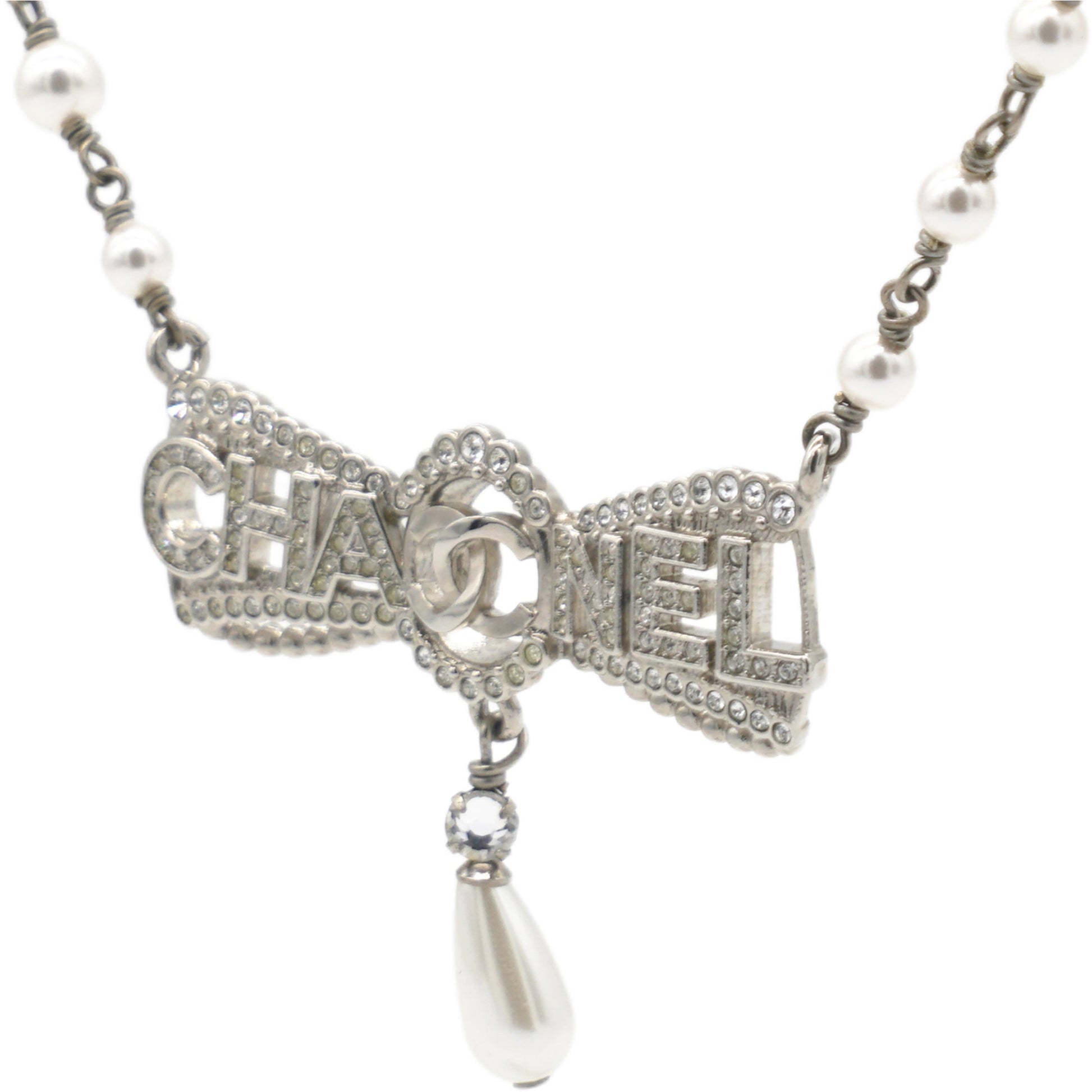 | This Chanel Bow Necklace features a design crafted from stainless steel, adorned with artificial pearls and rhinestones in clear and white tones. | Material: Metal?Pearl Measurement: Pendant:W 4.5 cm H 3.5 cm Accessories: Serial Number: A22 Production Year: 2022 | ![]() |
