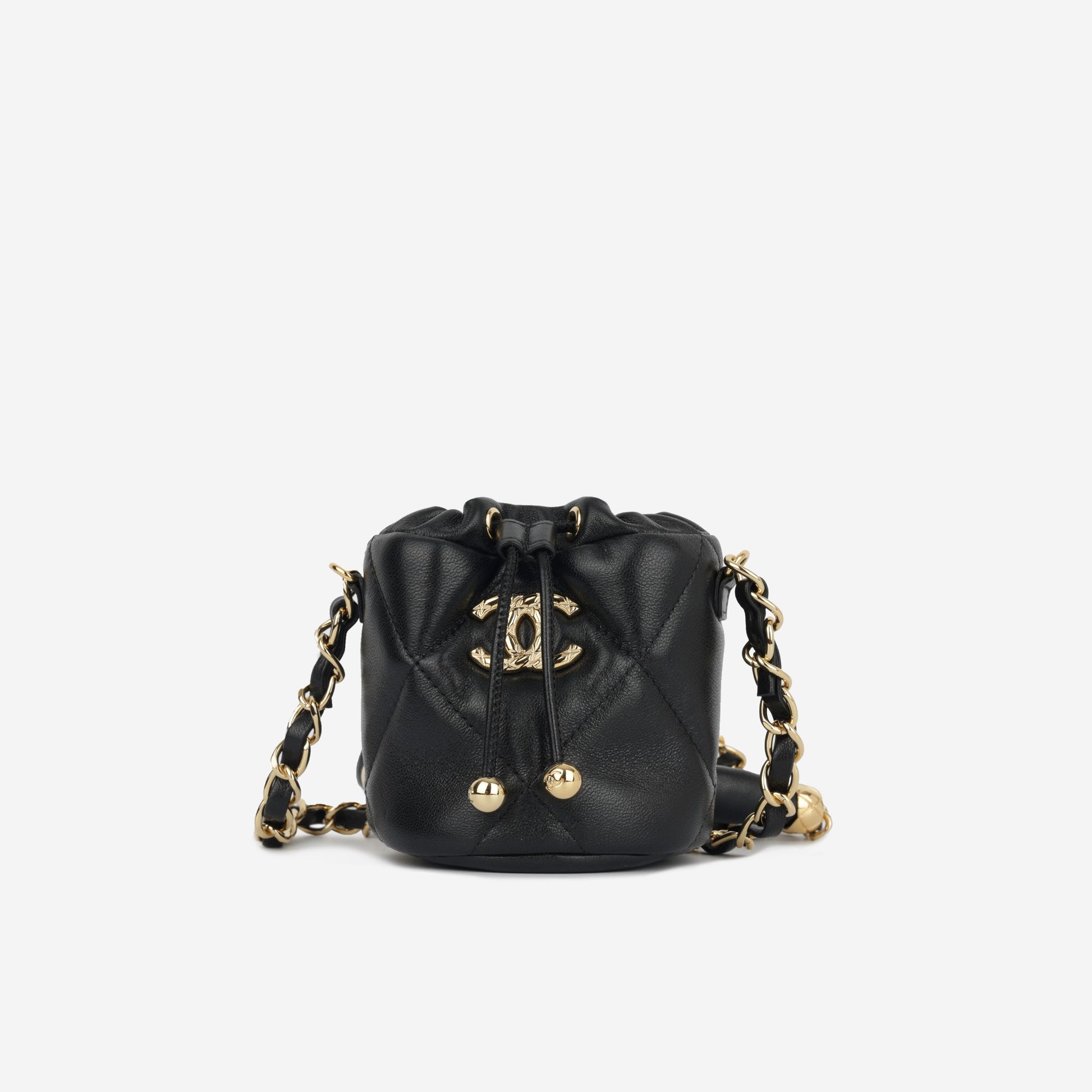 The Chanel Micro Bucket Bag on Chain is a stunning and modern interpretation of the classic vanity case, designed to hold your tiny beauty essentials and other small necessities. Evolving from its utilitarian origins, this petite bag has become a fashion statement, reflecting the latest trends in accessory fashion. Crafted from lambskin calfskin leather with champagne gold-tone hardware, this micro bucket bag is perfect for those who love unique and statement pieces