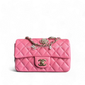 A stunning piece, the Chanel Mini Classic Flap Rectangle in pink quilted lambskin with golden hardware is a true gem. This Series 19 creation captures the essence of timeless elegance and sophistication. Rare and coveted, its Valentine edition makes it a unique find for collectors and fashion enthusiasts alike. Keywords: Chanel, Mini Classic Flap, Quilted Lambskin.