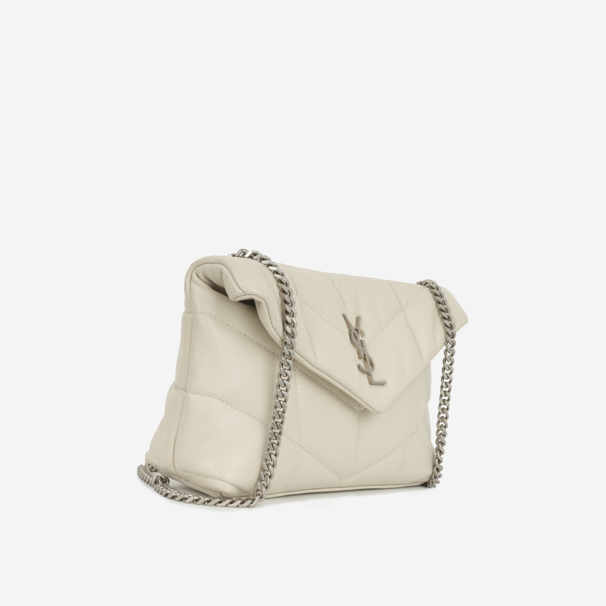 The Saint Laurent Mini Lou Puffer Bag is a sleek blend of Parisian chic and modern edge. Made from soft lambskin leather with signature chevron quilting, it features the iconic gold-tone YSL logo and a versatile sliding chain strap for shoulder or crossbody wear. A magnetic flap opens to a compact interior with a secure zip pocket, perfect for everyday essentials.