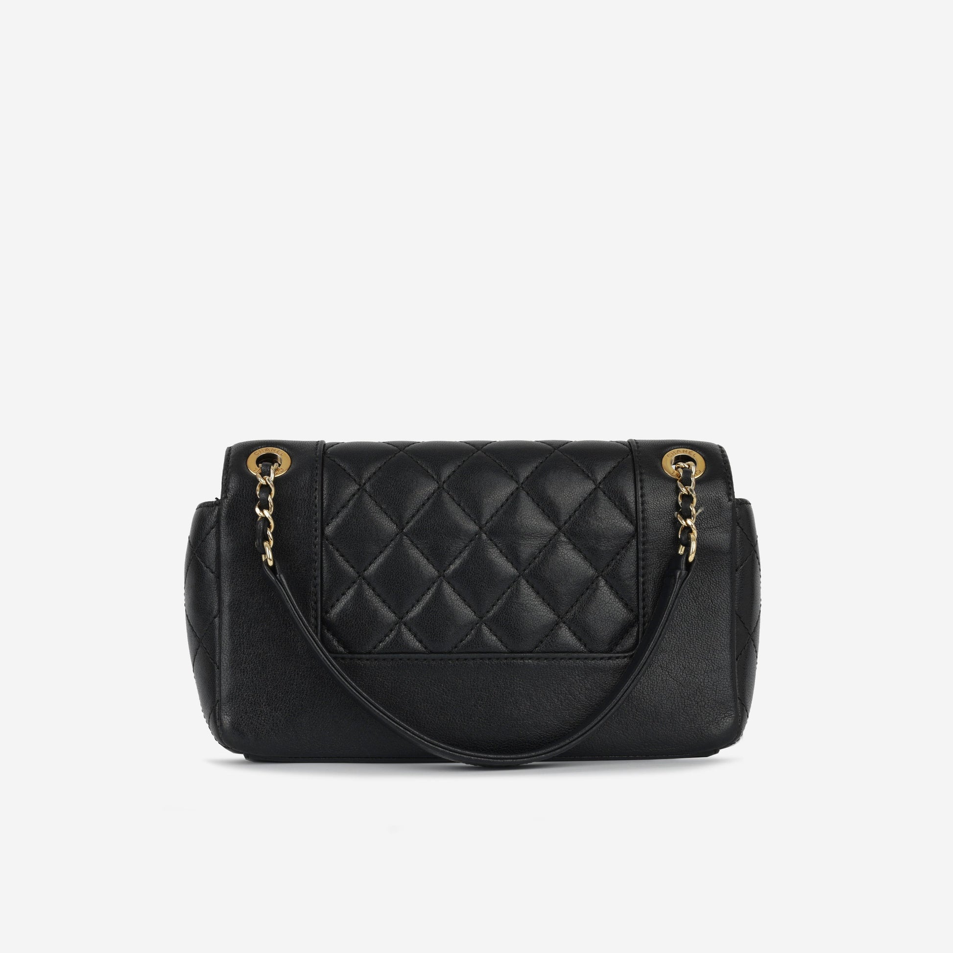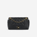 This flap bag from French fashion house Chanel is a rare find, having been shown at their runway collection for Paris in Rome. It features the signature quilted lambskin, contrasted against a smooth leather panel round the edges. In classic black it can be worn throughout the year, and the gold tone hardware is the iconic choice to make to stand out from the crowd.