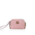 Pretty in pink! Gucci presents this stunning bag from their popular Marmont collection. Carefully crafted is soft pink matelassé leather, this little beauty is the perfect accessory for any modern woman with a fashion forward sense of style and love for luxury. This bag is the ideal for every day use, carry all your daily essentials inside the spacious interior while remaining sleek, stylish, and sophisticated. The Marmont took the It-Girls of the world by storm when the line was first released, still just as popular it's become an iconic collection for the brand. Pretty and stylish, but remains edgy and contemporary, the Marmont is a true must-have in any luxury handbag collection.