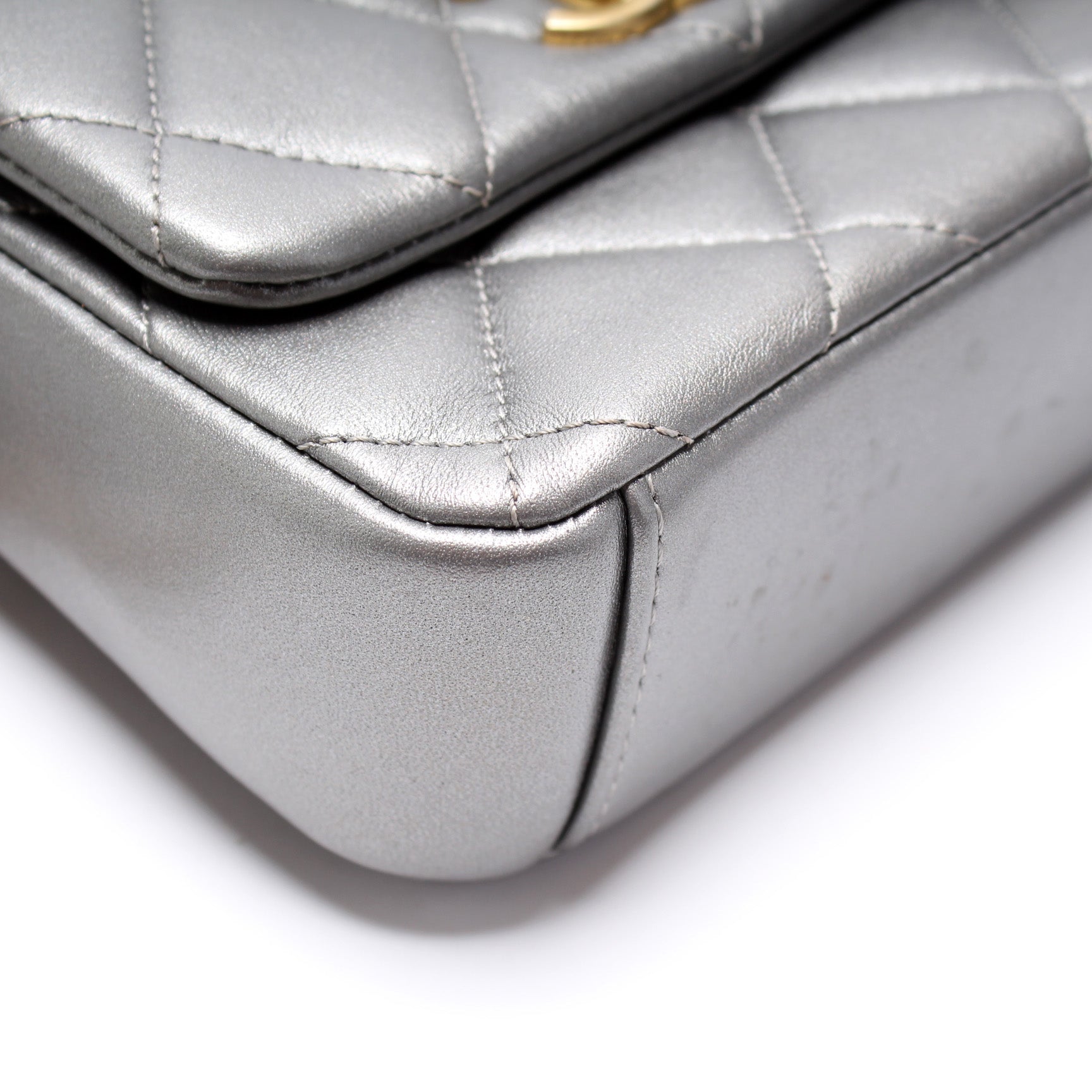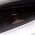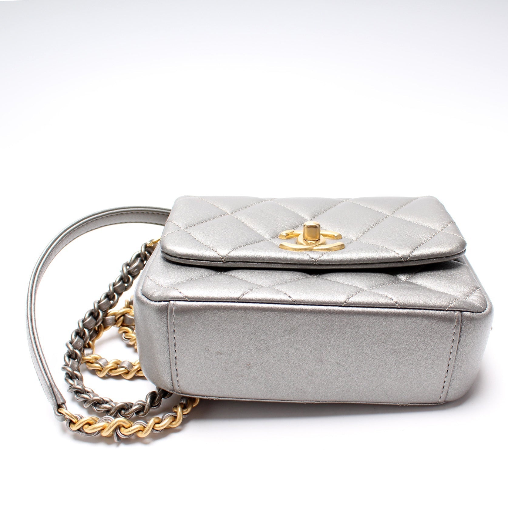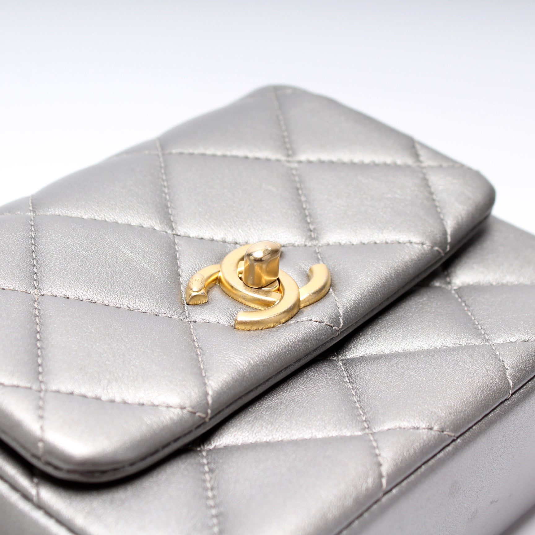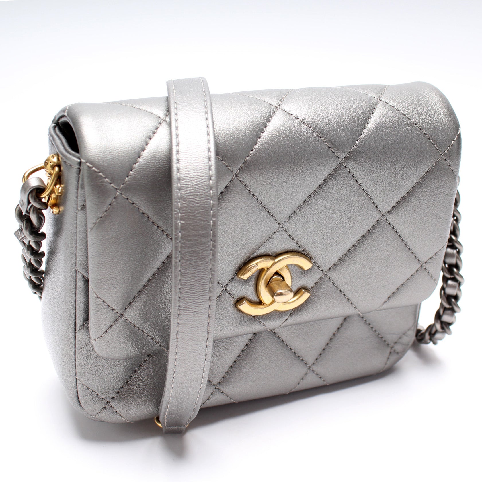 This Chanel Mini Side Note Mettalicis eye catching bag. The exterior is in the classic Chanel Lambskin leather.