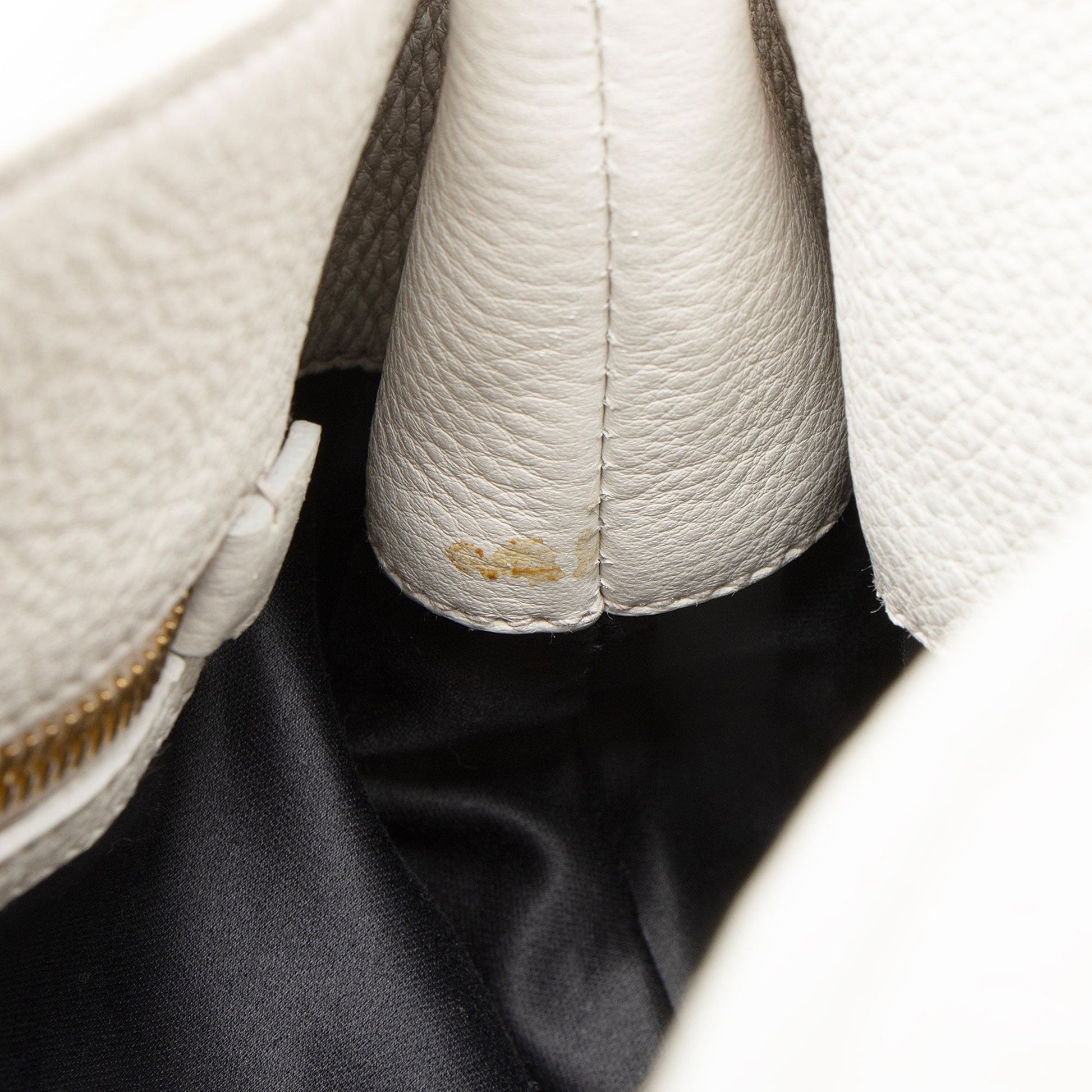 Condition Notes: Marks and wear to exterior bottom corners. Light creasing and minor darkening throughout exterior and handle. Minor cracking throughout handle casing. Surface scratches to hardware. Light marks throughout interior.