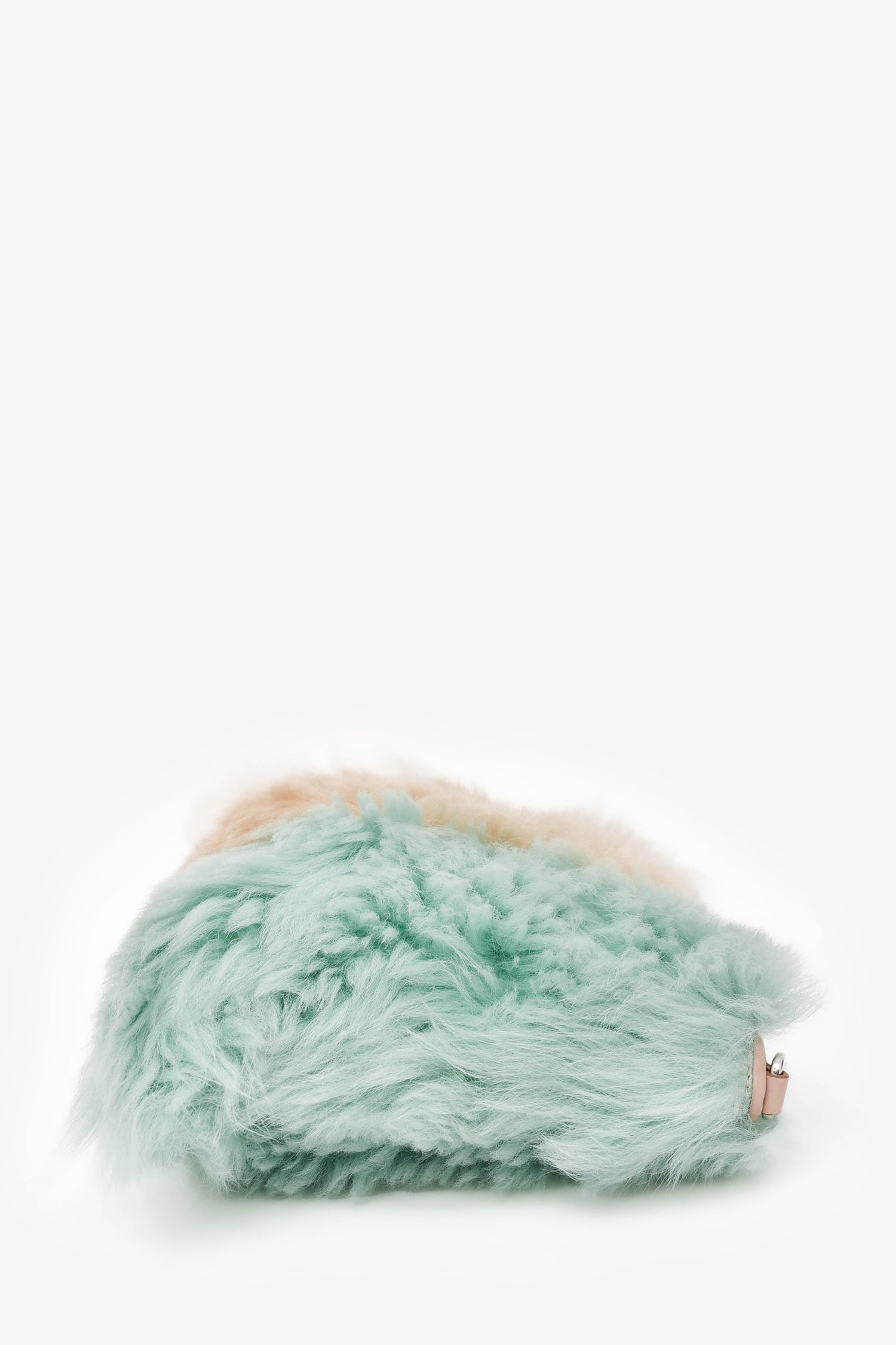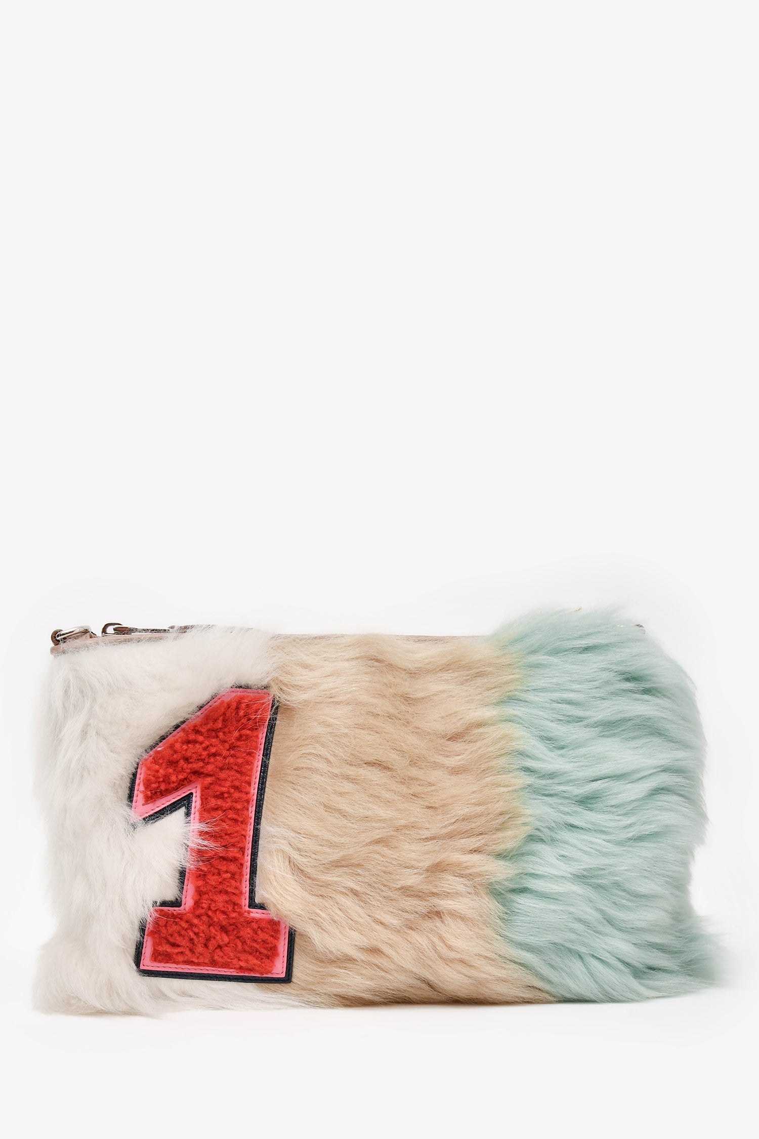 Miu Miu White/Beige/Green Sheep Fur "1" Patch Clutch. Top zipper closure. Interior pocket with zipper closure. Silver-tone hardware. Tonal stitching.