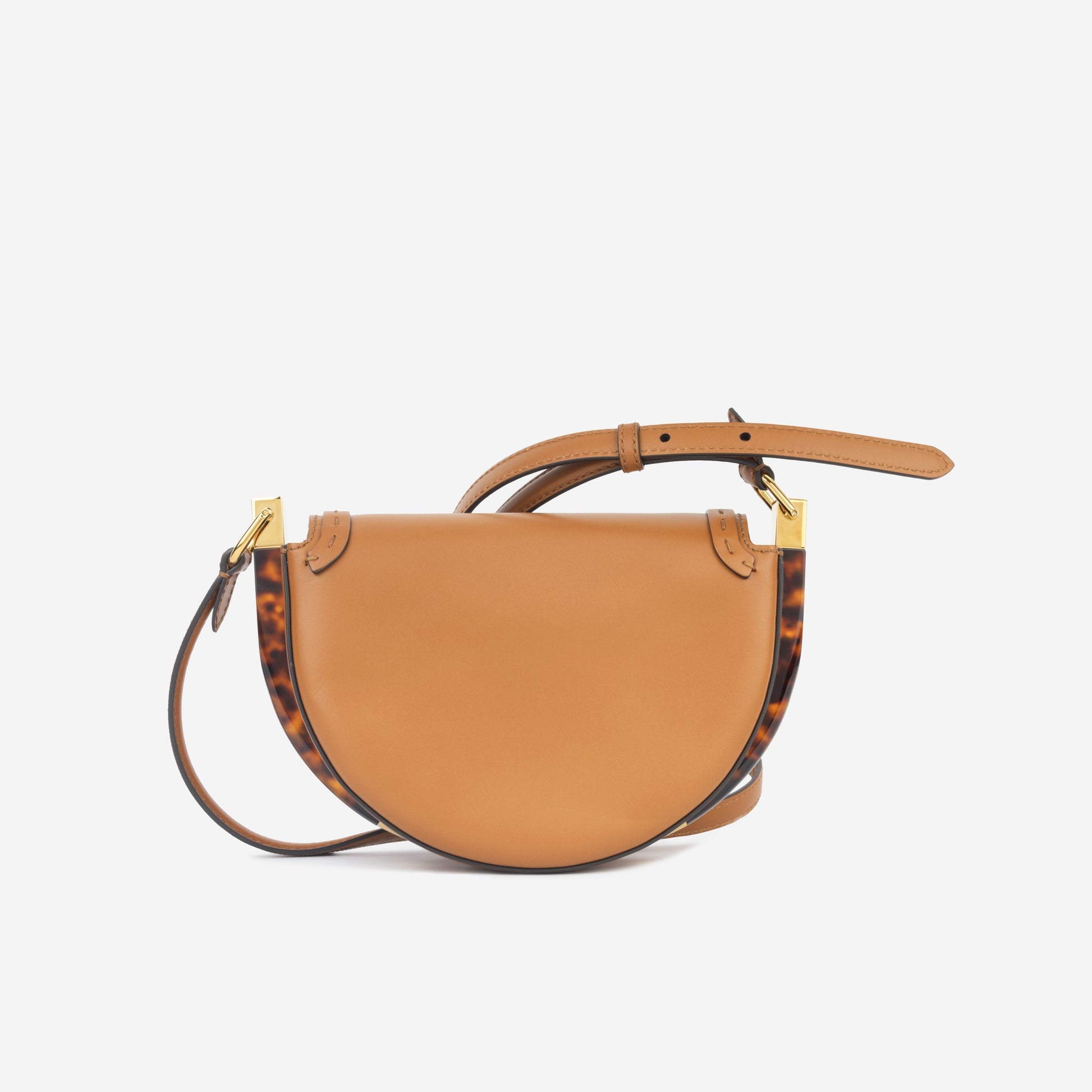 Introducing the FENDI Calfskin Plexiglass Moonlight Shoulder Bag in Tan calfskin a stylish and sophisticated addition to your collection. This flap bags crafted from smooth brown calfskin leather with meticulous stitched detailing, showcasing Fendi's commitment to quality craftsmanship. The bag is accentuated with resin tortoiseshell around the bag, adding a touch of glamour to the design. A brown leather shoulder strap provides versatile carrying options, while gold hardware enhances the overall luxurious aesthetic. The bold, embossed Fendi logo on the front is a statement of iconic style.