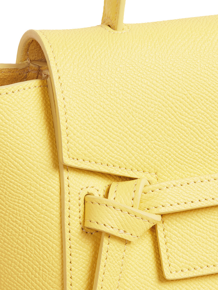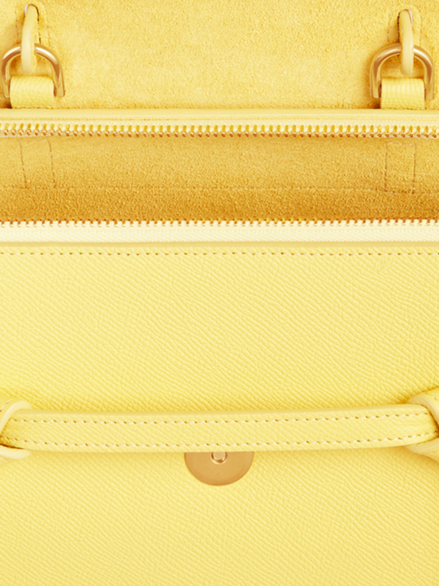 - Flap closure with hidden metallic piece and zipped closure under the flap