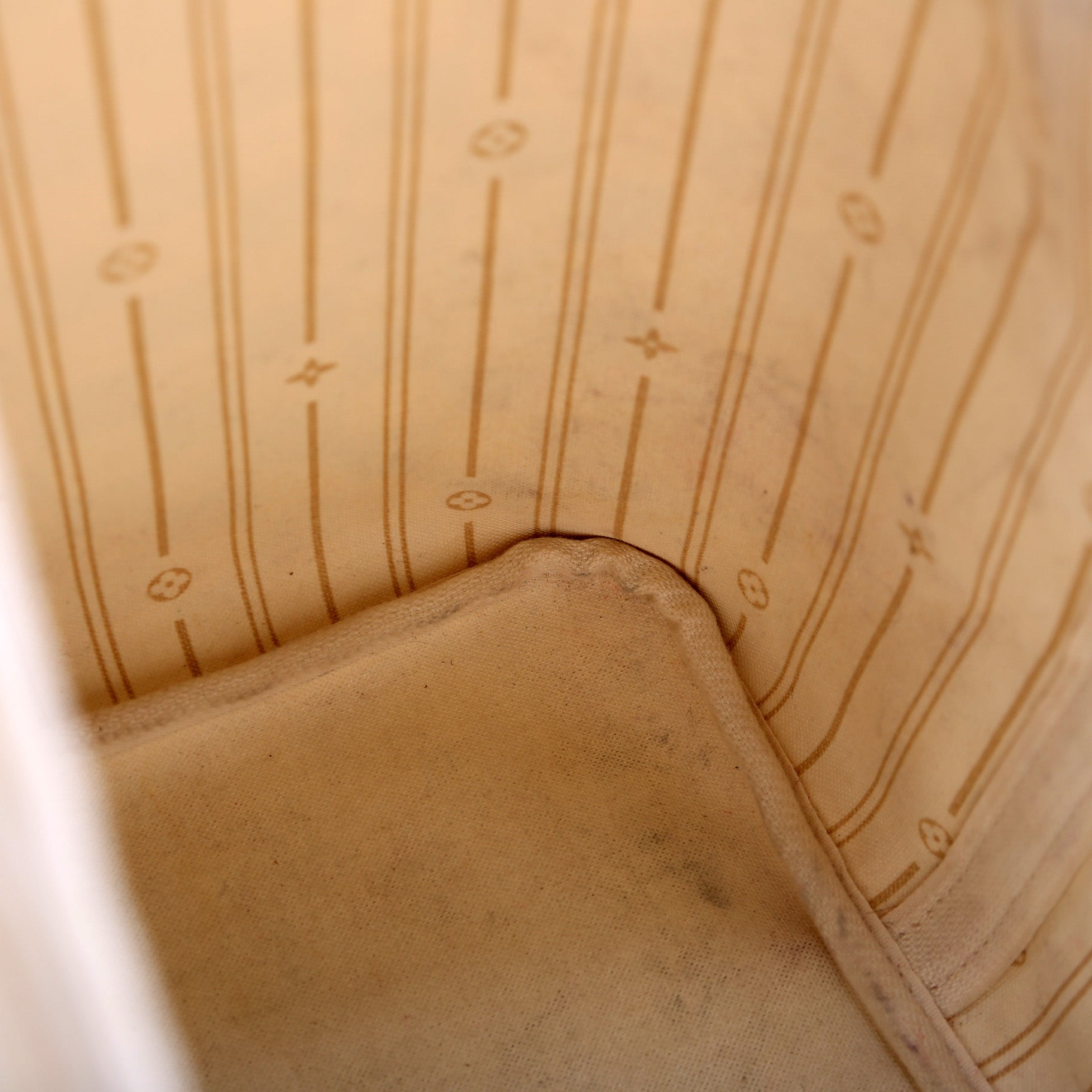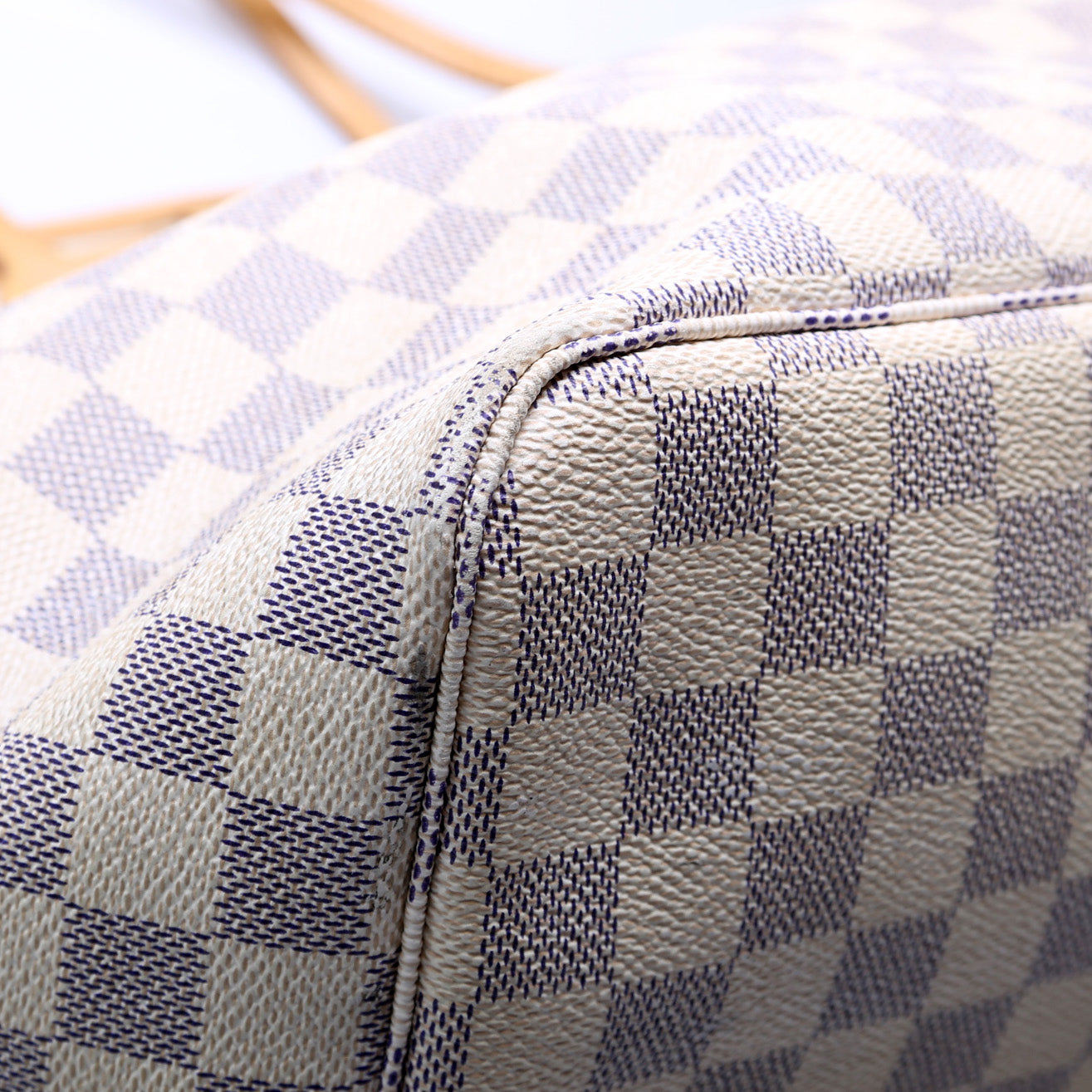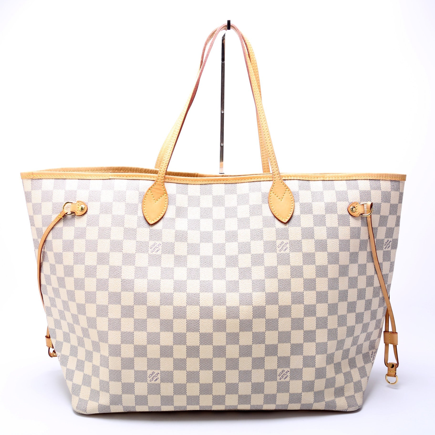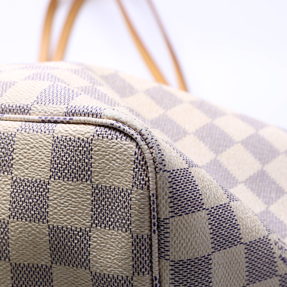 This Louis Vuitton Neverfull GMis eye catching bag. The exterior is in the classic Louis Vuitton Damier Azur coated canvas.