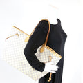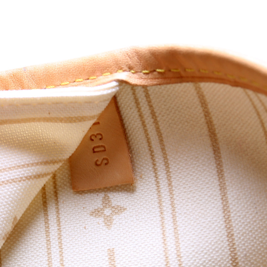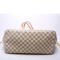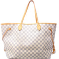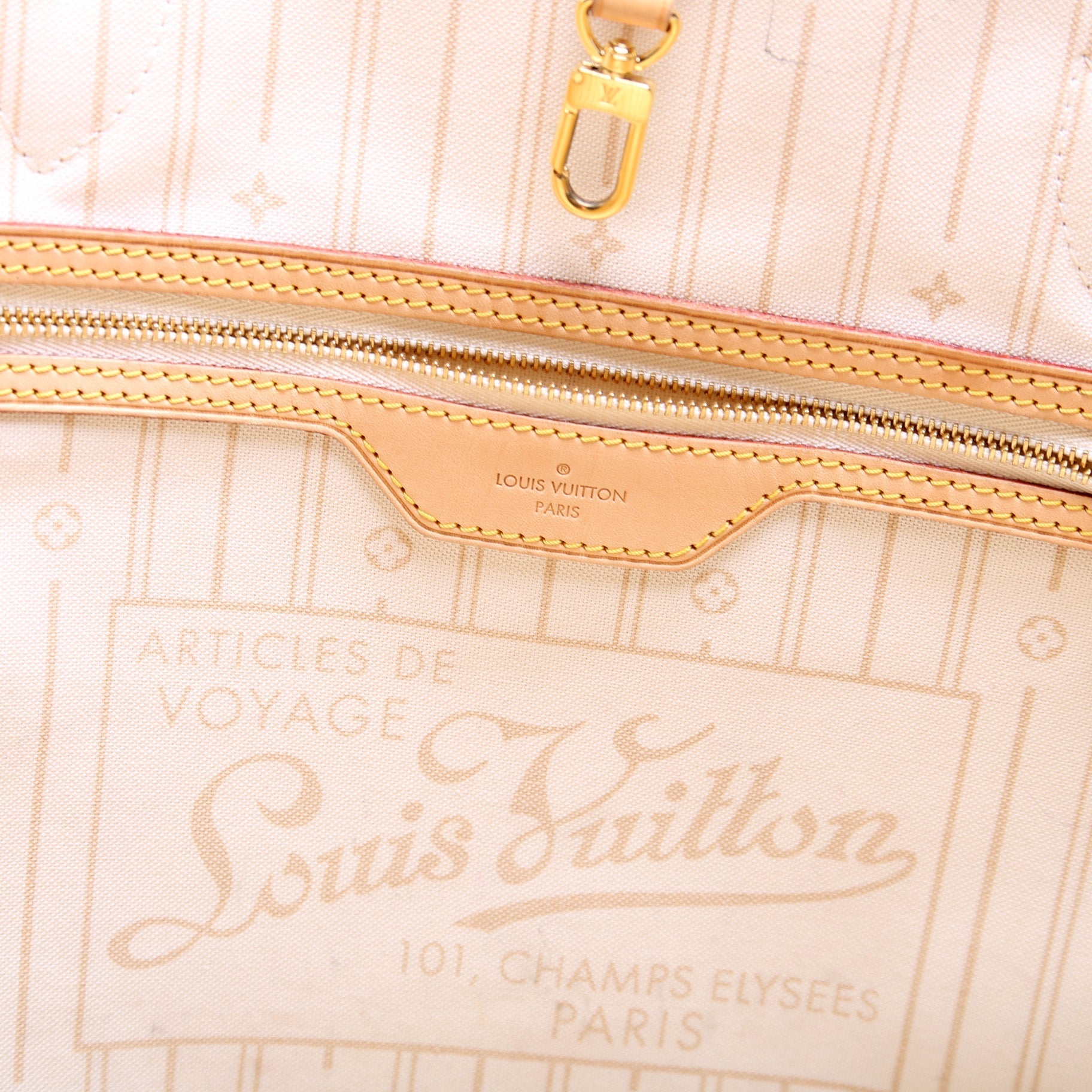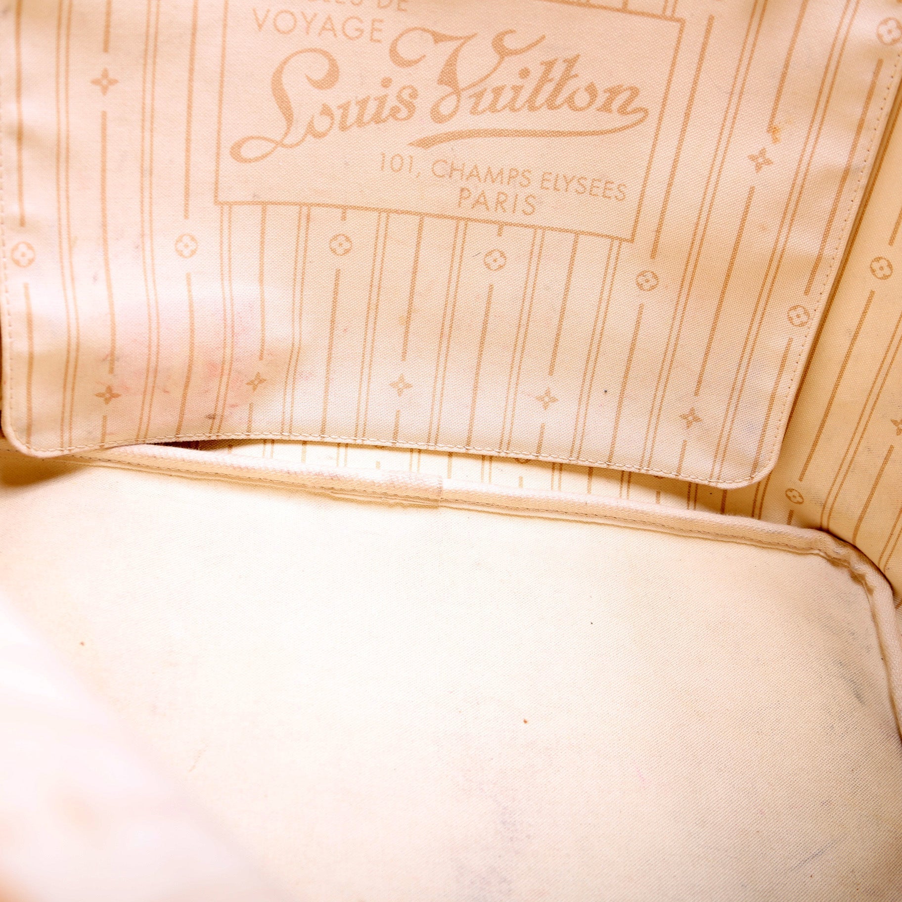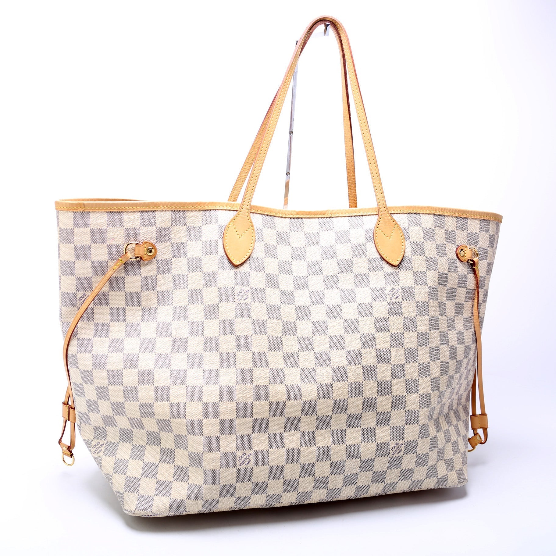 This Louis Vuitton Neverfull GMis eye catching bag. The exterior is in the classic Louis Vuitton Damier Azur coated canvas.