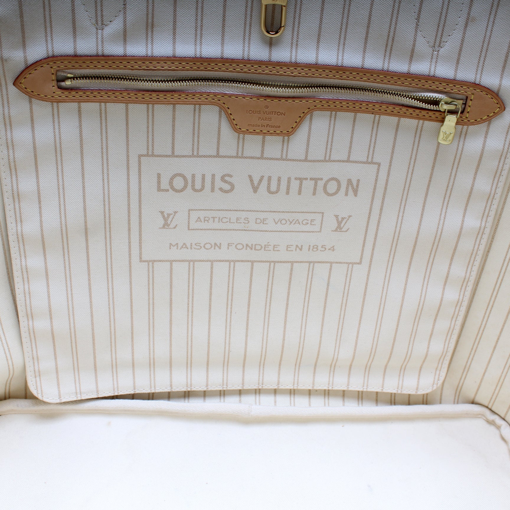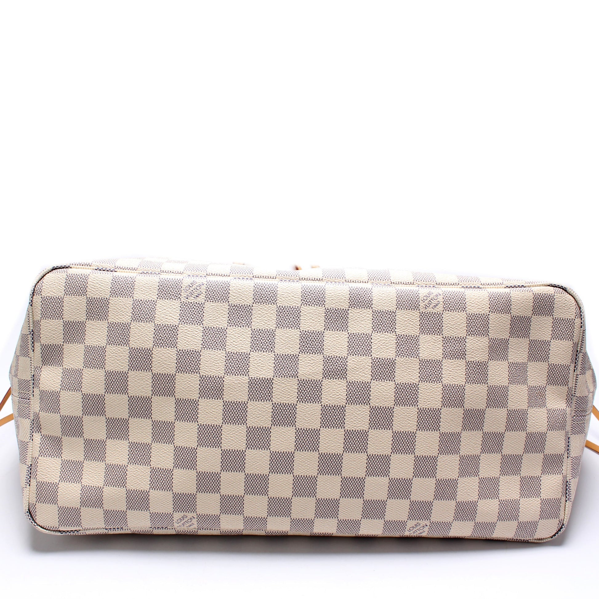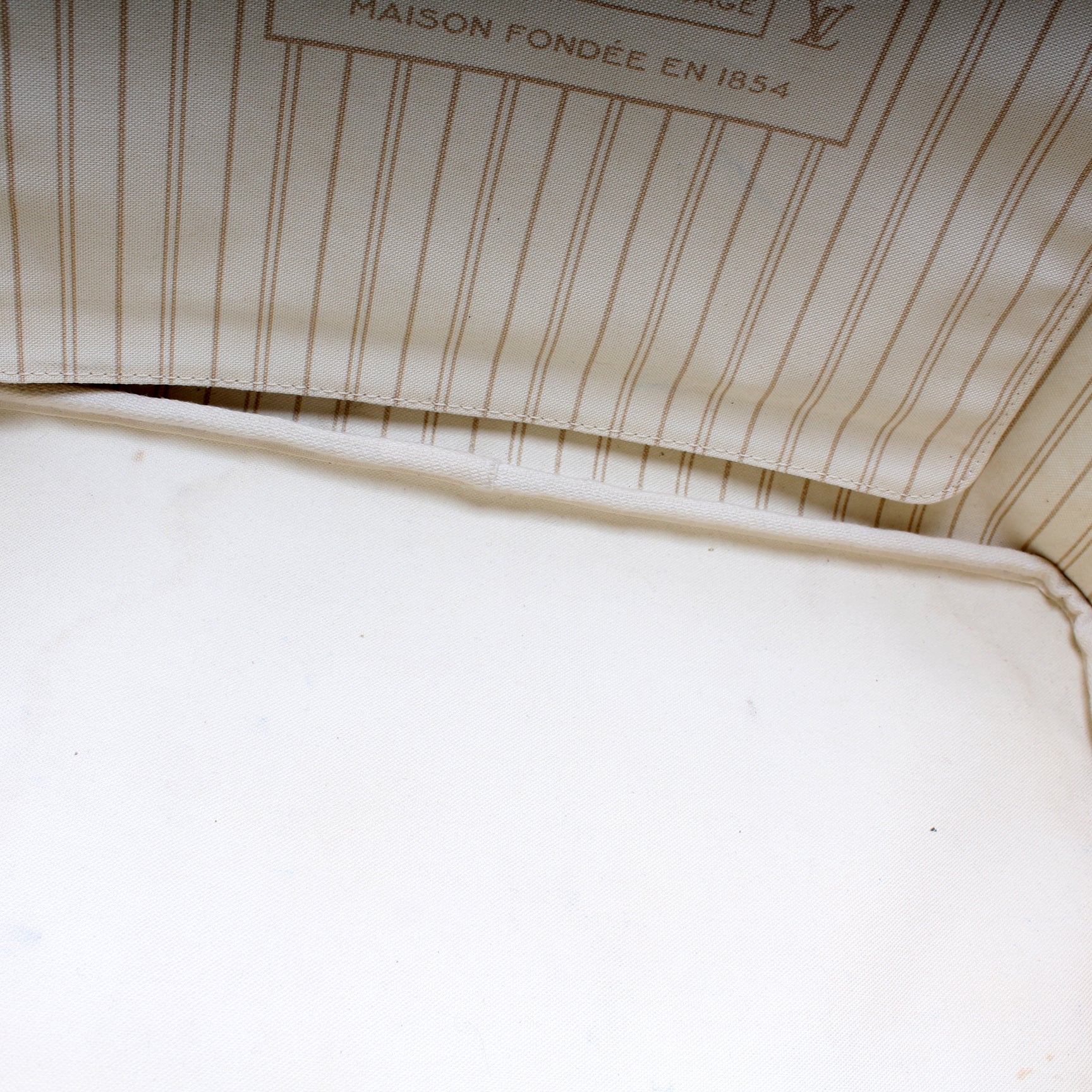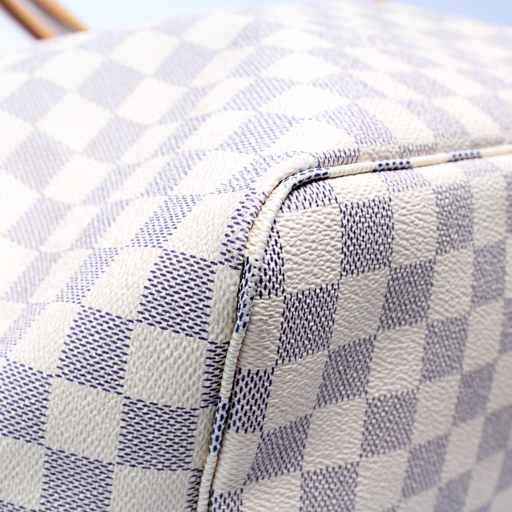 This Louis Vuitton Neverfull GMis eye catching bag. The exterior is in the classic Louis Vuitton Damier Azur coated canvas.