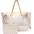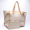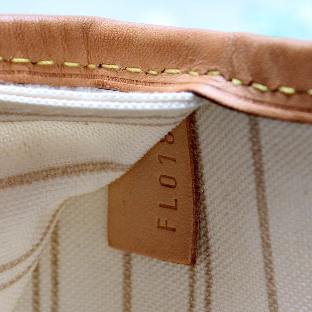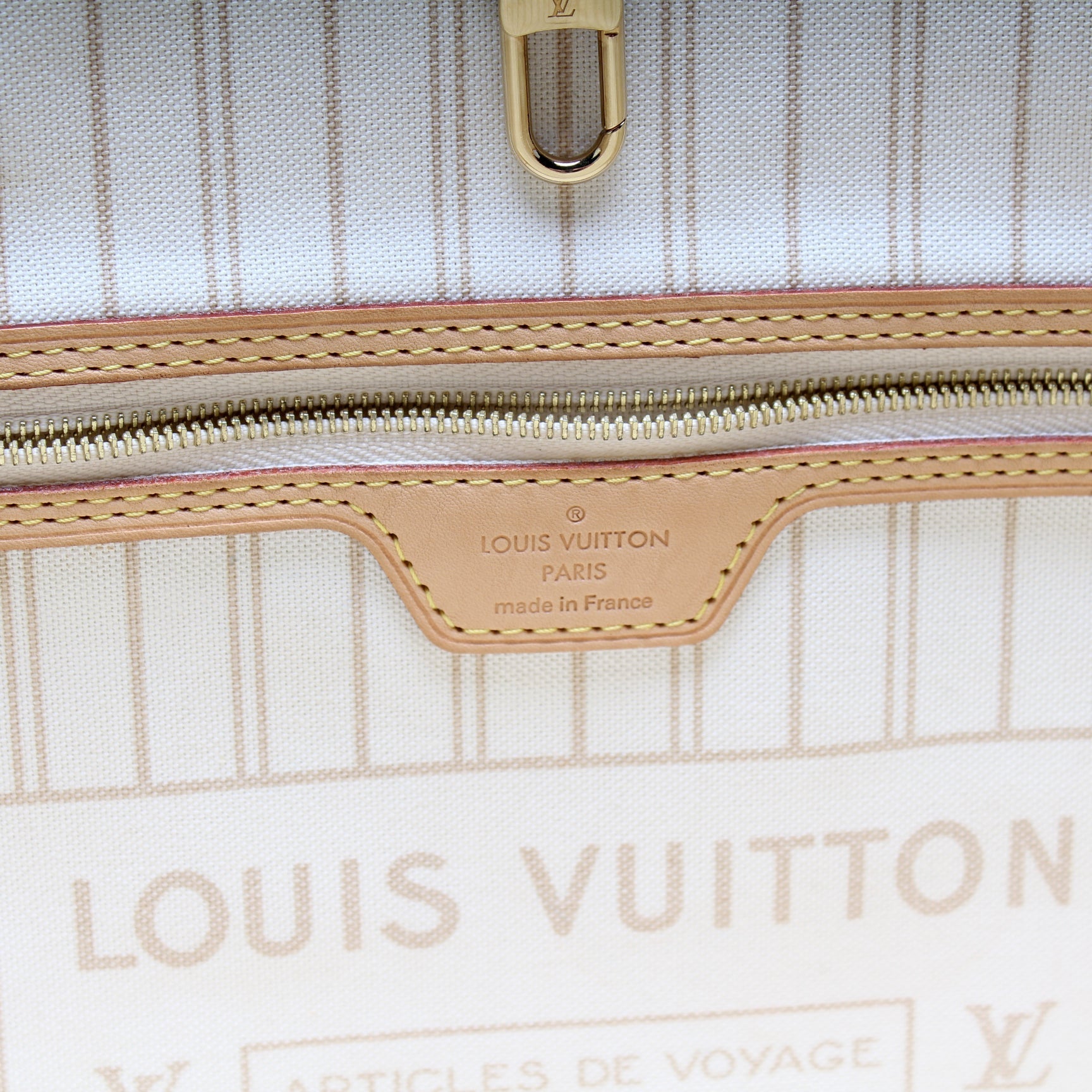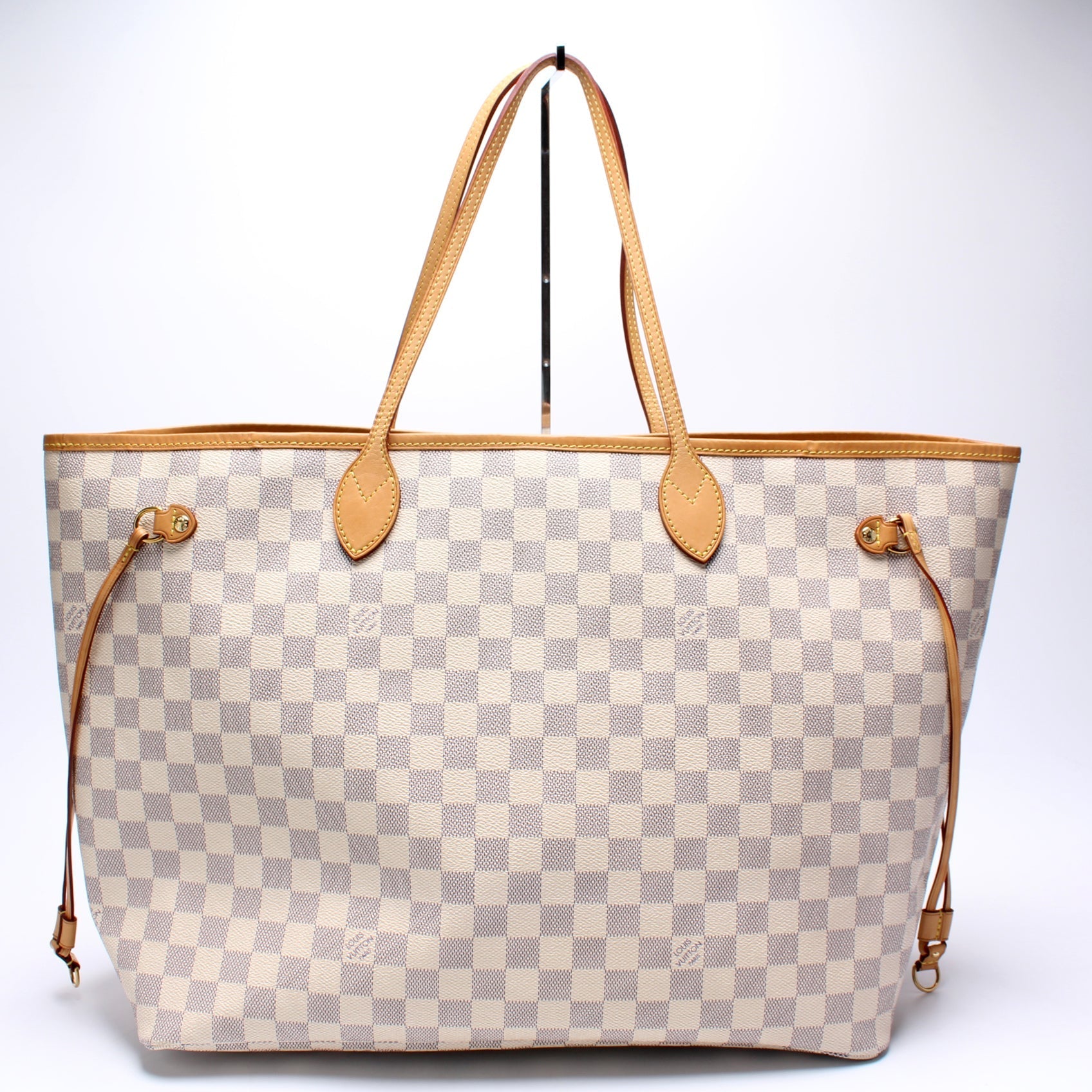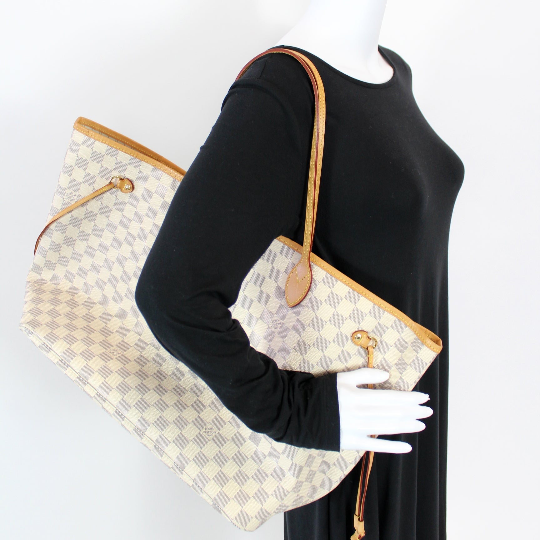 This Louis Vuitton Neverfull GMis eye catching bag. The exterior is in the classic Louis Vuitton Damier Azur coated canvas.