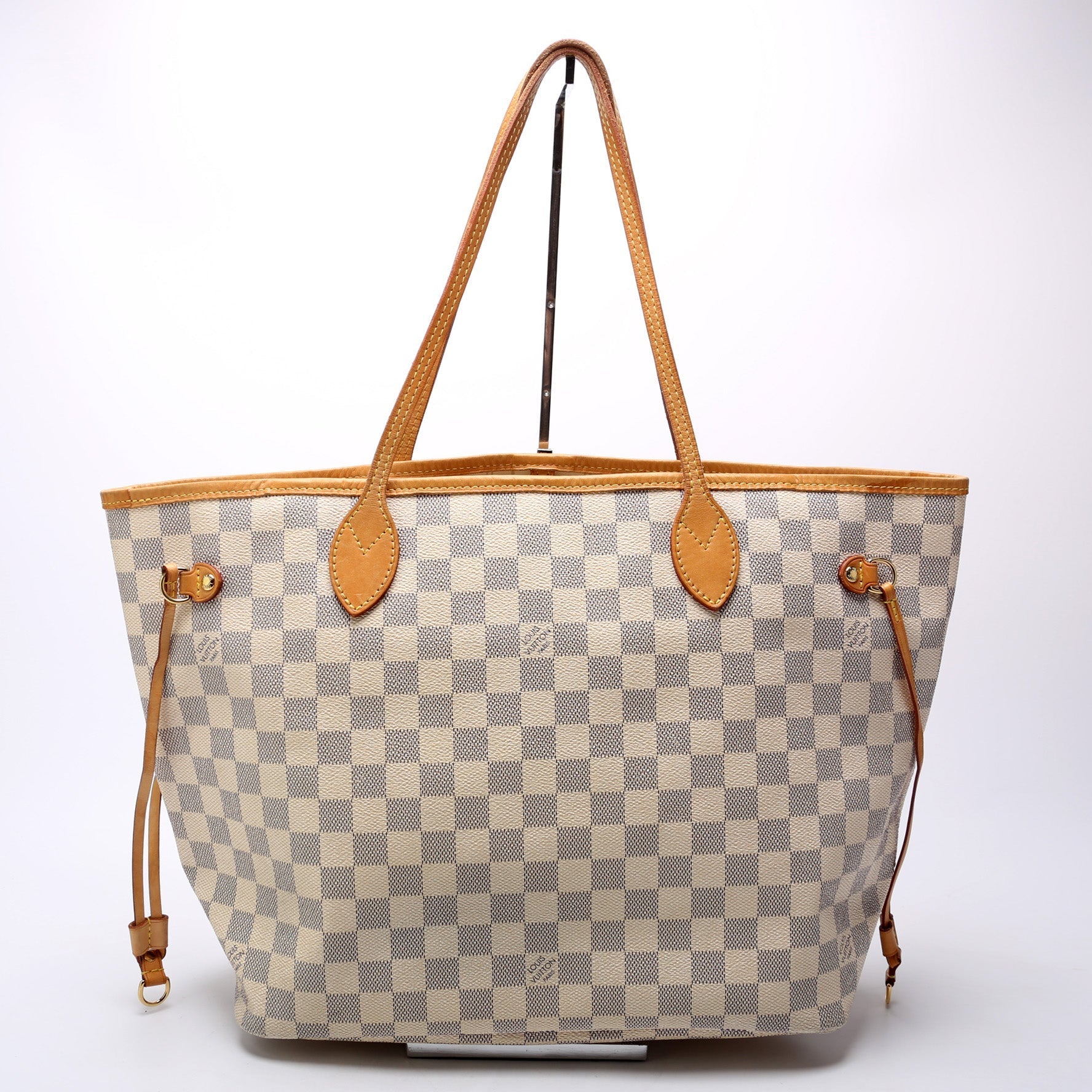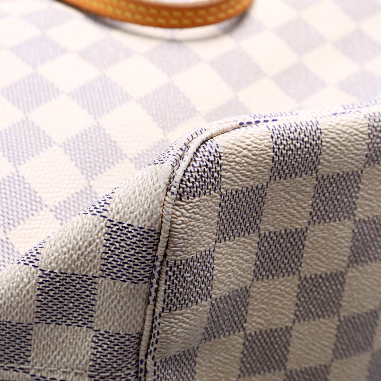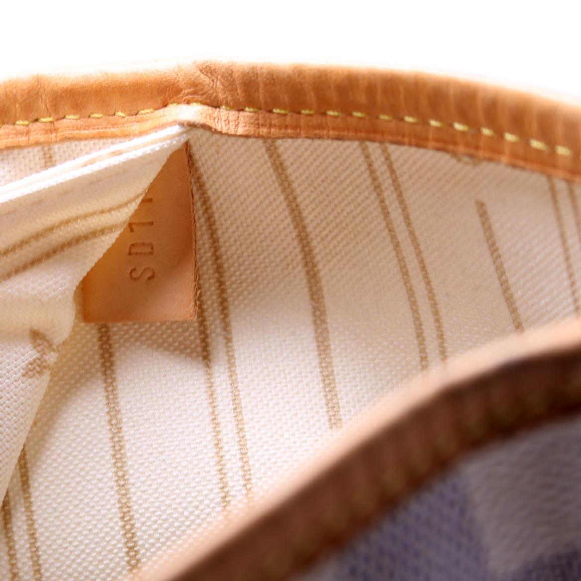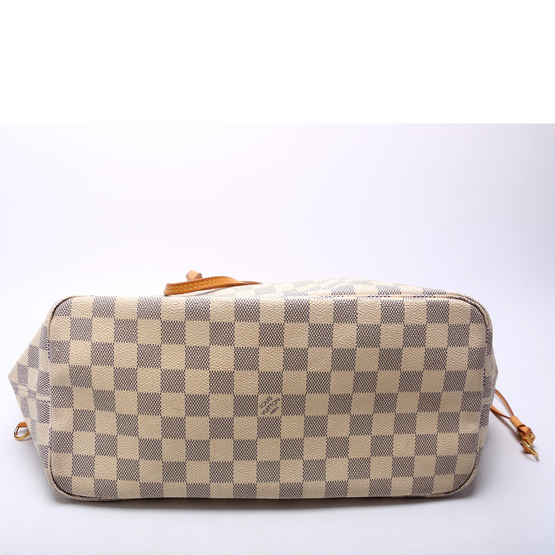 This Louis Vuitton Neverfull MMis eye catching bag. The exterior is in the classic Louis Vuitton Damier Azur coated canvas.